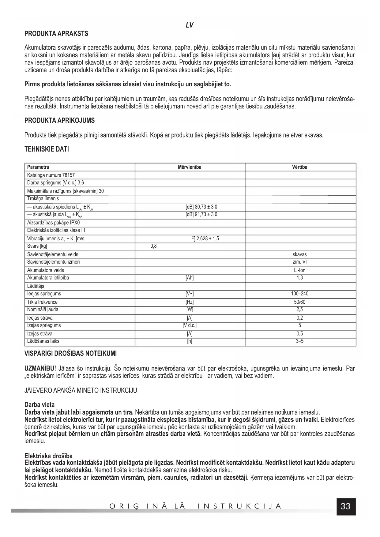 UZMANĪBU! Jālasa šo instrukciju. Šo noteikumu neievērošana var būt par elektrošoka, ugunsgrēka un ievainojuma iemeslu. Par „elektriskām ierīcēm” ir saprastas visas ierīces, kuras strādā ar elektrību - ar vadiem, vai bez vadiem. JĀIEVĒRO APAKŠĀ MINĒTO INSTRUKCIJU Darba vieta Darba vieta jābūt labi apgaismota un tīra. Nekārtība un tumšs apgaismojums var būt par nelaimes notikuma iemeslu. Nedrīkst lietot elektroierīci tur, kur ir paaugstināta eksplozijas bīstamība, kur ir degoši šķidrumi, gāzes un tvaiki. Elektroierīces ģenerē dzirksteles, kuras var būt par ugunsgrēka iemeslu pēc kontakta ar uzliesmojošiem gāzēm vai tvaikiem. Nedrīkst pieļaut bērniem un citām personām atrasties darba vietā. Koncentrācijas zaudēšana var būt par kontroles zaudēšanas iemeslu. Elektriska drošība Elektrības vada kontaktdakša jābūt pielāgota pie ligzdas. Nedrīkst modificēt kontaktdakšu. Nedrīkst lietot kaut kādu adapteru lai pielāgot kontaktdakšu. Nemodificēta kontaktdakša samazina elektrošoka risku. Nedrīkst kontaktēties ar iezemētām virsmām, piem. caurules, radiatori un dzesētāji. Ķermeņa iezemējums var būt par elektro- šoka iemeslu.LV