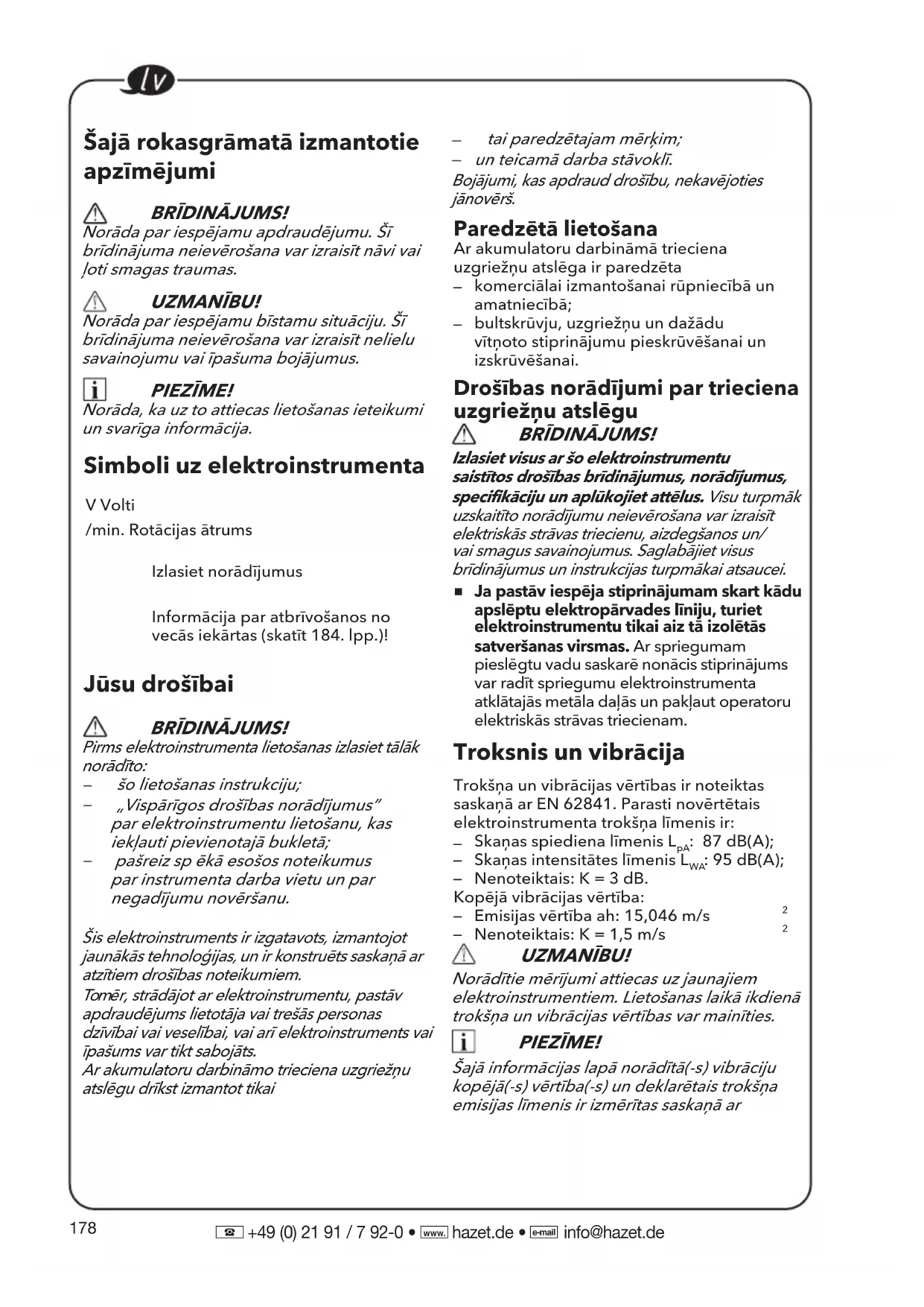 +49 (0) 21 91 / 7 92-0 • hazet.de • info@hazet.de Šajā rokasgrāmatā izmantotie apzīmējumi BRĪDINĀJUMS! Norāda par iespējamu apdraudējumu. Šī brīdinājuma neievērošana var izraisīt nāvi vai ļoti smagas traumas. UZMANĪBU! Norāda par iespējamu bīstamu situāciju. Šī brīdinājuma neievērošana var izraisīt nelielu savainojumu vai īpašuma bojājumus. PIEZĪME! Norāda, ka uz to attiecas lietošanas ieteikumi un svarīga informācija. Simboli uz elektroinstrumenta V Volti/min. Rotācijas ātrumsIzlasiet norādījumusInformācija par atbrīvošanos no vecās iekārtas (skatīt 184. lpp.)! Jūsu drošībai BRĪDINĀJUMS! Pirms elektroinstrumenta lietošanas izlasiet tālāk norādīto: šo lietošanas instrukciju; „Vispārīgos drošības norādījumus” par elektroinstrumentu lietošanu, kas iekļauti pievienotajā bukletā; pašreiz sp ēkā esošos noteikumus par instrumenta darba vietu un par negadījumu novēršanu. Šis elektroinstruments ir izgatavots, izmantojot jaunākās tehnoloģijas, un ir konstruēts saskaņā ar atzītiem drošības noteikumiem. Tomēr, strādājot ar elektroinstrumentu, pastāv apdraudējums lietotāja vai trešās personas dzīvībai vai veselībai, vai arī elektroinstruments vai īpašums var tikt sabojāts. Ar akumulatoru darbināmo trieciena uzgriežņu atslēgu drīkst izmantot tikai tai paredzētajam mērķim; un teicamā darba stāvoklī. Bojājumi, kas apdraud drošību, nekavējoties jānovērš. Paredzētā lietošana Ar akumulatoru darbināmā trieciena uzgriežņu atslēga ir paredzēta komerciālai izmantošanai rūpniecībā unamatniecībā; bultskrūvju, uzgriežņu un dažāduvītņoto stiprinājumu pieskrūvēšanai unizskrūvēšanai. Drošības norādījumi par trieciena uzgriežņu atslēgu BRĪDINĀJUMS! Izlasiet visus ar šo elektroinstrumentu saistītos drošības brīdinājumus, norādījumus, specifikāciju un aplūkojiet attēlus. Visu turpmāk uzskaitīto norādījumu neievērošana var izraisīt elektriskās strāvas triecienu, aizdegšanos un/ vai smagus savainojumus. Saglabājiet visus brīdinājumus un instrukcijas turpmākai atsaucei.