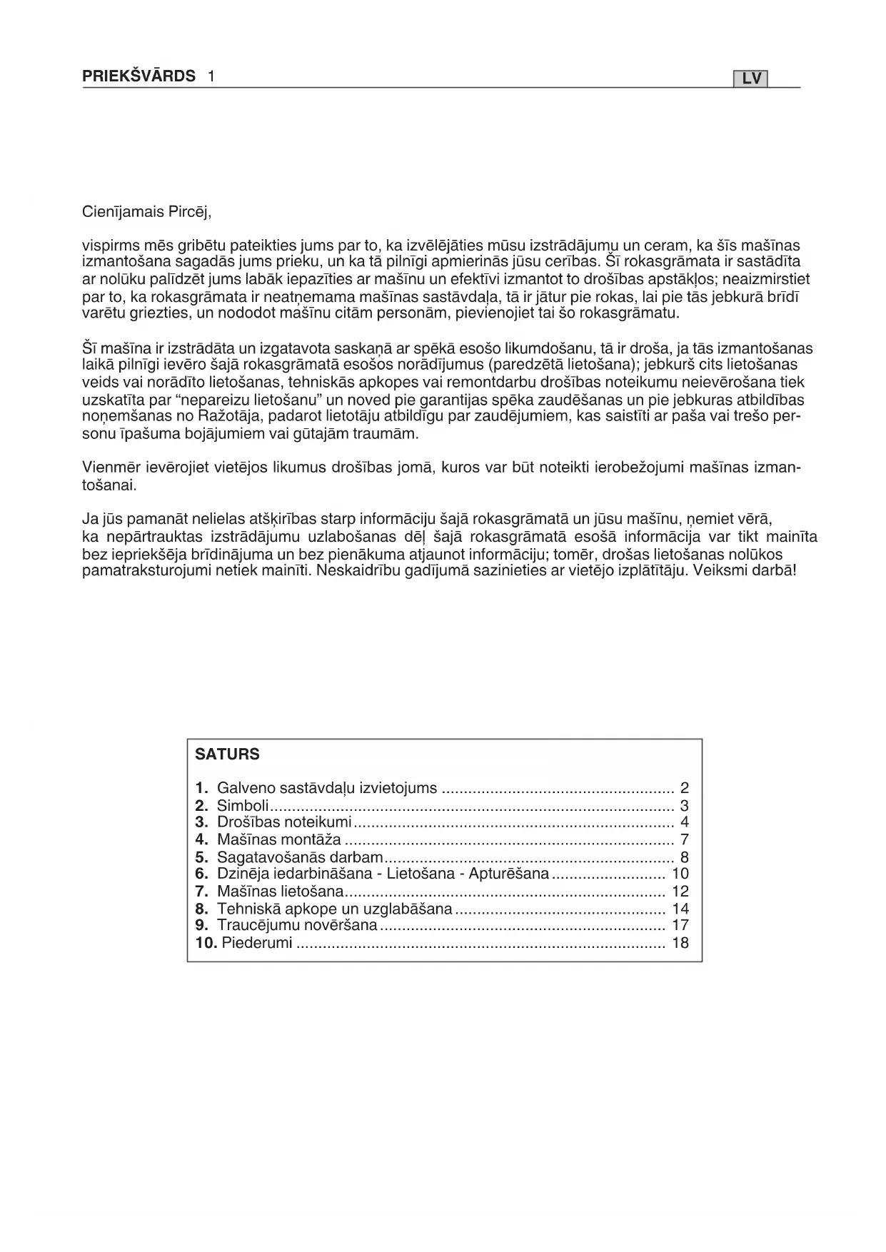 vispirms mēs gribētu pateikties jums par to, ka izvēlejāties mūsu izstrādājumu un ceram, ka šīs mašinas izmantošana sagadās jums prieku, un ka tā pilnīgi apmierinās jūsu ceribas. Šī rokasgrāmata ir sastādīta ar nolūku palidzēt jums labak iepazīties ar masīnu un efektīvi izmantot drošibas apstaklos; neaizmirstiet par to, ka rokasgrāmata ir neatŋemama masīnas sastāvda-la, tā ir jatur pie rokas, lai pie tās jebkura brīdī varētu griezties, un nododot masīnu citām personām, pievienojiet tai so rokasgrāmatu.