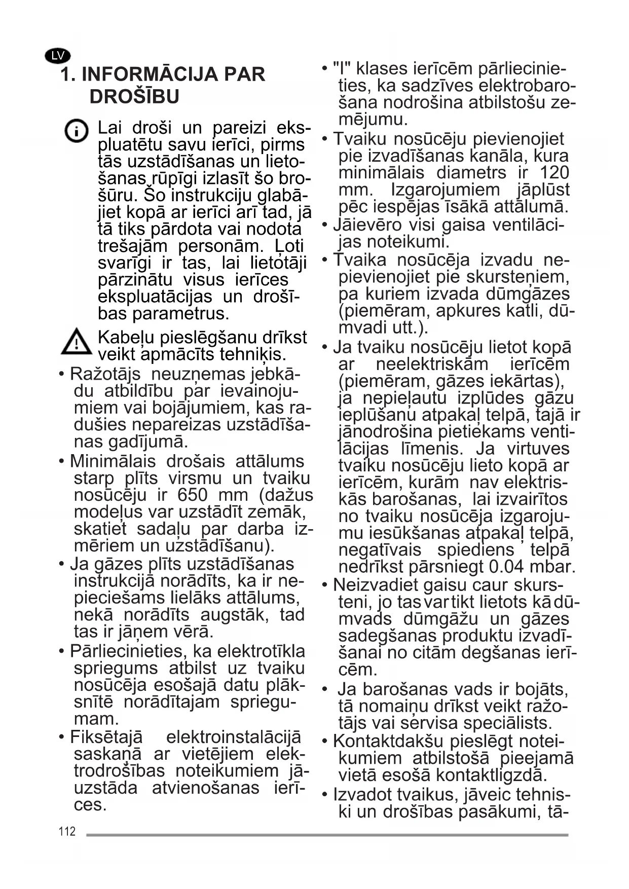 - Ja tvaiku nosūcēju lietot kopā ar neelektriskām ierīcēm (piemēram, gāzes iekārtas), ja nepieļautu izplūdes gāzu ieplūšanu atpakaļ telpā, tajā ir jānodrošina pietiekams venti- lācijas līmenis. Ja virtuves tvaiku nosūcēju lieto kopā ar ierīcēm, kurām nav elektris- kās barošanas, lai izvairītos no tvaiku nosūcēja izgaroju- mu iesūkšanas atpakaļ telpā, negatīvais spiediens telpā nedrīkst pārsniegt 0.04 mbar.