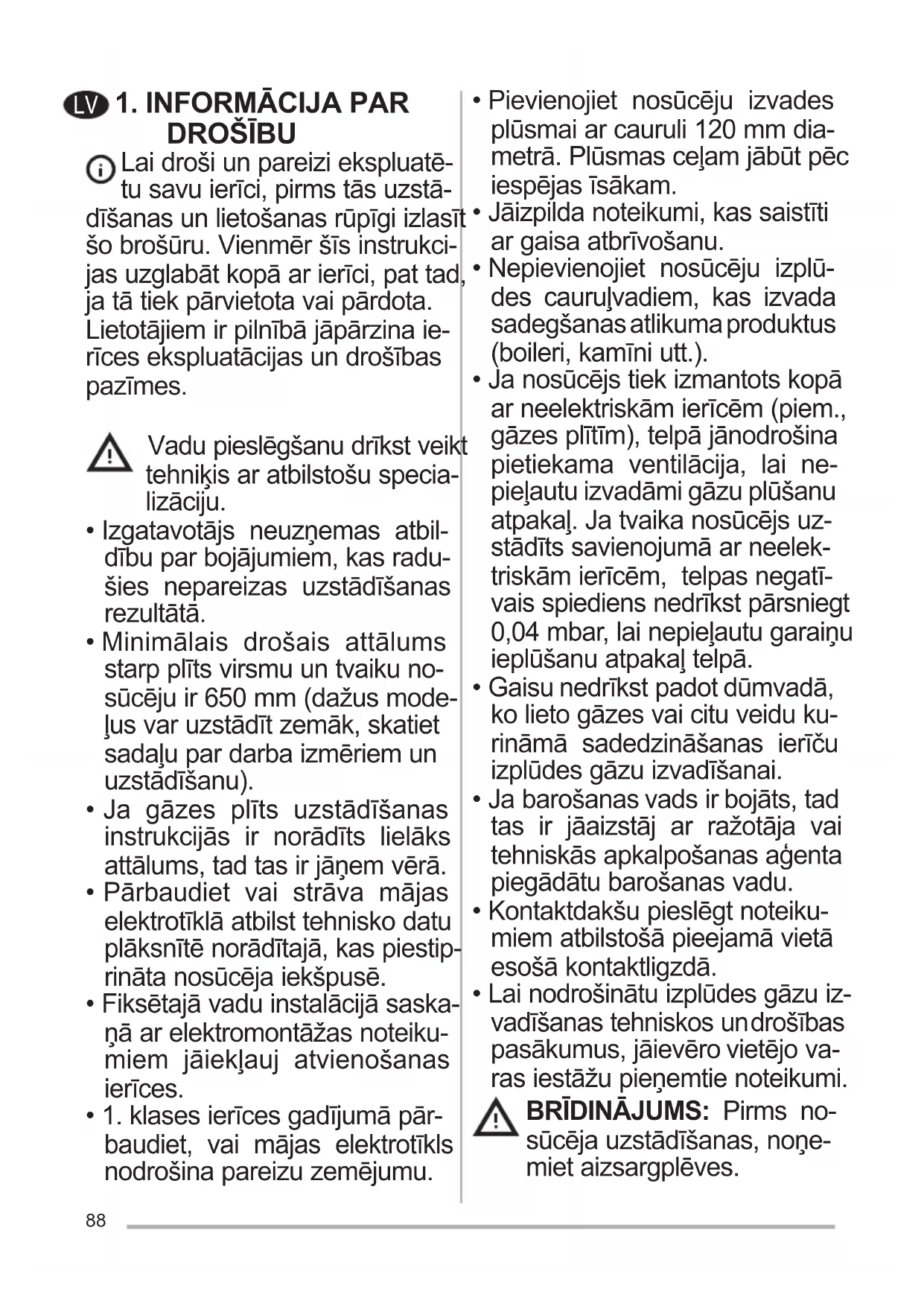 - Lai nodrošinātu izplūdes gāzu iz- vadīšanas tehniskos un drošības pasākumus, jāievēro vietējo va- ras iestāžu pieņemtie noteikumi. BRĪDINĀJUMS: Pirms no- sūcēja uzstādīšanas, noņe- miet aizsargplēves.89