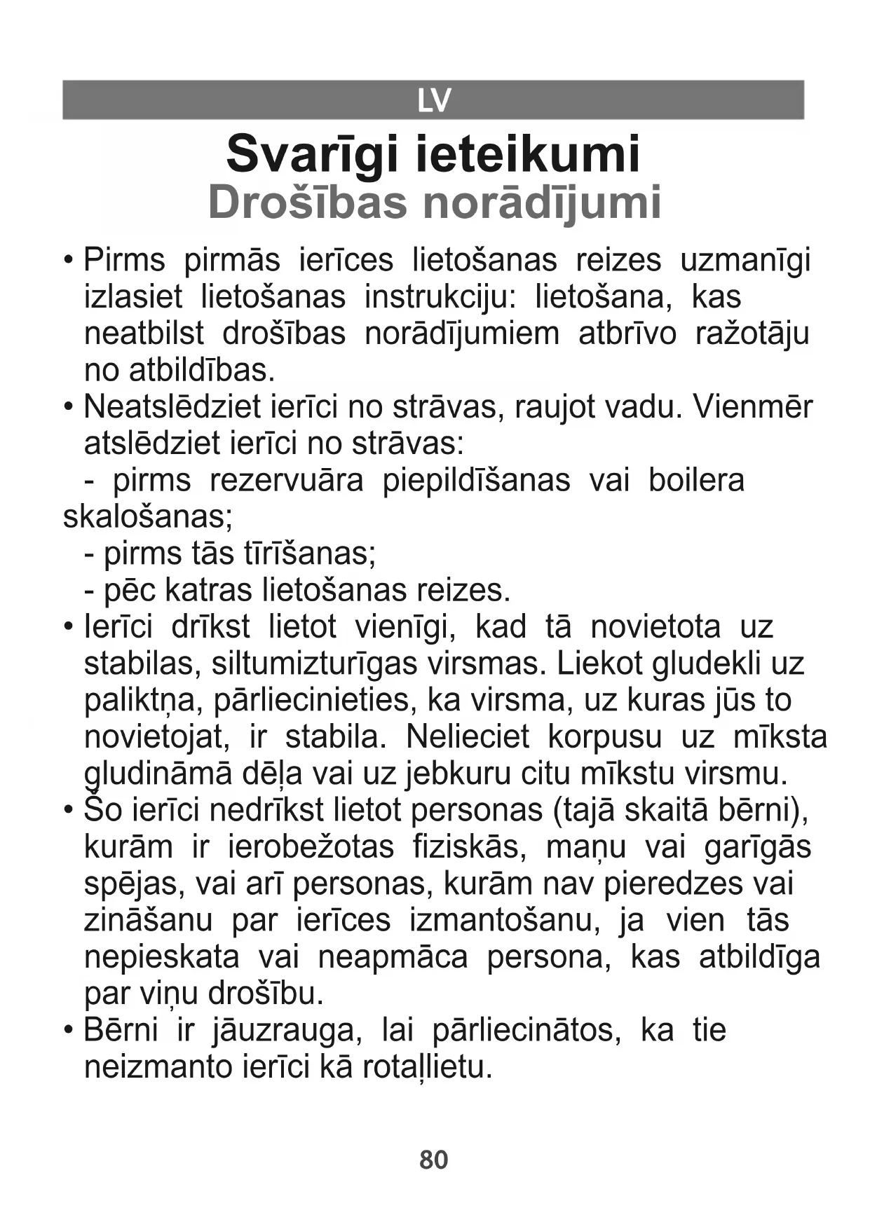 1800131945 GV52XX E0_110x154 22/11/13 09:27 Page80• Šo ierīci drīkst lietot bērni, kas sasnieguši vismaz 8 gadu vecumu, un personas, kurām trūkst pieredzes vai zināšanu par ierīces izmantošanu vai kuru fiziskās, maņu vai garīgās spējas ir ierobežotas, ja tās ir instruētas par ierīces lietošanu un tiek droši pieskatītas, un apzinās pastāvošo risku. Bērni nedrīkst spēlēties ar ierīci. Ierīces tīrīšanu un apkopi nedrīkst veikt bērni, kas jaunāki par 8 gadiem un netiek pieskatīti. Glabājiet ierīci un tās vadus bērniem, kas jaunāki par 8 gadiem, nepieejamā vietā.