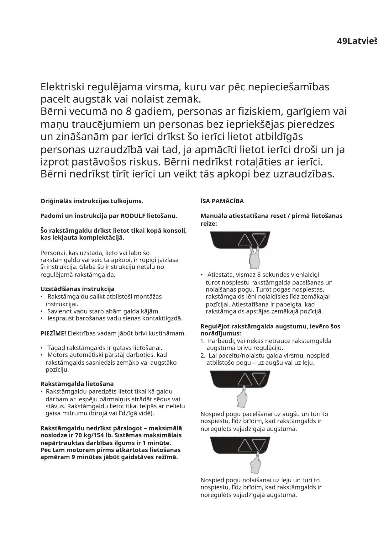atbilstošo pogu– uz augšu vai uz leju. Nospied pogu pacelšanai uz augšu un turi to nospiestu, līdz brīdim, kad rakstāmgalds ir noregulēts vajadzīgajā augstumā. Nospied pogu nolaišanai uz leju un turi to nospiestu, līdz brīdim, kad rakstāmgalds ir noregulēts vajadzīgajā augstumā. Elektriski regulējama virsma, kuru var pēc nepieciešamības pacelt augstāk vai nolaist zemāk. Bērni vecumā no 8 gadiem, personas ar ziskiem, garīgiem vai maņu traucējumiem un personas bez iepriekšējas pieredzes un zināšanām par ierīci drīkst šo ierīci lietot atbildīgās personas uzraudzībā vai tad, ja apmācīti lietot ierīci droši un ja izprot pastāvošos riskus. Bērni nedrīkst rotaļāties ar ierīci. Bērni nedrīkst tīrīt ierīci un veikt tās apkopi bez uzraudzības.50 Kānodrošinātpilnuamplitūdu