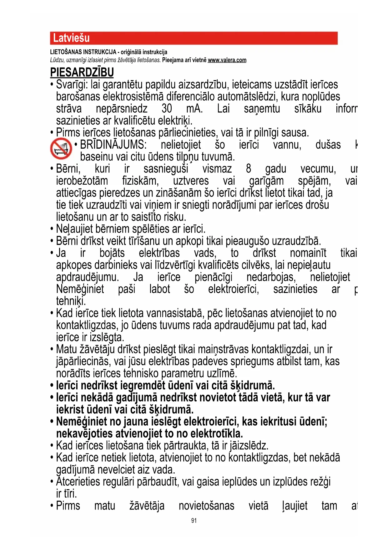 VALERA е регистрирана търгоска марка на LIGO PATENTS SA - ШвейцарияLatviešu LIETOŠANAS INSTRUKCIJA - oriģinālā instrukcija Lūdzu, uzmanīgi izlasiet pirms žāvētāja lietošanas. Pieejama arī vietnē www.valera.com PIESARDZĪBU