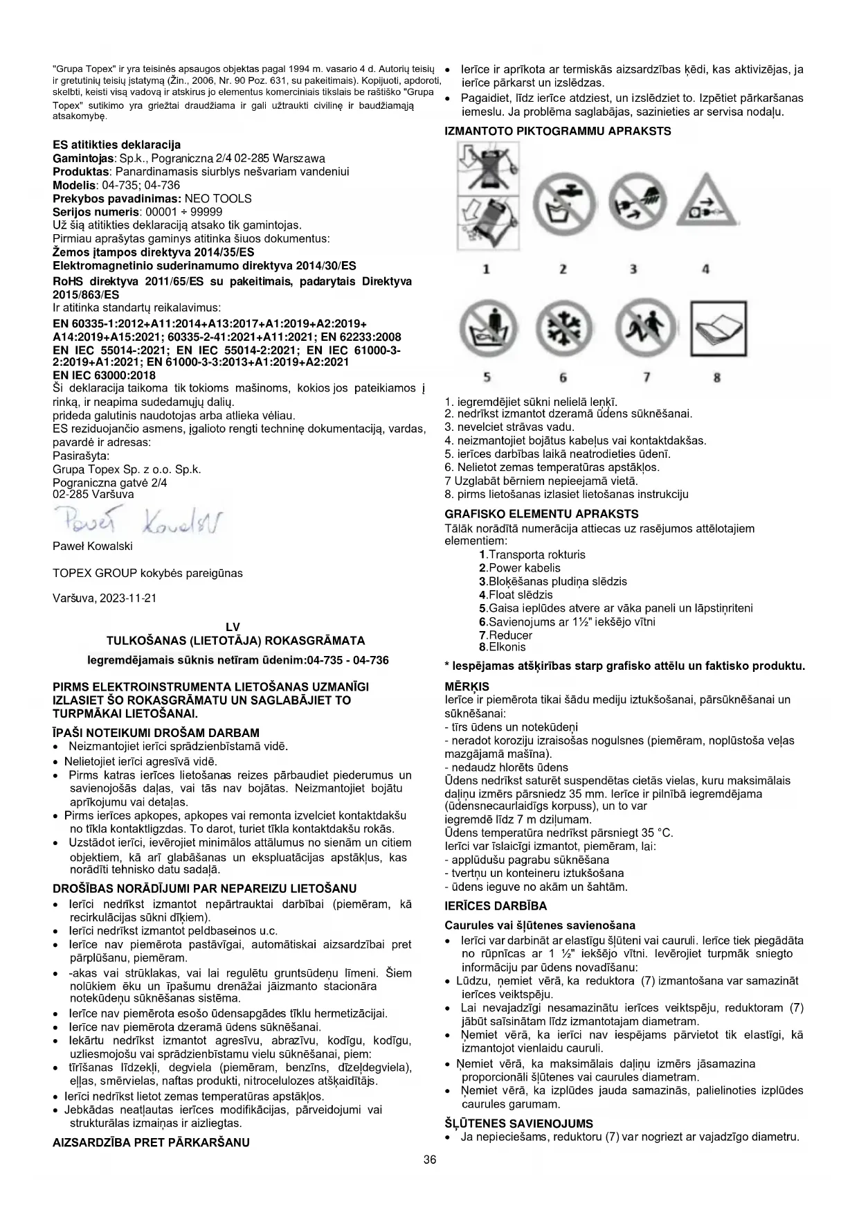 Uzlādējamās baterijas / akumulatorus nedrīkst izmest sadzīves atkritumos, kā arī tos nedrīkst mest ugunī vai ūdenī. Bojātas vai izlietotas baterijas ir pienācīgi jāpārstrādā saskaņā ar spēkā esošo direktīvu par bateriju un akumulatoru utilizāciju. "Grupa Topex Spółka z ierobežoną odpowiedzialnością" Spółka komandytowa ar juridisko adresi Varšavā, ul. Pograniczna 2/4 (turpmāk tekstā - "Grupa Topex") informē, ka visas autortiesības uz šīs rokasgrāmatas (turpmāk tekstā - "Rokasgrāmata") saturu, tostarp, cita starpā. tās tekstu, fotogrāfijām, diagrammām, zīmējumiem, kā arī tās sastāvu, pieder tikai grupai Grupa Topex un ir pakļautas tiesiskai aizsardzībai saskaņā ar 1994. gada 4. februāra Likumu par autortiesībām un blakustiesībām (OV 2006, Nr. 90 Poz. 631, ar grozījumiem). Visas Rokasgrāmatas un tās atsevišķu elementu kopēšana, apstrāde, publicēšana, pārveidošana komerciālos nolūkos bez Grupa Topex rakstiski izteiktas piekrišanas ir stingri aizliegta un var novest pie civiltiesiskās un kriminālatbildības. ES atbilstības deklarācija Ražotājs: Sp.k., Pograniczna 2/4 02-285 Warszawa Izstrādājums: Iegremdējamais sūknis netīram ūdenim Modelis: 04-735; 04-736 Tirdzniecības nosaukums: NEO TOOLS Sērijas numurs: 00001 ÷ 99999 Šī atbilstības deklarācija ir izdota uz ražotāja atbildību. Iepriekš aprakstītais izstrādājums atbilst šādiem dokumentiem: Zemsprieguma direktīva 2014/35/ES Elektromagnētiskās saderības direktīva 2014/30/ES RoHS Direktīva 2011/65/ES, kurā grozījumi izdarīti ar Direktīvu 2015/863/ES Un atbilst standartu prasībām: EN 60335-1:2012+A11:2014+A13:2017+A1:2019+A2:2019+ A14:2019+A15:2021; 60335-2-41:2021+A11:2021; EN 62233:2008 EN IEC 55014-:2021; EN IEC 55014-2:2021; EN IEC 61000-3- 2:2019+A1:2021; EN 61000-3-3:2013+A1:2019+A2:2021 EN IEC 63000:2018 Šī deklarācija attiecas tikai uz tirgū laistajām mašīnām, un tā neattiecas uz sastāvdaļām. pievieno galalietotājs vai vēlāk veic pats lietotājs. Tās ES rezidējošās personas vārds, uzvārds un adrese, kura ir pilnvarota sagatavot tehnisko dokumentāciju: Parakstīts uzņēmuma vārdā: Grupa Topex Sp. z o.o. Sp.k. Pograniczna iela 2/4 02-285 Varšava Paweł Kowalski39