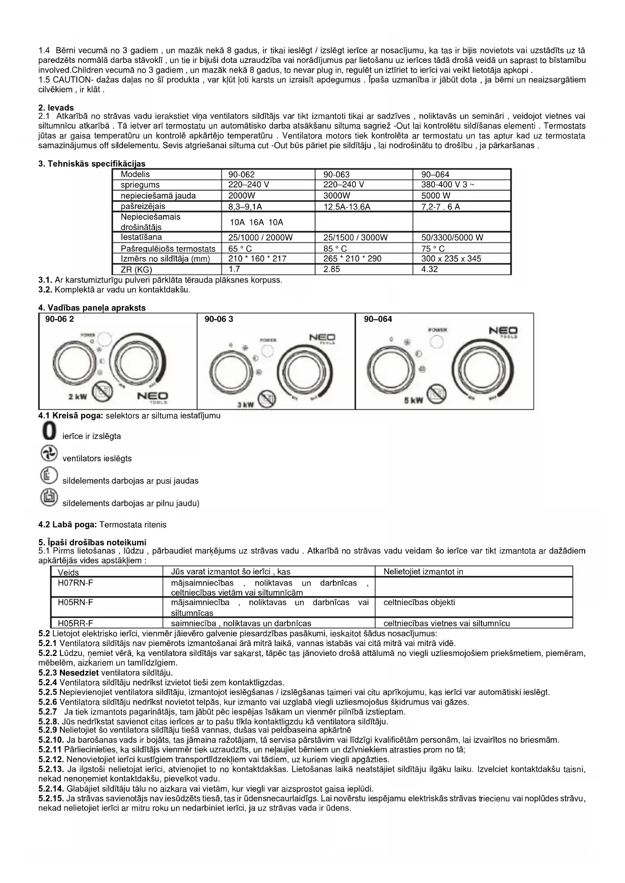 5.2.6 Ventilatora sildītāju nedrīkst novietot telpās, kur izmanto vai uzglabā viegli uzliesmojošus šķidrumus vai gāzes.