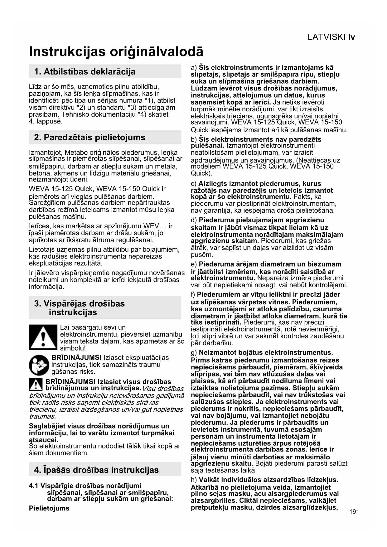 Izmantojot, Metabo oriģinālos piederumus, leņķa slīpmašīnas ir piemērotas slīpēšanai, slīpēšanai ar smilšpapīru, darbam ar stiepļu sukām un metāla, betona, akmens un līdzīgu materiālu griešanai, neizmantojot ūdeni. WEVA 15-125 Quick, WEVA 15-150 Quick ir piemērots arī vieglas pulēšanas darbiem. Sarežģītiem pulēšanas darbiem nepārtrauktas darbības režīmā ieteicams izmantot mūsu leņķa pulēšanas mašīnu. Ierīces, kas marķētas ar apzīmējumu WEV..., ir īpaši piemērotas darbam ar drāšu sukām, jo aprīkotas ar īkšķratu ātruma regulēšanai. Lietotājs uzņemas pilnu atbildību par bojājumiem, kas radušies elektroinstrumenta nepareizas ekspluatācijas rezultātā. Ir jāievēro vispārpieņemtie negadījumu novēršanas noteikumi un komplektā ar ierīci iekļautā drošības informācija. Lai pasargātu sevi un elektroinstrumentu, pievērsiet uzmanību visām teksta daļām, kas apzīmētas ar šo simbolu! BRĪDINĀJUMS! Izlasot ekspluatācijas instrukcijas, tiek samazināts traumu gūšanas risks. BRĪDINĀJUMS! Izlasiet visus drošības brīdinājumus un instrukcijas. Visu drošības brīdinājumu un instrukciju neievērošanas gadījumā tiek radīts risks saņemt elektriskās strāvas triecienu, izraisīt aizdegšanos un/vai gūt nopietnas traumas. Saglabājiet visus drošības norādījumus un informāciju, lai to varētu izmantot turpmākai atsaucei. Šo elektroinstrumentu nododiet tālāk tikai kopā ar šiem dokumentiem.