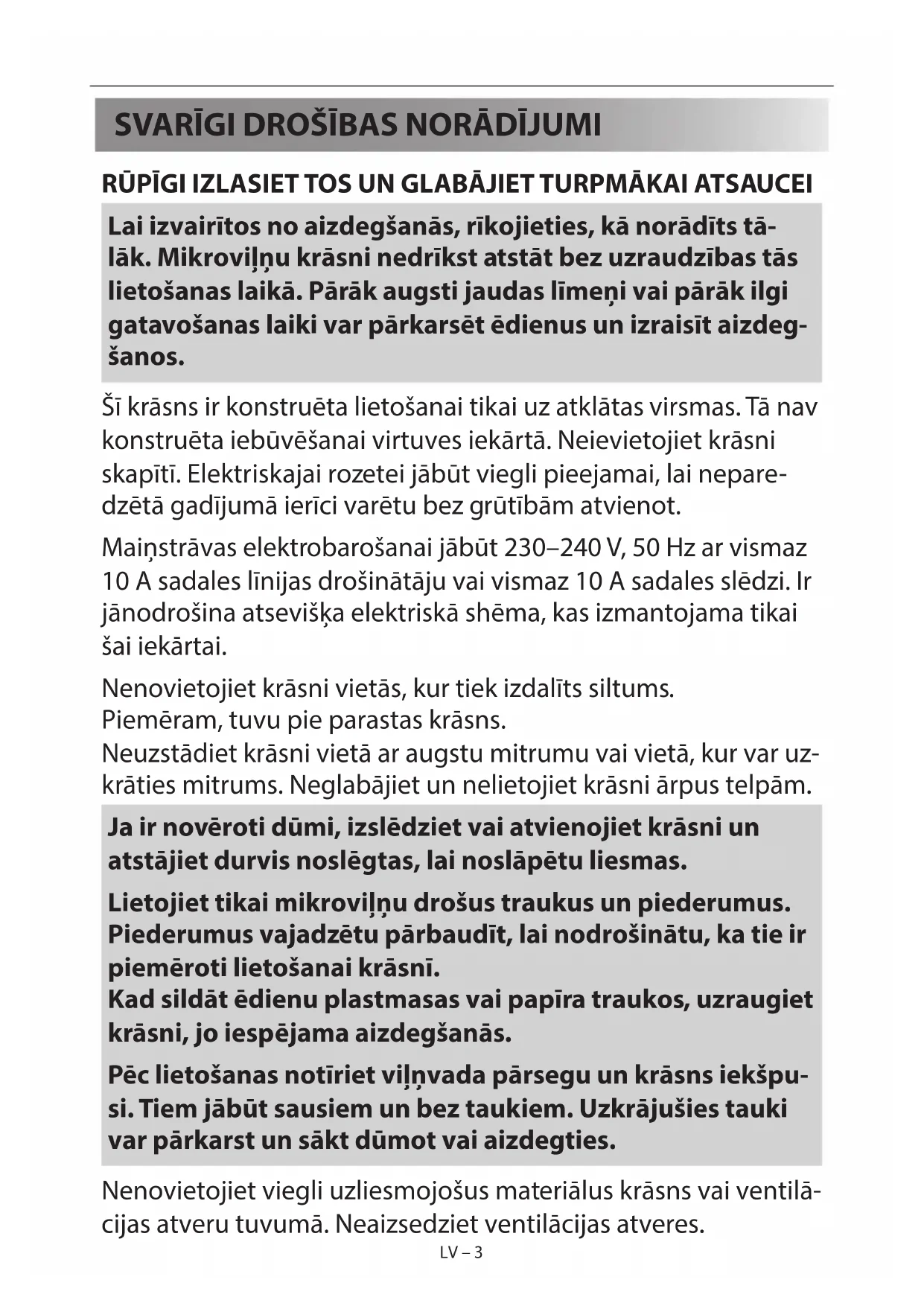 - - Tikai modeļiem ar grila funkciju.LV – 3 LV – 3 SVARĪGI DROŠĪBAS NORĀDĪJUMI RŪPĪGI IZLASIET TOS UN GLABĀJIET TURPMĀKAI ATSAUCEI Lai izvairītos no aizdegšanās, rīkojieties, kā norādīts tā- lāk. Mikroviļņu krāsni nedrīkst atstāt bez uzraudzības tās lietošanas laikā. Pārāk augsti jaudas līmeņi vai pārāk ilgi gatavošanas laiki var pārkarsēt ēdienus un izraisīt aizdeg- šanos. Šī krāsns ir konstruēta lietošanai tikai uz atklātas virsmas. Tā nav konstruēta iebūvēšanai virtuves iekārtā. Neievietojiet krāsni skapītī. Elektriskajai rozetei jābūt viegli pieejamai, lai nepare- dzētā gadījumā ierīci varētu bez grūtībām atvienot. Maiņstrāvas elektrobarošanai jābūt 230–240V, 50 Hz ar vismaz 10 A sadales līnijas drošinātāju vai vismaz 10 A sadales slēdzi. Ir jānodrošina atsevišķa elektriskā shēma, kas izmantojama tikai šai iekārtai. Nenovietojiet krāsni vietās, kur tiek izdalīts siltums. Piemēram, tuvu pie parastas krāsns. Neuzstādiet krāsni vietā ar augstu mitrumu vai vietā, kur var uz- krāties mitrums. Neglabājiet un nelietojiet krāsni ārpus telpām. Ja ir novēroti dūmi, izslēdziet vai atvienojiet krāsni un atstājiet durvis noslēgtas, lai noslāpētu liesmas. Lietojiet tikai mikroviļņu drošus traukus un piederumus. Piederumus vajadzētu pārbaudīt, lai nodrošinātu, ka tie ir piemēroti lietošanai krāsnī. Kad sildāt ēdienu plastmasas vai papīra traukos, uzraugiet krāsni, jo iespējama aizdegšanās. Pēc lietošanas notīriet viļņvada pārsegu un krāsns iekšpu- si. Tiem jābūt sausiem un bez taukiem. Uzkrājušies tauki var pārkarst un sākt dūmot vai aizdegties. Nenovietojiet viegli uzliesmojošus materiālus krāsns vai ventilā- cijas atveru tuvumā. Neaizsedziet ventilācijas atveres. LV – 4LV – 4 Izņemiet visus metāla blīvējumus, stiepļu auklas u.c. no pārti- kas produktiem un to iepakojumiem. Dzirksteļošana uz metāla virsmām var izraisīt aizdegšanos. Nelietojiet mikroviļņu krāsni, lai sildītu eļļu cepšanai dziļos trau- kos. Temperatūru nevar kontrolēt, un eļļa var aizdegties. Lai gatavotu popkornu, izmantojiet tikai īpašus mikroviļņu krāsns popkorna gatavotājus. Krāsnī neglabājiet pārtikas produktus un nevienu citu lietu. Pēc krāsns ieslēgšanas pārbaudiet iestatījumus, lai nodrošinātu, ka krāsns darbojas atbilstoši vēlamajam. Neatstājiet ierīci nepieskatītu, kad tā darbojas. Lai izvairītos no pārkaršanas un ugunsgrēka, jāievēro īpaša piesardzība, kad gatavojat vai uzsildāt pārtikas produktus ar augstu cukura vai tauku saturu, piemēram, cīsiņus mīklā, pīrā- gus vai Ziemassvētku pudiņu. Atbilstošos ieteikumus skatiet lietošanas instrukcijā. Lai izvairītos no traumām, ņemiet vērā tālāk minēto. BRĪ- DINĀJUMS! Nedarbiniet krāsni, ja tā ir bojāta vai nedarbojas pareizi. Pirms lietošanas pārbaudiet šādas daļas: a) pārliecinieties, vai durvis aizveras pareizi, un nodrošiniet, lai tās nebūtu manījušas pozīciju un nebūtu deformētas; b) Pārliecinieties, vai eņģes un durvju drošības ksatori nav salūzuši vai atbrīvojušies. c) Nodrošiniet, ka durvju blīves un blīvējuma virsmas nav bojātas. d) Nodrošiniet, ka krāsns iekšpusē vai durvju virsmā nav iespiedumu. e) Nodrošiniet, ka strāvas vads un kontaktdakša nav bojāti. Ja durvis vai durvju blīvējumi ir bojāti, krāsni nedrīkst lietot, kamēr to nav salabojusi kompetenta persona.LV LV – 4 LV – 4 Izņemiet visus metāla blīvējumus, stiepļu auklas u.c. no pārti- kas produktiem un to iepakojumiem. Dzirksteļošana uz metāla virsmām var izraisīt aizdegšanos. Nelietojiet mikroviļņu krāsni, lai sildītu eļļu cepšanai dziļos trau- kos. Temperatūru nevar kontrolēt, un eļļa var aizdegties. Lai gatavotu popkornu, izmantojiet tikai īpašus mikroviļņu krāsns popkorna gatavotājus. Krāsnī neglabājiet pārtikas produktus un nevienu citu lietu. Pēc krāsns ieslēgšanas pārbaudiet iestatījumus, lai nodrošinātu, ka krāsns darbojas atbilstoši vēlamajam. Neatstājiet ierīci nepieskatītu, kad tā darbojas. Lai izvairītos no pārkaršanas un ugunsgrēka, jāievēro īpaša piesardzība, kad gatavojat vai uzsildāt pārtikas produktus ar augstu cukura vai tauku saturu, piemēram, cīsiņus mīklā, pīrā- gus vai Ziemassvētku pudiņu. Atbilstošos ieteikumus skatiet lietošanas instrukcijā. Lai izvairītos no traumām, ņemiet vērā tālāk minēto. BRĪ- DINĀJUMS! Nedarbiniet krāsni, ja tā ir bojāta vai nedarbojas pareizi. Pirms lietošanas pārbaudiet šādas daļas: a) pārliecinieties, vai durvis aizveras pareizi, un nodrošiniet, lai tās nebūtu manījušas pozīciju un nebūtu deformētas; b) Pārliecinieties, vai eņģes un durvju drošības ksatori nav salūzuši vai atbrīvojušies. c) Nodrošiniet, ka durvju blīves un blīvējuma virsmas nav bojātas. d) Nodrošiniet, ka krāsns iekšpusē vai durvju virsmā nav iespiedumu. e) Nodrošiniet, ka strāvas vads un kontaktdakša nav bojāti. Ja durvis vai durvju blīvējumi ir bojāti, krāsni nedrīkst lietot, kamēr to nav salabojusi kompetenta persona.LV – 5 LV – 5 Nekad nemēģiniet pats noregulēt, remontēt vai pārveidot krāsni. Ir bīstami jebkuram, izņemot kompetentu personu, veikt jebkādu apkopes vai remonta darbību, noņemot pār- segu, kurš nodrošina aizsardzību pret mikroviļņu enerģi- jas iedarbību. Nelietojiet krāsni ar atvērtām durvīm un nekādā veidā nepār- veidojiet durvju drošības slēgmehānismus. Nelietojiet krāsni, ja starp durvju blīvēm un blīvējuma virsmām atrodas priekšmets. Neļaujiet taukiem un netīrumiem uzkrāties uz durvju blīvējumiem un blakus esošajām daļām. Tīriet krāsni pēc regulāriem intervāliem un noņemiet jebkādus ēdiena pār- palikumus. Ievērojiet norādījumus sadaļā “Kopšana un tīrīšana”. Ja krāsns netiek uzturēta tīra, krā