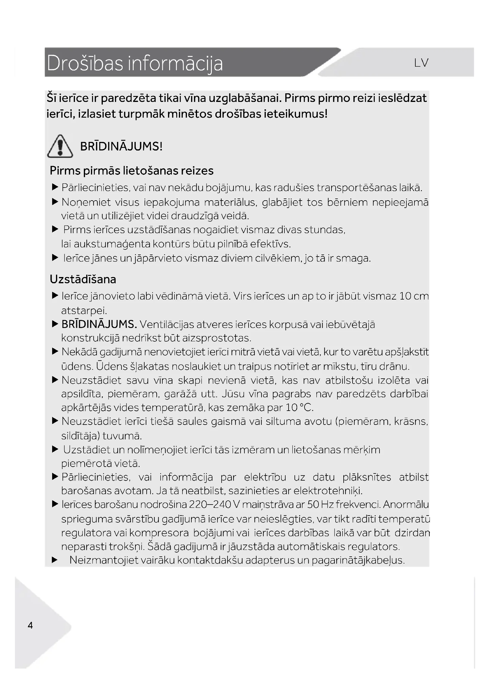 Drošības informāci ja Šī ierīce ir paredzēta tikai vīna uzglabāšanai. Pirms pirmo reizi ieslēdzat ierīci, izlasiet turpmāk minētos drošības ieteikumus! BRĪDINĀJUMS! Pirms pirmās lietošanas reizes Pārliecinieties, vai nav nekādu bojājumu, kas radušies transportēšanas laikā. Noņemiet visus iepakojuma materiālus, glabājiet tos bērniem nepieejamā vietā un utilizējiet videi draudzīgā veidā. Pirms ierīces uzstādīšanas nogaidiet vismaz divas stundas, lai aukstumaģenta kontūrs būtu pilnībā efektīvs. Ierīce jānes un jāpārvieto vismaz diviem cilvēkiem, jo tā ir smaga. Uzstādīšana Ierīce jānovieto labi vēdināmā vietā. Virs ierīces un ap to ir jābūt vismaz 10 cm atstarpei. BRĪDINĀJUMS. Ventilācijas atveres ierīces korpusā vai iebūvētajā konstrukcijā nedrīkst būt aizsprostotas. Nekādā gadījumā nenovietojiet ierīci mitrā vietā vai vietā, kur to varētu apšļakstīt ūdens. Ūdens šļakatas noslaukiet un traipus notīriet ar mīkstu, tīru drānu. Neuzstādiet savu vīna skapi nevienā vietā, kas nav atbilstošu izolēta vai apsildīta, piemēram, garāžā utt. Jūsu vīna pagrabs nav paredzēts darbībai apkārtējās vides temperatūrā, kas zemāka par 10 °C. Neuzstādiet ierīci tiešā saules gaismā vai siltuma avotu (piemēram, krāsns, sildītāja) tuvumā. Uzstādiet un nolīmeņojiet ierīci tās izmēram un lietošanas mērķim piemērotā vietā. Pārliecinieties, vai informācija par elektrību uz datu plāksnītes atbilst barošanas avotam. Ja tā neatbilst, sazinieties ar elektrotehniķi. Ierīces barošanu nodrošina 220–240 V maiņstrāva ar 50 Hz frekvenci. Anormālu sprieguma svārstību gadījumā ierīce var neieslēgties, var tikt radīti temperatūras regulatora vai kompresora bojājumi vai ierīces darbības laikā var būt dzirdami neparasti trokšņi. Šādā gadījumā ir jāuzstāda automātiskais regulators. Neizmantojiet vairāku kontaktdakšu adapterus un pagarinātājkabeļus.Drošības informācija