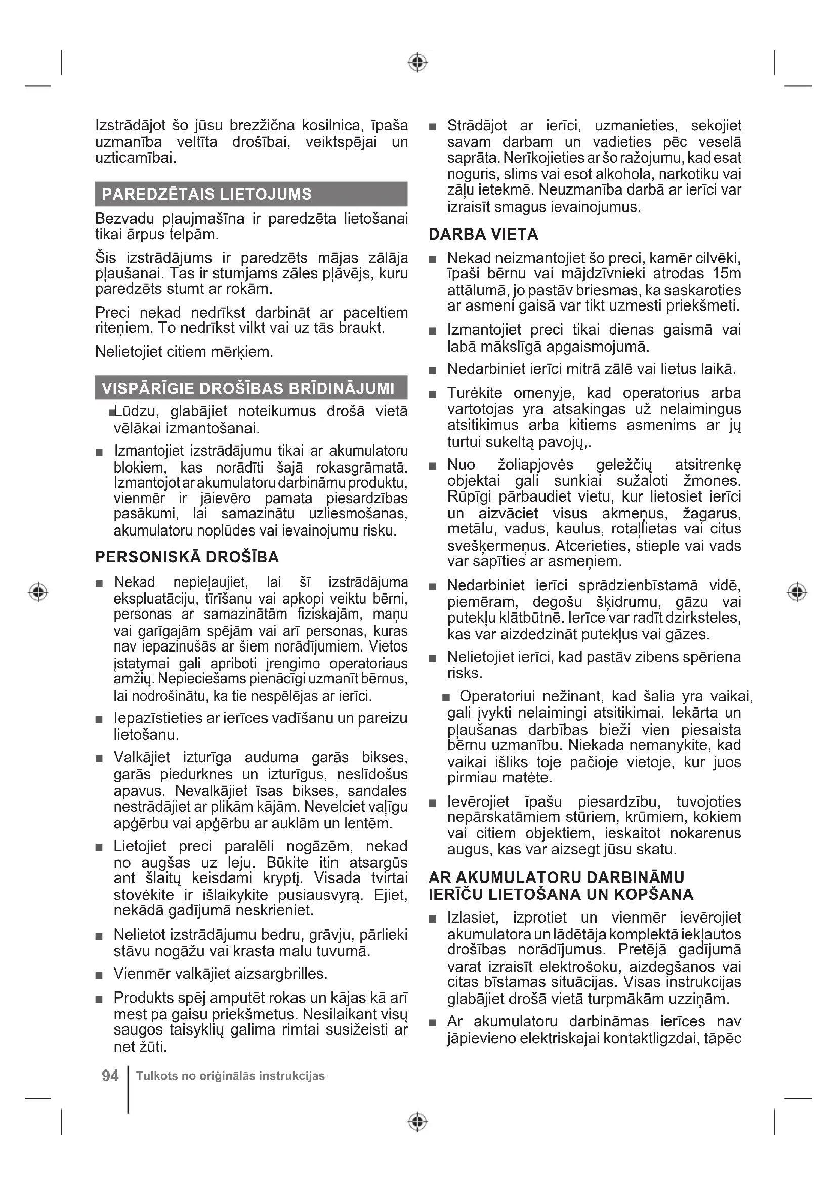 tās vienmēr ir darba kārtībā. Noņemiet izolatora atslēgu, kad nedarbiniet preci. ■ Izņemiet akumulatoru pirms regulēšanas, tīrīšanas vai objektu izņemšanas no ierīces. ■ Pirms akumulatora ievietošanas slēdža atslēga noteikti jāizņem. ■ Akumulators jālādē tikai ar ražotāja noteikto lādētāju. Lādētāja lietošana ar nesaderīgu akumulatoru var izraisīt ugunsgrēka risku. Akumulatora uzlādēšanai lietojiet tikai nosaukto tipu lādētāju. ■ Lietojiet tikai konkrētajai ierīcei paredzēto akumulatoru. Jebkura cita akumulatora lietošana var radīt ugunsgrēka, elektriskā trieciena vai ievainojumu risku. ■ Kad nelietojat akumulatoru, neturiet to citu metāla priekšmetu tuvumā, piemēram: papīra saspraudes, monētas, atslēgas, naglas, skrūves vai citi sīki metāla priekšmeti, kas var veidot savienojumu starp spailēm. Savienojot bateriju paketes terminālus, var rasties dzirksteles, apdegumi, aizdegšanās vai eksplozija. ■ Nenovietojiet akumulatoru izstrādājumus vai to akumulatorus uguns vai karstuma avotu tuvumā. Tas palielina eksplozijas un miesas bojājumu gūšanas risku. ■ Neatveriet un neizjauciet akumulatoru. Izliets elektrolīts ir korodējošs un var radīt bojājumus acīm vai ādai. Norijot tas ir toksisks. ■ Sargājiet akumulatoru no mitruma un ūdens. Nelādējiet akumulatoru mitrā vietā. Šī noteikuma ievērošana samazinās elektrotraumu risku. ■ Akumulatora bojājuma un nepareizas lietošanas gadījumā var izdalīties tvaiks. Nodrošiniet svaigu gaisu un sūdzību gadījumā lūdziet medicīnisku palīdzību. Tvaiks var kairināt elpošanas sistēmu. ■ Neatstājiet bateriju paketi transportlīdzeklī karstos vai aukstos laikapstākļos. ■ Nesadedziniet akumulatoru. ■ Nepareizas rīcības gadījumā no akumulatora var izkļūt šķidrums; izvairieties no saskares ar to. Nejaušas saskares gadījumā skalojiet skarto vietu ar ūdeni. Ja šķidrums iekļūst acīs, nekavējoties meklējiet medicīnisko palīdzību. No akumulatora izkļuvušais šķidrums var izraisīt kairinājumu vai apdegumus. ZĀLES PĻĀVĒJA DROŠĪBAS
