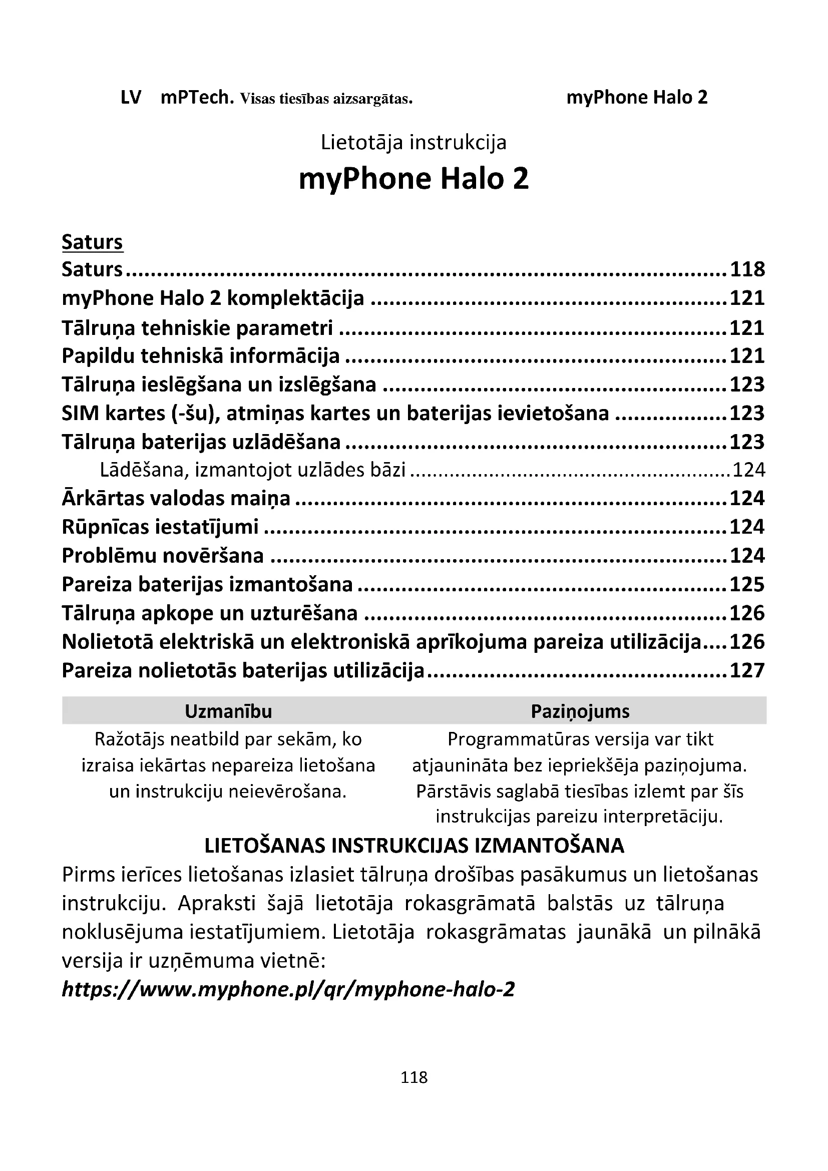 Pirms ierīces lietošanas izlasiet tālruņa drošības pasākumus un lietošanas instrukciju. Apraksti šajā lietotāja rokasgrāmatā balstās uz tālruņa noklusējuma iestatījumiem. Lietotāja rokasgrāmatas jaunākā un pilnākā versija ir uzņēmuma vietnē: https://www.myphone.pl/qr/myphone-halo-2LV mPTech. Visas tiesības aizsargātas. myPhone Halo 2