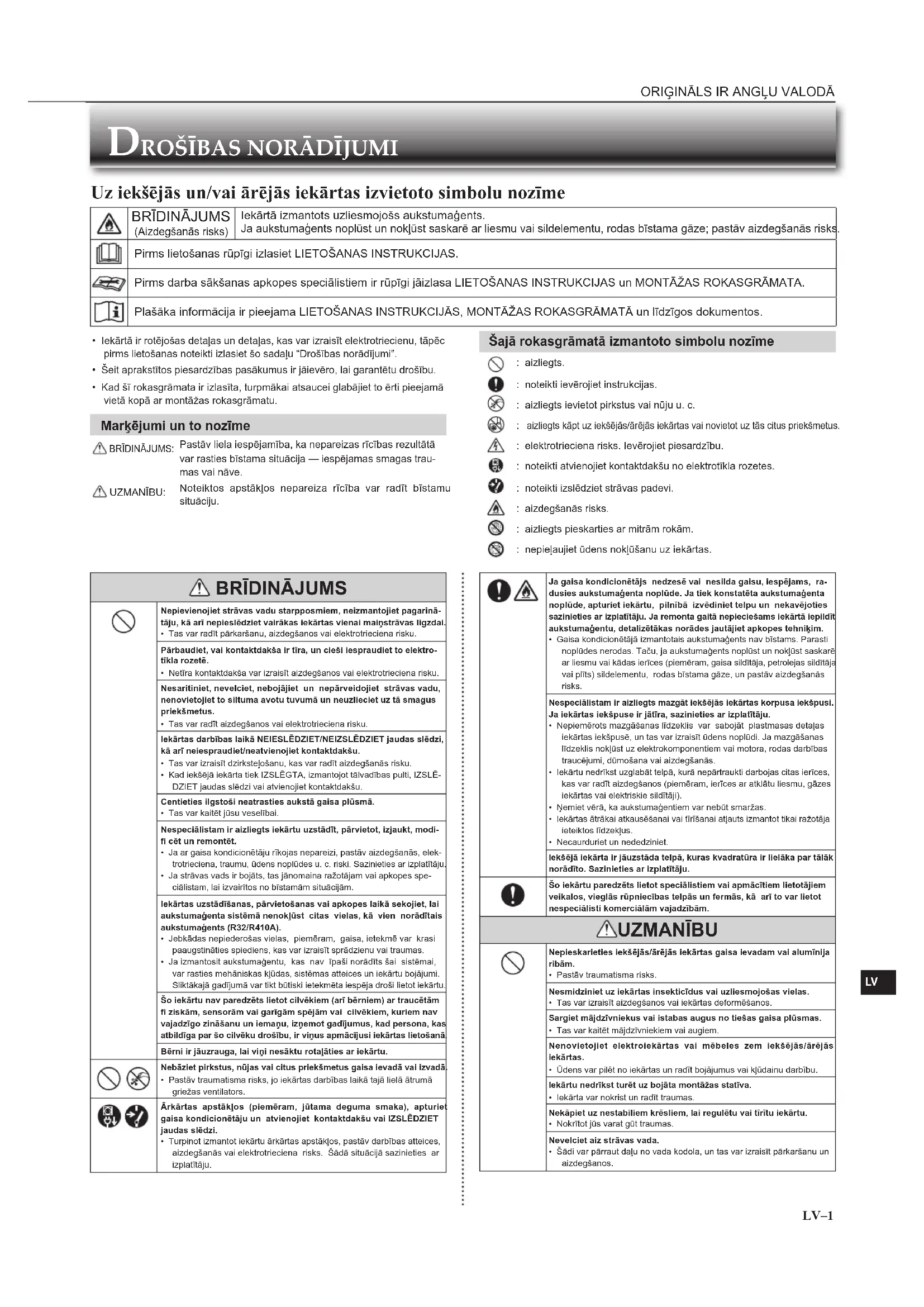 Nepievienojiet strāvas vadu starpposmiem, neizmantojiet pagarinā-tāju, kā arī nepieslēdziet vairākas iekārtas vienai maiņstrāvas ligzdai.• Tas var radīt pārkaršanu, aizdegšanos vai elektrotrieciena risku.Pārbaudiet, vai kontaktdakša ir tīra, un cieši iespraudiet to elektro-tīkla rozetē.• Netīra kontaktdakša var izraisīt aizdegšanos vai elektrotrieciena risku.Nesaritiniet, nevelciet, nebojājiet un nepārveidojiet strāvas vadu, nenovietojiet to siltuma avotu tuvumā un neuzlieciet uz tā smagus priekšmetus.• Tas var radīt aizdegšanos vai elektrotrieciena risku.Iekārtas darbības laikā NEIESLĒDZIET/NEIZSLĒDZIET jaudas slēdzi, kā arī neiespraudiet/neatvienojiet kontaktdakšu.• Tas var izraisīt dzirksteļošanu, kas var radīt aizdegšanās risku.• Kad iekšējā iekārta tiek IZSLĒGTA, izmantojot tālvadības pulti, IZSLĒ-DZIET jaudas slēdzi vai atvienojiet kontaktdakšu. Centieties ilgstoši neatrasties aukstā gaisa plūsmā.• Tas var kaitēt jūsu veselībai.Nespeciālistam ir aizliegts iekārtu uzstādīt, pārvietot, izjaukt, modi-fi cēt un remontēt.• Ja ar gaisa kondicionētāju rīkojas nepareizi, pastāv aizdegšanās, elek-trotrieciena, traumu, ūdens noplūdes u. c. riski. Sazinieties ar izplatītāju.• Ja strāvas vads ir bojāts, tas jānomaina ražotājam vai apkopes spe-ciālistam, lai izvairītos no bīstamām situācijām.Iekārtas uzstādīšanas, pārvietošanas vai apkopes laikā sekojiet, lai aukstumaģenta sistēmā nenokļūst citas vielas, kā vien norādītais aukstumaģents (R32/R410A).• Jebkādas nepiederošas vielas, piemēram, gaisa, ietekmē var krasi paaugstināties spiediens, kas var izraisīt sprādzienu vai traumas.• Ja izmantosit aukstumaģentu, kas nav īpaši norādīts šai sistēmai, var rasties mehāniskas kļūdas, sistēmas atteices un iekārtu bojājumi. Sliktākajā gadījumā var tikt būtiski ietekmēta iespēja droši lietot iekārtu.Šo iekārtu nav paredzēts lietot cilvēkiem (arī bērniem) ar traucētām fi ziskām, sensorām vai garīgām spējām vai cilvēkiem, kuriem nav vajadzīgo zināšanu un iemaņu, izņemot gadījumus, kad persona, kas atbildīga par šo cilvēku drošību, ir viņus apmācījusi iekārtas lietošanā.Bērni ir jāuzrauga, lai viņi nesāktu rotaļāties ar iekārtu. Nebāziet pirkstus, nūjas vai citus priekšmetus gaisa ievadā vai izvadā.• Pastāv traumatisma risks, jo iekārtas darbības laikā tajā lielā ātrumā griežas ventilators. Ārkārtas apstākļos (piemēram, jūtama deguma smaka), apturiet gaisa kondicionētāju un atvienojiet kontaktdakšu vai IZSLĒDZIET jaudas slēdzi.• Turpinot izmantot iekārtu ārkārtas apstākļos, pastāv darbības atteices, aizdegšanās vai elektrotrieciena risks. Šādā situācijā sazinieties ar izplatītāju. Ja gaisa kondicionētājs nedzesē vai nesilda gaisu, iespējams, ra-dusies aukstumaģenta noplūde. Ja tiek konstatēta aukstumaģenta noplūde, apturiet iekārtu, pilnībā izvēdiniet telpu un nekavējoties sazinieties ar izplatītāju. Ja remonta gaitā nepieciešams iekārtā iepildīt aukstumaģentu, detalizētākas norādes jautājiet apkopes tehniķim.• Gaisa kondicionētājā izmantotais aukstumaģents nav bīstams. Parasti noplūdes nerodas. Taču, ja aukstumaģents noplūst un nokļūst saskarē ar liesmu vai kādas ierīces (piemēram, gaisa sildītāja, petrolejas sildītāja vai plīts) sildelementu, rodas bīstama gāze, un pastāv aizdegšanās risks.Nespeciālistam ir aizliegts mazgāt iekšējās iekārtas korpusa iekšpusi. Ja iekārtas iekšpuse ir jātīra, sazinieties ar izplatītāju.• Nepiemērots mazgāšanas līdzeklis var sabojāt plastmasas detaļas iekārtas iekšpusē, un tas var izraisīt ūdens noplūdi. Ja mazgāšanas līdzeklis nokļūst uz elektrokomponentiem vai motora, rodas darbības traucējumi, dūmošana vai aizdegšanās.• Iekārtu nedrīkst uzglabāt telpā, kurā nepārtraukti darbojas citas ierīces, kas var radīt aizdegšanos (piemēram, ierīces ar atklātu liesmu, gāzes iekārtas vai elektriskie sildītāji).• Ņemiet vērā, ka aukstumaģentiem var nebūt smaržas.• Iekārtas ātrākai atkausēšanai vai tīrīšanai atļauts izmantot tikai ražotāja ieteiktos līdzekļus.• Necaurduriet un nededziniet.Iekšējā iekārta ir jāuzstāda telpā, kuras kvadratūra ir lielāka par tālāk norādīto. Sazinieties ar izplatītāju.Šo iekārtu paredzēts lietot speciālistiem vai apmācītiem lietotājiem veikalos, vieglās rūpniecības telpās un fermās, kā arī to var lietot nespeciālisti komerciālām vajadzībām. UZMANĪBU Nepieskarieties iekšējās/ārējās iekārtas gaisa ievadam vai alumīnija ribām.• Pastāv traumatisma risks.Nesmidziniet uz iekārtas insekticīdus vai uzliesmojošas vielas.• Tas var izraisīt aizdegšanos vai iekārtas deformēšanos.Sargiet mājdzīvniekus vai istabas augus no tiešas gaisa plūsmas.• Tas var kaitēt mājdzīvniekiem vai augiem.Nenovietojiet elektroiekārtas vai mēbeles zem iekšējās/ārējās iekārtas.• Ūdens var pilēt no iekārtas un radīt bojājumus vai kļūdainu darbību.Iekārtu nedrīkst turēt uz bojāta montāžas statīva.• Iekārta var nokrist un radīt traumas.Nekāpiet uz nestabiliem krēsliem, lai regulētu vai tīrītu iekārtu.• Nokrītot jūs varat gūt traumas.Nevelciet aiz strāvas vada.• Šādi var pārraut daļu no vada kodola, un tas var izraisīt pārkaršanu un aizdegšanos. Šajā rokasgrāmatā izmantoto simbolu nozīme : aizliegts. : noteikti ievērojiet instrukcijas. : aizliegts ievietot pirkstus vai nūju u. c. aizliegts kāpt uz iekšējās/ārējās iekārtas vai novietot uz tās citus priekšmetus. : elektrotrieciena risks. Ievērojiet piesardzību. : noteikti atvienojiet kontaktdakšu no elektrotīkla rozetes. : noteikti izslēdziet strāvas padevi. : aizdegšanās risks. : aizliegts pieskarties ar mitrām rokām. : nepieļaujiet ūd