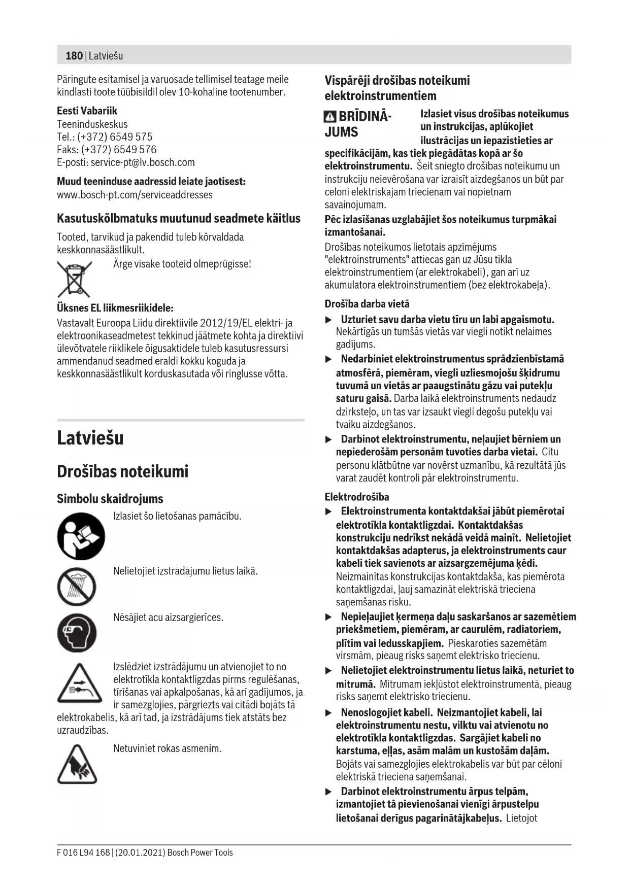 Käsitsemine u Järgige võrgupinget! Võrgupinge peab vastama seadme andmesildil märgitud pingele. F 016 L94 168 | (20.01.2021) Bosch Power ToolsEesti | 179 Sisse/välja lülitamine (vt jooniseid C ja D) Sisselülitamisek vajutage esmalt sisselülitustõkestit (3) ja hoidke seda all. Seejärel vajutage sisse-välja-lülitit (2) ja hoidke seda all. Laske väljalülitamiseks sisselülitustõkesti (3) ja seejärel sisse-välja-lüliti (2) lahti. Saagimisfunktsioon Olgugi et hammaste vahekaugus võimaldab lõigata oksi läbimõõduga Ø20mm, on lõiketera teravik mõeldud lõigetele läbimõõduga Ø25mm. Aiakääridega töötamine (vt joonist E) Juhtige hekikääre ühtlaselt mööda lõikejoont. Kahepoolne tera võimaldab lõigata mõlemas suunas või pendelliigutustega ühelt poolt teisele poole. Kõigepealt lõigake hekki külgedelt, seejärel pealt. Selleks et saada sirgeid külgi, soovitame hekki lõigata kasvu suunas alt üles. Ülevalt alla lõikamisel suunatakse peenemad oksad väljapoole, mistõttu võivad tekkida hõredad kohad või augud. Selleks et lõigata heki ülaserv ühtlaseks, tuleb kogu heki pikkuses tõmmata soovitud kõrgusele orientiiriks nöör. Pöörake tähelepanu sellele, et te ei lõikaks hekikääreidega nt traatidesse. Lõiketera või ajam võivad kahjustada saada. Veaotsing Tundemärk Võimalik põhjus Abi Hekikäärid ei tööta Toitepinge puudub Kontrollige ja lülitage sisse Pistikupesa on defektne Kasutage teist pistikupesa Võrgukaabel on kahjustatud Kontrollige võrgukaablit ja pöörduge kahjustuse korral klienditeenindusse Pikendusjuhe on kahjustatud Kontrollige pikendusjuhet ja asendage kahjustatud juhe uue vastu Kaitse on vallandunud Vahetage kaitse välja Hekikäärid töötavad katkendlikult Seadme sisekaablid ei ole töökorras Pöörduge remonditöökotta Sisse-välja-lüliti on defektne Pöörduge remonditöökotta Mootor töötab, lõiketerad ei pöörle Sisemine viga Pöörduge remonditöökotta Lõiketerad lähevad kuumaks Lõiketera on nüri Laske lõiketera teritada Lõiketeral on kriimustused Laske lõiketera kontrollida Liigne hõõrdumine puuduliku määrimise tõttu Pihustage lõiketerale määrdeõli Tugev vibratsioon/ müra Aiatööriist on defektne Pöörduge remonditöökotta Hooldus ja korrashoid Hooldus, puhastamine ja hoiustamine u Enne mistahes tööd aiatööriista kallal tõmmake pistik pistikupesast välja. u Hoidke aiatööriist puhas, et tagada tõrgeteta ja ohutu töö. Ärge pange tööriista peale teisi esemeid. Tõrgeteta ja ohutu töö tagamiseks hoidke aiatööriist ja selle ventilatsiooniavad puhtad. Ärge pihustage kunagi tööriistale vett. Ärge kastke kunagi aiatööriista vette. Hoiustage aiatööriista ohutus, kuivas ja lastele ligipääsmatus kohas. Ärge pange tööriista peale teisi esemeid. Seadme tööohutuse tagamiseks veenduge, et kõik mutrid, poldid ja kruvid on kõvasti kinni keeratud. Kontrollige seadet ja asendage tööohutuse tagamiseks kulunud ja kahjustatud osad uute vastu. Veenduge, et varuosad pärinevad Boschilt. Müügijärgne teenindus ja kasutusalane nõustamine Klienditeeninduse töötajad vastavad teie küsimustele teie toote remondi ja hoolduse ning varuosade kohta. Joonised ja info varuosade kohta leiate ka veebisaidilt: www.bosch-pt.com Boschi nõustajad on meeleldi abiks, kui teil on küsimusi toodete ja lisatarvikute kasutamise kohta. Bosch Power Tools F 016 L94 168 | (20.01.2021)180 | Latviešu Päringute esitamisel ja varuosade tellimisel teatage meile kindlasti toote tüübisildil olev 10‑kohaline tootenumber. Eesti Vabariik Teeninduskeskus Tel.: (+372) 6549 575 Faks: (+372) 6549 576 E-posti: service-pt@lv.bosch.com Muud teeninduse aadressid leiate jaotisest: www.bosch-pt.com/serviceaddresses Kasutuskõlbmatuks muutunud seadmete käitlus Tooted, tarvikud ja pakendid tuleb kõrvaldada keskkonnasäästlikult. Ärge visake tooteid olmeprügisse! Üksnes ELliikmesriikidele: Vastavalt Euroopa Liidu direktiivile 2012/19/EL elektri- ja elektroonikaseadmetest tekkinud jäätmete kohta ja direktiivi ülevõtvatele riiklikele õigusaktidele tuleb kasutusressursi ammendanud seadmed eraldi kokku koguda ja keskkonnasäästlikult korduskasutada või ringlusse võtta. Latviešu Drošības noteikumi Simbolu skaidrojums Izlasiet šo lietošanas pamācību. Nelietojiet izstrādājumu lietus laikä. Nēsājiet acu aizsargierīces. Izslēdziet izstrādājumu un atvienojiet to no elektrotīkla kontaktligzdas pirms regulēšanas, tīrīšanas vai apkalpošanas, kā arī gadījumos, ja ir samezglojies, pārgriezts vai citādi bojāts tā elektrokabelis, kā arī tad, ja izstrādājums tiek atstāts bez uzraudzības. Netuviniet rokas asmenim. Vispārēji drošības noteikumi elektroinstrumentiem BRĪDINĀ- JUMS Izlasiet visus drošības noteikumus un instrukcijas, aplūkojiet ilustrācijas un iepazīstieties ar specifikācijām, kas tiek piegādātas kopā ar šo elektroinstrumentu. Šeit sniegto drošības noteikumu un instrukciju neievērošana var izraisīt aizdegšanos un būt par cēloni elektriskajam triecienam vai nopietnam savainojumam. Pēc izlasīšanas uzglabājiet šos noteikumus turpmākai izmantošanai. Drošības noteikumos lietotais apzīmējums "elektroinstruments" attiecas gan uz Jūsu tīkla elektroinstrumentiem (ar elektrokabeli), gan arī uz akumulatora elektroinstrumentiem (bez elektrokabeļa). Drošība darba vietā u Uzturiet savu darba vietu tīru un labi apgaismotu. Nekārtīgās un tumšās vietās var viegli notikt nelaimes gadījums. u Nedarbiniet elektroinstrumentus sprādzienbīstamā atmosfērā, piemēram, viegli uzliesmojošu šķidrumu tuvumā un vietās ar paaugstinātu gāzu vai putekļu saturu gaisā. Darba laikā elektroinstruments nedaudz dzirksteļo, un tas var izsaukt viegli degošu putekļu vai tvaiku aizdegšanos. u Darbinot elektroinstrumentu, neļaujiet bērniem un nepiederošām personām tuvoties darba vietai. Citu personu klātbūtne var novērst uzman