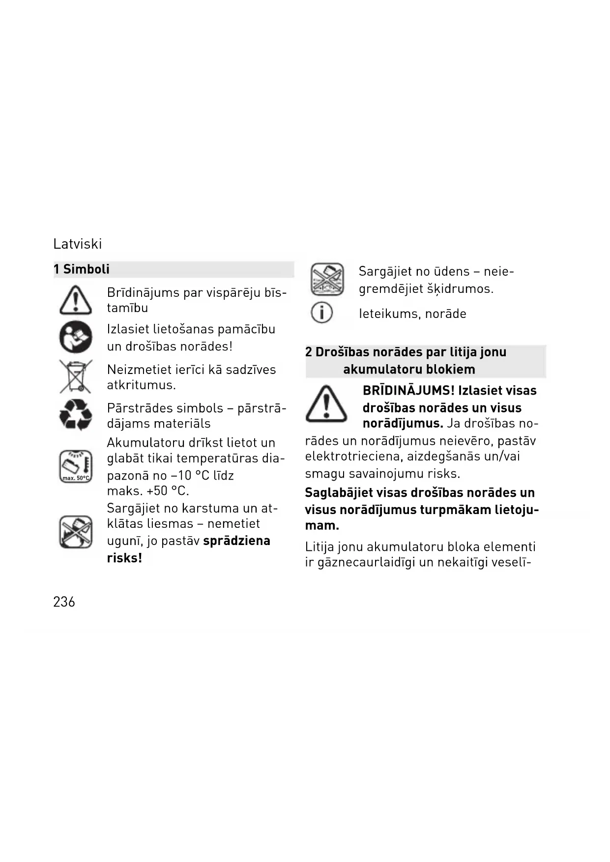 akumulatoru bloka lietošanu Akumulatoru bloks tiek piegā dāts daļēji uzlādētā stāvoklī. Lai akumulatoru bloks spētu nodro šināt pilnu jaudu, pirms tā lieto šanas pirmo reizi pilnībā uzlādē jiet akumulatoru bloku ar uzlā des ierīces palīdzību. Akumulatoru bloku var uzlādēt jebkurā laikā, neriskējot samazināt tā kalpoša nas laiku. Arī pārtraukums uzlādes pro cesā nekaitē akumulatoru blokam. Kad elektroinstruments ir automātiski izslēdzies, ne meģiniet to no jauna ieslēgt, nospiežot ieslēdzēju. Šāda rīcība var sabojāt akumulatoru bloku. Akumulatoru bloks ir aprīkots ar tem peratūras kontrolierīci, kas pieļauj uz lādi tikai temperatūras diapazonā no 0 °C līdz 55 °C. Tas ļauj ievērojami pa lielināt akumulatora kalpošanas laiku. Latviski 241– Akumulatoru bloku ieteicams glabāt vēsā (5 līdz 25 °C) un sausā (gaisa mi trums < 80 %) vietā. – Piemēram, vasarā neatstājiet akumu latoru bloku automašīnā. – Ja ievērojami samazinās darbības laiks ar vienu uzlādi, tas liecina, ka akumulatoru bloks ir nolietots un jā nomaina pret jaunu. – Ievērojiet norādījumus par utilizāciju.