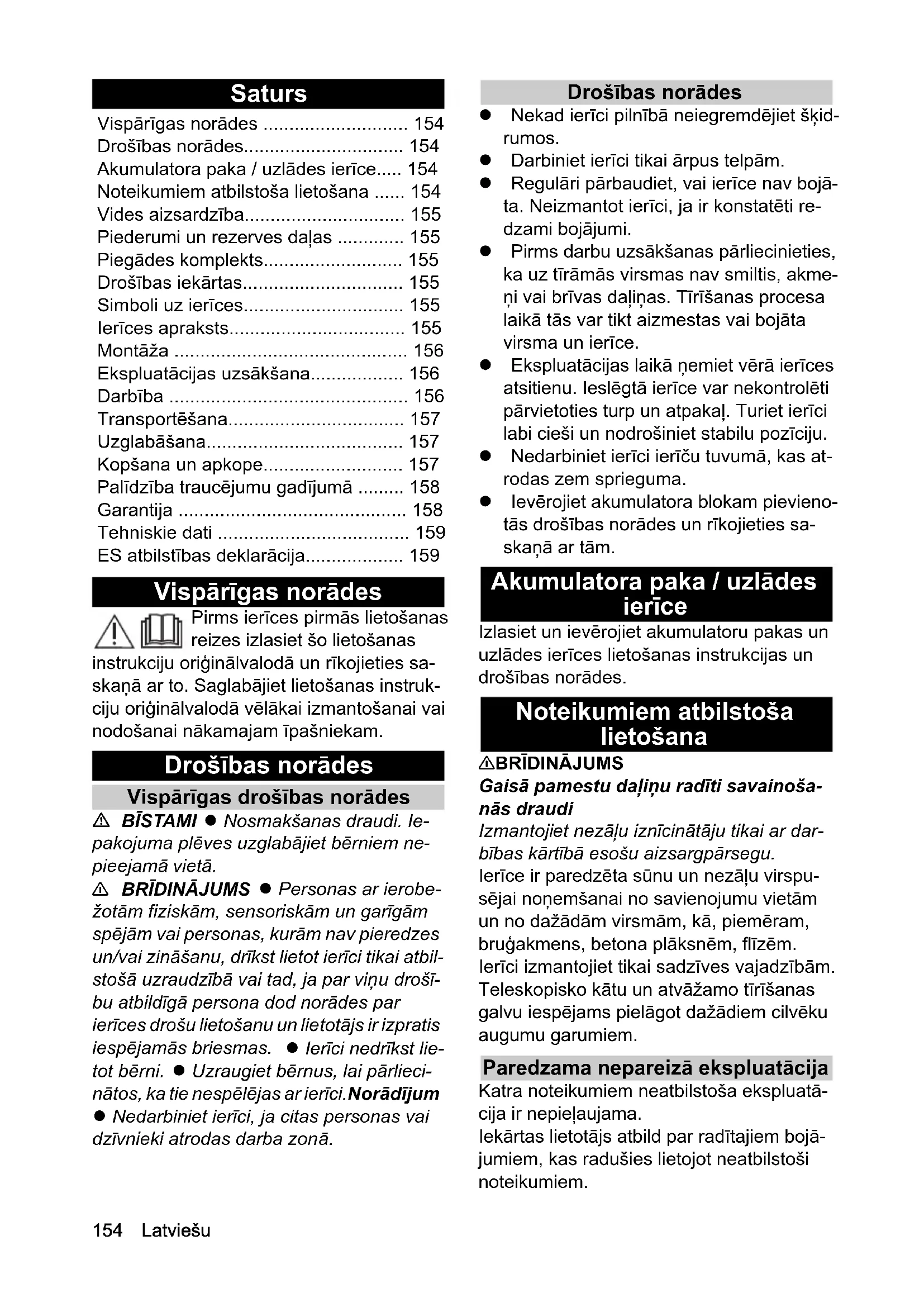 - ES atbilstības deklarācija Latviešu 155 Vides aizsardzība Iepakojuma materiālus ir iespējams pārstrādāt atkārtoti. Utilizējiet iepako- jumus videi draudzīgā veidā. Elektriskās un elektroniskās ierīces satur noderīgus pārstrādājumus mate- riālus un bieži vien tādas sastāvdaļas kā baterijas, akumulatorus un eļļu, kuras to nepareizas izmantošanas vai neatbilstošas utilizācijas gadījumā var radīt potenciālu apdraudējumu cilvēku veselībai un videi. Tomēr šīs sastāvdaļas ir nepieciešamas ie- rīces pareizai darbībai. Ierīces, kas apzī- mētas ar šo simbolu, nedrīkst izmest kopā ar sadzīves atkritumiem. Informācija par sastāvdaļām (REACH) Aktuālo informāciju par sastāvdaļām atra- dīsiet: www.kaercher.com/REACH Piederumi un rezerves daļas Izmantot tikai oriģinālos piederumus un ori- ģinālās rezerves daļas, jo tie garantē drošu un nevainojamu ierīces darbību. Informāciju par piederumiem un rezerves daļām skatīt www.kaercher.com. Piegādes komplekts Ierīces piegādes komplekts ir attēlots uz ie- pakojuma. Izsaiņojot pārbaudiet, vai saturs ir pilnīgs. Ja trūkst piederumi vai transpor- tēšanas laikā radušies bojājumi, lūdzu, in- formējiet tirgotāju. Drošības iekārtas Birstes aizsargpārsegs Attēls B Aizsargpārsegs novērš to, ka iekārtas lieto- tājs vai apkārt stāvošās personas tiek ievai- notas ar augšā pamestām daļiņām. Simboli uz ierīces Ierīces apraksts Attēlu skatīt grafiku lapās Attēls A 1 Rotējoša neilona birste 2 Atvāžama tīrīšanas galva 3 Atvāžamās tīrīšanas galvas atbloķēša- nas taustiņš 4 Teleskopiskais kāts 5 Otrs rokturis 6 Teleskopiskā kāta atbloķēšanas taus- tiņš 7 Ierīces slēdža atbloķēšanas taustiņš 8 Rokturis 9 Ierīces slēdzis 10 Akumulatoru pakas 18 V Battery Power stiprinājums 11 Akumulatoru pakas atbloķēšanas taus- tiņš 12 Datu plāksnīte 13 Birstes aizsargpārsegs 14 Palīgvadotne ar saru lentes pārsega vā- p. 159