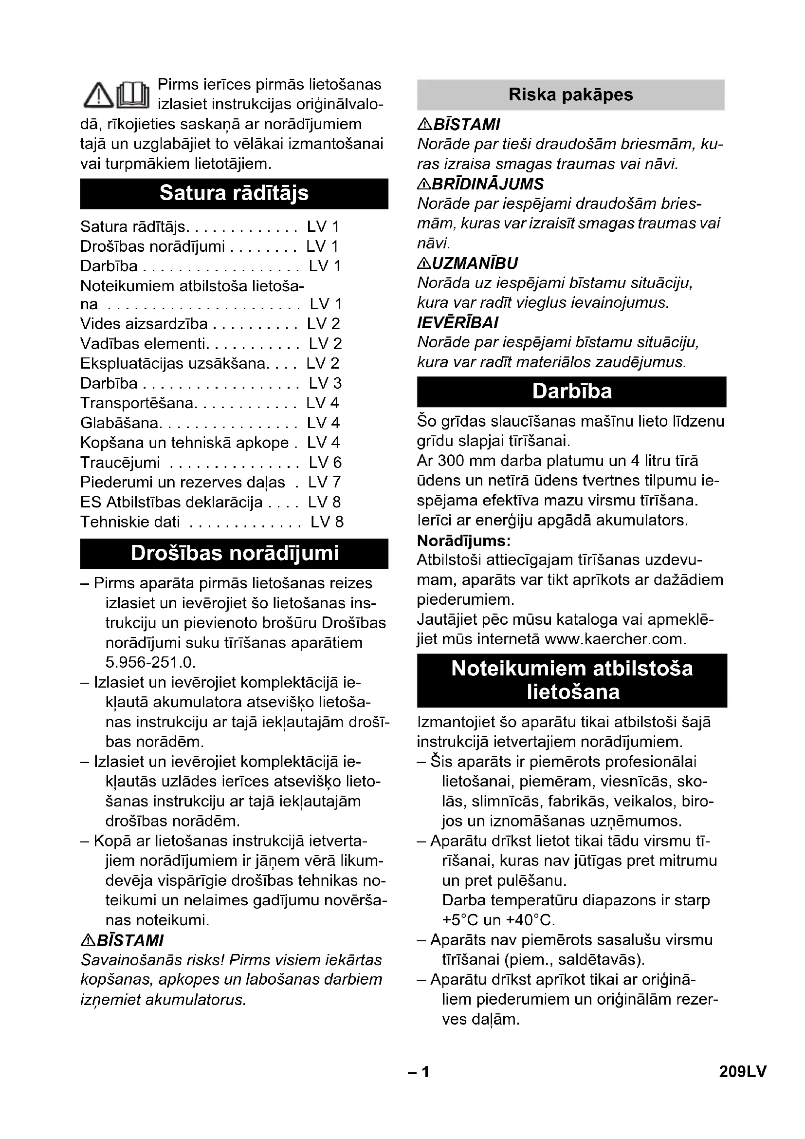Norāde par iespējami bīstamu situāciju, kura var radīt materiālos zaudējumus. Šo grīdas slaucīšanas mašīnu lieto līdzenu grīdu slapjai tīrīšanai. Ar 300 mm darba platumu un 4 litru tīrā ūdens un netīrā ūdens tvertnes tilpumu ie- spējama efektīva mazu virsmu tīrīšana. Ierīci ar enerģiju apgādā akumulators. Norādījums: Atbilstoši attiecīgajam tīrīšanas uzdevu- mam, aparāts var tikt aprīkots ar dažādiem piederumiem. Jautājiet pēc mūsu kataloga vai apmeklē- jiet mūs internetā www.kaercher.com. Izmantojiet šo aparātu tikai atbilstoši šajā instrukcijā ietvertajiem norādījumiem. – Šis aparāts ir piemērots profesionālai lietošanai, piemēram, viesnīcās, sko- lās, slimnīcās, fabrikās, veikalos, biro- jos un iznomāšanas uzņēmumos. – Aparātu drīkst lietot tikai tādu virsmu tī- rīšanai, kuras nav jūtīgas pret mitrumu un pret pulēšanu. Darba temperatūru diapazons ir starp +5°C un +40°C. – Aparāts nav piemērots sasalušu virsmu tīrīšanai (piem., saldētavās). – Aparātu drīkst aprīkot tikai ar oriģinā- liem piederumiem un oriģinālām rezer- ves daļām. Satura rādītājs Satura rādītājs. . . . . . . . . . . . . LV 1 Drošības norādījumi . . . . . . . . LV 1 Darbība . . . . . . . . . . . . . . . . . . LV 1 Noteikumiem atbilstoša lietoša- na . . . . . . . . . . . . . . . . . . . . . . LV 1 Vides aizsardzība . . . . . . . . . . LV 2 Vadības elementi. . . . . . . . . . . LV 2 Ekspluatācijas uzsākšana. . . . LV 2 Darbība . . . . . . . . . . . . . . . . . . LV 3 Transportēšana. . . . . . . . . . . . LV 4 Glabāšana. . . . . . . . . . . . . . . . LV 4 Kopšana un tehniskā apkope . LV 4 Traucējumi . . . . . . . . . . . . . . . LV 6 Piederumi un rezerves daļas . LV 7 ES Atbilstības deklarācija . . . . LV 8 Tehniskie dati . . . . . . . . . . . . . LV 8 Drošības norādījumi Riska pakāpes Darbība Noteikumiem atbilstoša lietošana 209LV– 2 – Aparāts ir piemērots iekštelpu grīdām vai virsmām ar jumta pārsegumu. – Aparāts nav paredzēts koplietošanas satiksmes ceļu tīrīšanai. – Aparāts nav paredzēts izmantošnai sprādzienbīstamās vidēs. Informācija par sastāvdaļām (REACH) Aktuālo informāciju par sastāvdaļām atra- dīsiet: www.kaercher.com/REACH Attēlus skatīt vāka lapā Attēls 1 Rokturis 2 Ūdens sūkņa slēdzis 3 Suku/sūkšanas režīma slēdzis 4 Rokturis aparāta pārnēsāšanai 5 Netīrā ūdens tvertnes rokturis 6 Netīrā ūdens tvertne 7 Tīrā ūdens tvertne 8 Tīrā ūdens tvertnes noslēgs (uzpildes atvere) 9 Akumulators 10 Akumulatora ietvere 11 Tīrīšanas galviņa 12 Pedālis sūkšanas stieņa pacelšanai 13 Stāvēšanas pozīcijas atbloķēšanas svi-