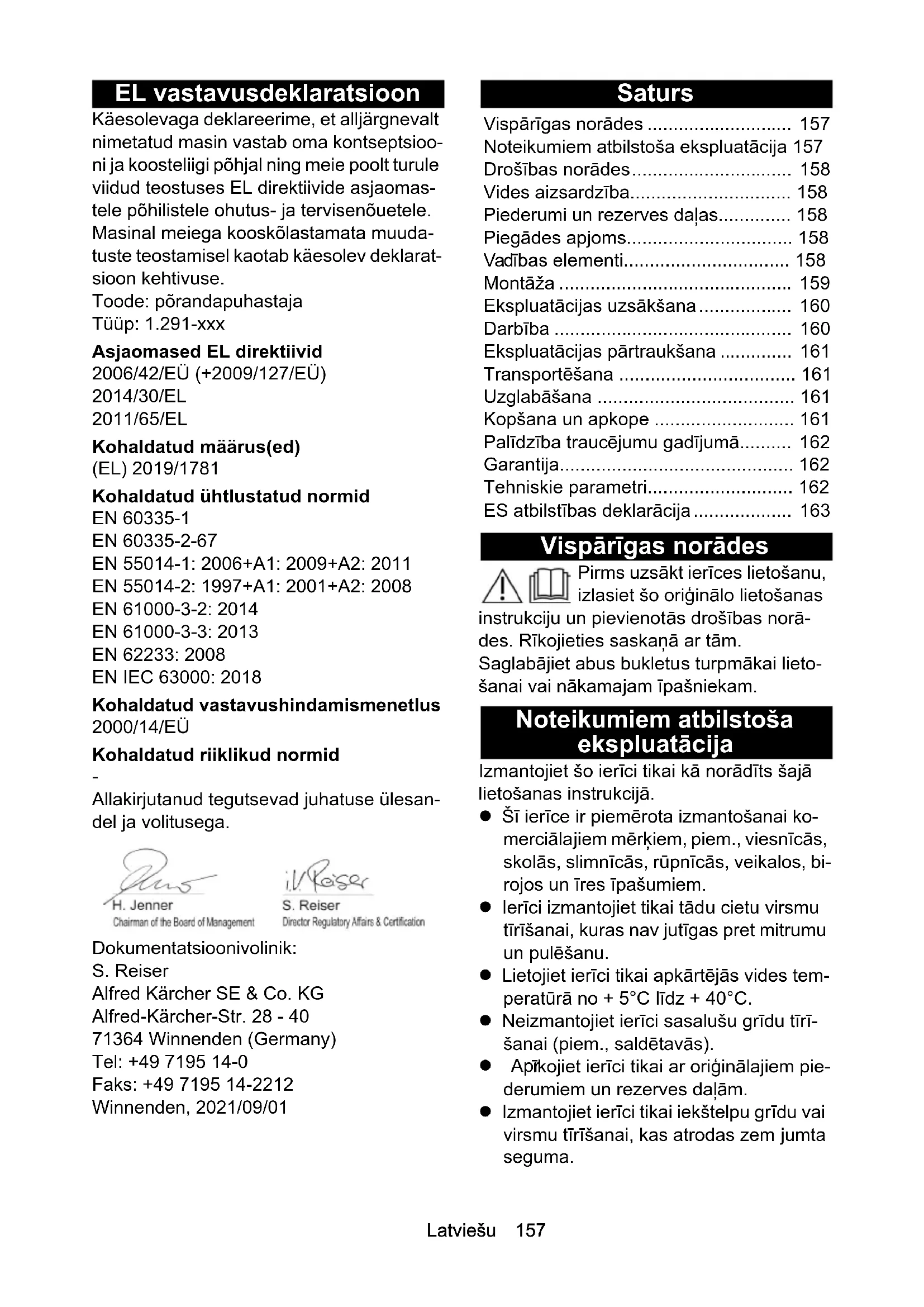 • Allakirjutanud tegutsevad juhatuse ülesan- del ja volitusega. Dokumentatsioonivolinik: S. Reiser Alfred Kärcher SE & Co. KG Alfred-Kärcher-Str. 28 - 40 71364 Winnenden (Germany) Tel: +49 7195 14-0 Faks: +49 7195 14-2212 Winnenden, 2021/09/01 Saturs Vispārīgas norādes Pirms uzsākt ierīces lietošanu, izlasiet šo oriģinālo lietošanas instrukciju un pievienotās drošības norā- des. Rīkojieties saskaņā ar tām. Saglabājiet abus bukletus turpmākai lieto- šanai vai nākamajam īpašniekam. Noteikumiem atbilstoša ekspluatācija Izmantojiet šo ierīci tikai kā norādīts šajā lietošanas instrukcijā. Šī ierīce ir piemērota izmantošanai ko- merciālajiem mērķiem, piem., viesnīcās, skolās, slimnīcās, rūpnīcās, veikalos, bi- rojos un īres īpašumiem. Ierīci izmantojiet tikai tādu cietu virsmu tīrīšanai, kuras nav jutīgas pret mitrumu un pulēšanu. Lietojiet ierīci tikai apkārtējās vides tem- peratūrā no + 5°C līdz + 40°C. Neizmantojiet ierīci sasalušu grīdu tīrī- šanai (piem., saldētavās). Apr īkojiet ierīci tikai ar oriģinālajiem pie- derumiem un rezerves daļām. Izmantojiet ierīci tikai iekštelpu grīdu vai virsmu tīrīšanai, kas atrodas zem jumta seguma. Vispārīgas norādes p. 157