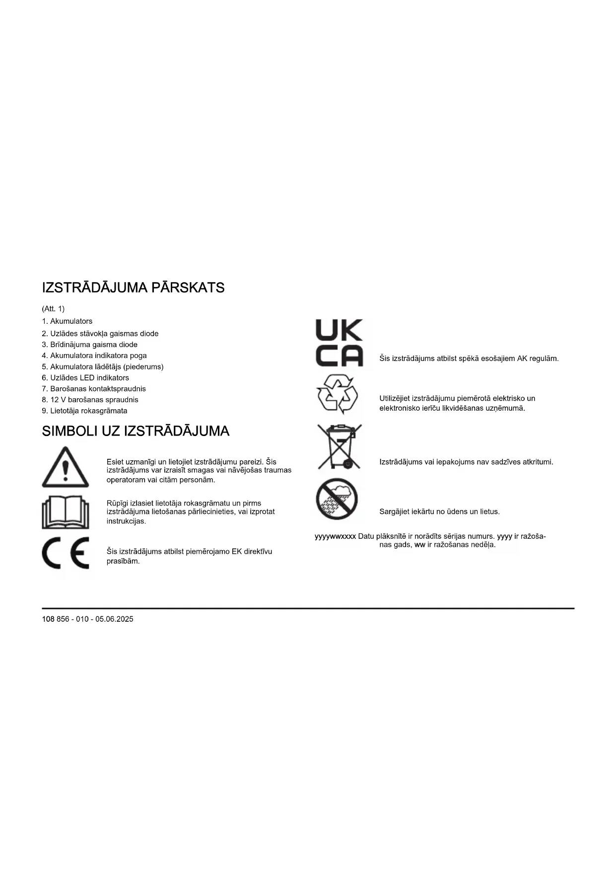 Esiet uzmanīgi un lietojiet izstrādājumu pareizi. Šis izstrādājums var izraisīt smagas vai nāvējošas traumas operatoram vai citām personām. Rūpīgi izlasiet lietotāja rokasgrāmatu un pirms izstrādājuma lietošanas pārliecinieties, vai izprotat instrukcijas. Šis izstrādājums atbilst piemērojamo EK direktīvu prasībām. Šis izstrādājums atbilst spēkā esošajiem AK regulām. Utilizējiet izstrādājumu piemērotā elektrisko un elektronisko ierīču likvidēšanas uzņēmumā. Izstrādājums vai iepakojums nav sadzīves atkritumi. Sargājiet iekārtu no ūdens un lietus. yyyywwxxxx Datu plāksnītē ir norādīts sērijas numurs. yyyy ir ražoša- nas gads, ww ir ražošanas nedēļa. 108 856 - 010 - 05.06.2025Piezīme: Pārējie uz izstrādājuma norādītie simboli/uzlīmes attiecas uz dažu tirdzniecības nozaru prasībām. Produkta bojājumi Mēs neatbildam par mūsu produkta bojājumiem, ja: