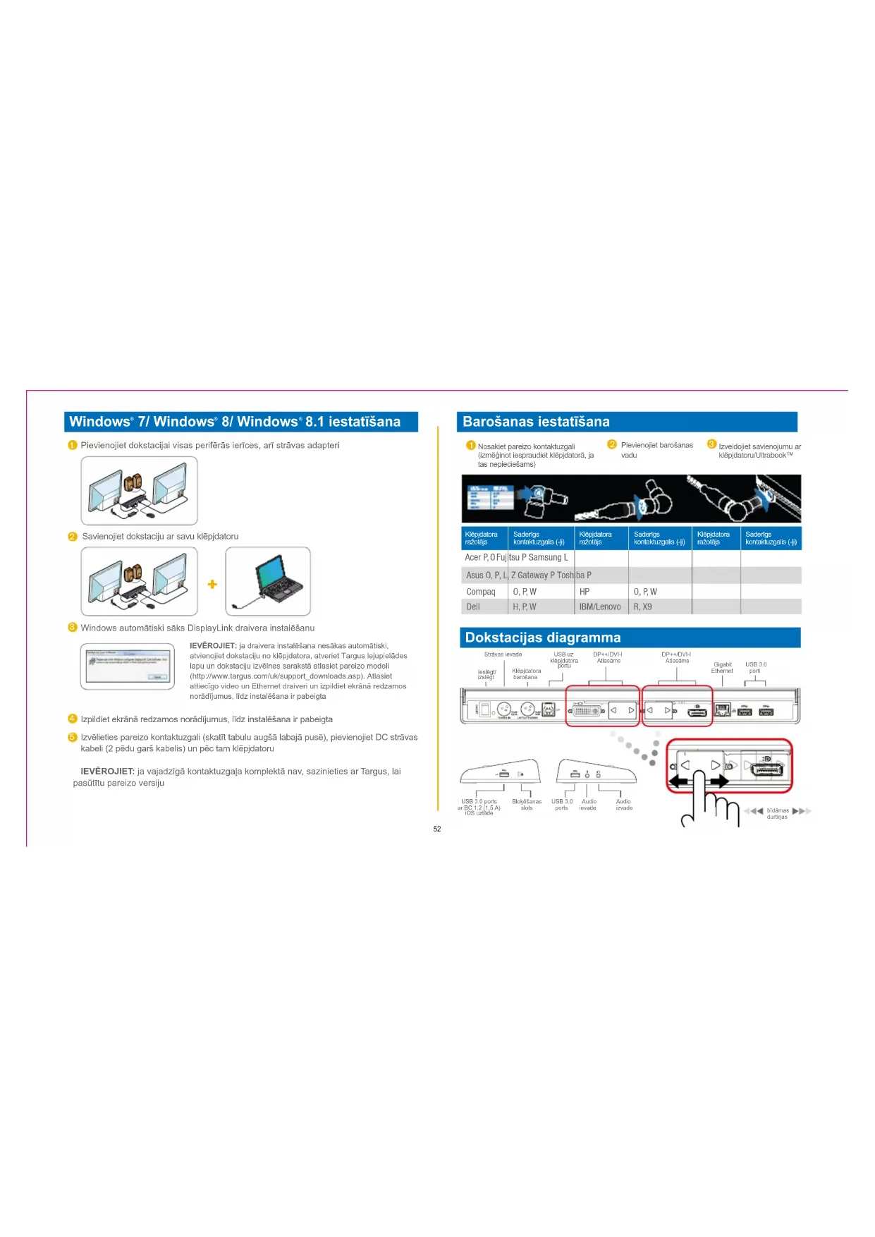 Izveidojiet savienojumu ar klēpjdatoru/Ultrabook™Klēpjdatora ražotājsSaderīgs kontaktuzgalis (-ļi)Klēpjdatora ražotājsSaderīgs kontaktuzgalis (-ļi)Klēpjdatora ražotājsSaderīgs kontaktuzgalis (-ļi) Acer P, O Fujitsu P Samsung L Asus O, P, L, Z Gateway P Toshiba P Compaq O, P, W HP O, P, W Dell H, P, W IBM/Lenovo R, X9 Ieslēgt/ izslēgtUSB uz klēpjdatora portuUSB 3.0 portiStrāvas ievadeKlēpjdatora barošanaGigabit EthernetDP++/DVI-IAtlasāmsDP++/DVI-IAtlasāmsAudio ievadeUSB 3.0 portsAudio izvadeBloķēšanas slotsUSB 3.0 portsar BC 1.2 (1,5 A)iOS uzlāde IEVĒROJIET: ja draivera instalēšana nesākas automātiski, atvienojiet dokstaciju no klēpjdatora, atveriet Targus lejupielādes lapu un dokstaciju izvēlnes sarakstā atlasiet pareizo modeli (http://www.targus.com/uk/support_downloads.asp). Atlasiet attiecīgo video un Ethernet draiveri un izpildiet ekrānā redzamos norādījumus, līdz instalēšana ir pabeigta
