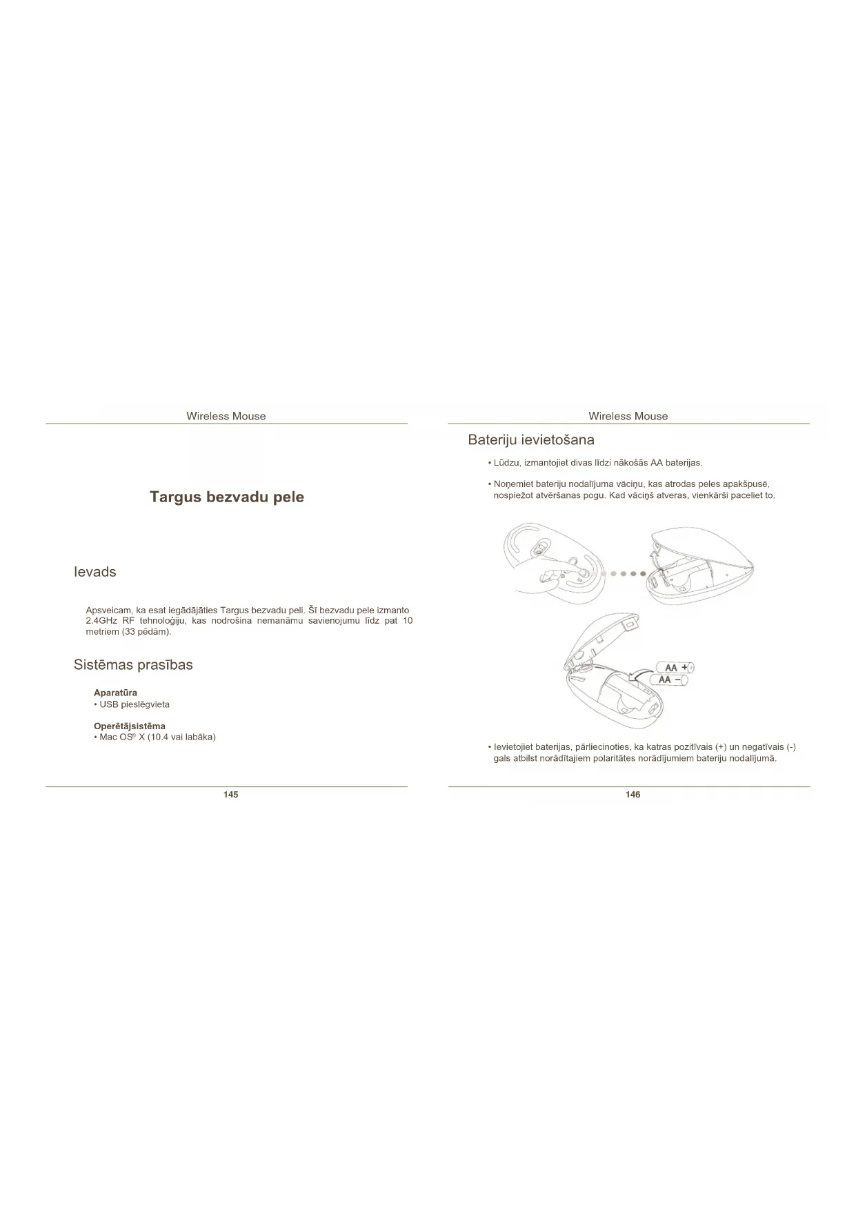 Targus bezvadu pele Apsveicam, ka esat iegādājāties Targus bezvadu peli. Šī bezvadu pele izmanto 2.4GHz RF tehnoloģiju, kas nodrošina nemanāmu savienojumu līdz pat 10 metriem (33 pēdām). Ievads Sistēmas prasības Aparatūra