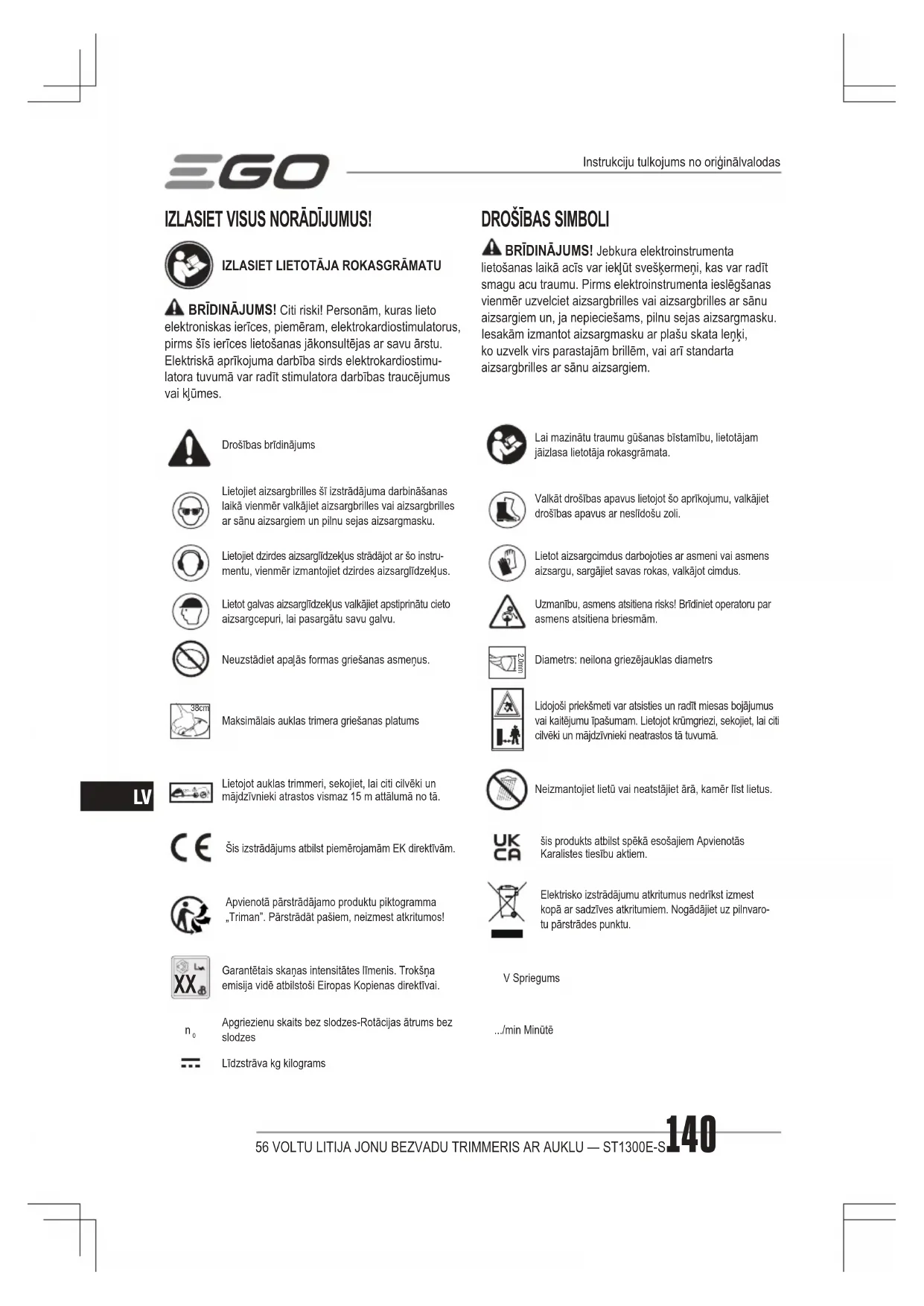 BRĪDINĀJUMS! Jebkura elektroinstrumenta lietošanas laikā acīs var iekļūt svešķermeņi, kas var radīt smagu acu traumu. Pirms elektroinstrumenta ieslēgšanas vienmēr uzvelciet aizsargbrilles vai aizsargbrilles ar sānu aizsargiem un, ja nepieciešams, pilnu sejas aizsargmasku. Iesakām izmantot aizsargmasku ar plašu skata leņķi, ko uzvelk virs parastajām brillēm, vai arī standarta aizsargbrilles ar sānu aizsargiem. Drošības brīdinājumsLai mazinātu traumu gūšanas bīstamību, lietotājam jāizlasa lietotāja rokasgrāmata.Lietojiet aizsargbrilles šī izstrādājuma darbināšanas laikā vienmēr valkājiet aizsargbrilles vai aizsargbrilles ar sānu aizsargiem un pilnu sejas aizsargmasku.Valkāt drošības apavus lietojot šo aprīkojumu, valkājiet drošības apavus ar neslīdošu zoli.Lietojiet dzirdes aizsarglīdzekļus strādājot ar šo instru-mentu, vienmēr izmantojiet dzirdes aizsarglīdzekļus.Lietot aizsargcimdus darbojoties ar asmeni vai asmens aizsargu, sargājiet savas rokas, valkājot cimdus.Lietot galvas aizsarglīdzekļus valkājiet apstiprinātu cieto aizsargcepuri, lai pasargātu savu galvu.Uzmanību, asmens atsitiena risks! Brīdiniet operatoru par asmens atsitiena briesmām.Neuzstādiet apaļās formas griešanas asmeņus. 2.0mmDiametrs: neilona griezējauklas diametrs 38cm Maksimālais auklas trimera griešanas platumsLidojoši priekšmeti var atsisties un radīt miesas bojājumus vai kaitējumu īpašumam. Lietojot krūmgriezi, sekojiet, lai citi cilvēki un mājdzīvnieki neatrastos tā tuvumā. 15m Lietojot auklas trimmeri, sekojiet, lai citi cilvēki un mājdzīvnieki atrastos vismaz 15 m attālumā no tā.Neizmantojiet lietū vai neatstājiet ārā, kamēr līst lietus.Šis izstrādājums atbilst piemērojamām EK direktīvām.šis produkts atbilst spēkā esošajiem Apvienotās Karalistes tiesību aktiem.Apvienotā pārstrādājamo produktu piktogramma „Triman”. Pārstrādāt pašiem, neizmest atkritumos!Elektrisko izstrādājumu atkritumus nedrīkst izmest kopā ar sadzīves atkritumiem. Nogādājiet uz pilnvaro-tu pārstrādes punktu.