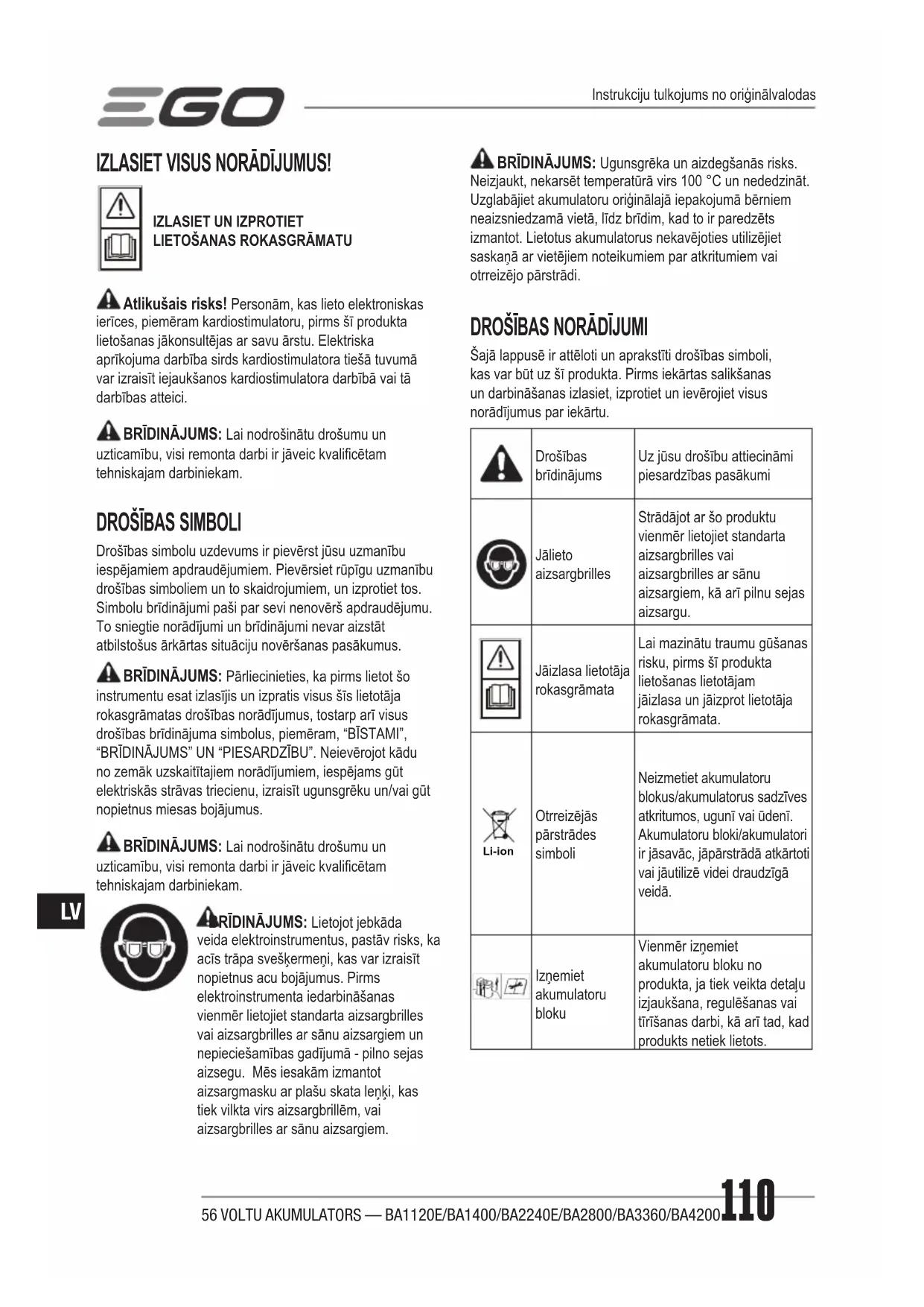 APKOPE ◾ Veiciet uzlādi tikai ar tām uzlādes ierīcēm, kuras ir norādījis ražotājs. Uzlādes ierīce, kas ir piemērota viena veida akumulatoru blokam, var izraisīt ugunsgrēka izcelšanos, ja tā tiek lietota citam akumulatoru blokam. ◾ Lietojiet elektroinstrumentus tikai ar īpaši tiem paredzētajiem akumulatoru blokiem. Jebkādu citu akumulatoru bloku lietošana var radīt traumas vai izraisīt ugunsgrēku. ◾ Ja akumulatoru bloks netiek lietots, sargiet to no citiem metāliskiem objektiem, piemēram, papīra saspraudēm, monētām, atslēgām, naglām, skrūvēm vai citiem neliela izmēra metāliskiem objektiem, kas var izveidot savienojumu starp spailēm. Izveidojot īsslēgumu starp akumulatora spailēm, iespējams gūt apdegumus vai izraisīt ugunsgrēku. ◾ Nepareizos izmantošanas apstākļos no akumulatora var iztecēt šķidrums; izvairieties no saskares ar to. Ja nejauši saskaraties ar šķidrumu, noskalojiet ar ūdeni. Ja šķidrums nonāk saskarē ar acīm, papildus vērsieties pēc medicīniskas palīdzības. No akumulatora iztecējis šķidrums var izraisīt kairinājumu vai apdegumus. ◾ Neizjauciet, neatveriet un nesaplēsiet sekundāros elementus vai akumulatorus. ◾ Sargiet elementus vai akumulatorus no karstuma un uguns. Izvairieties no uzglabāšanas tiešu saules staru ietekmē. ◾ Neveidojiet elementa vai akumulatora īsslēgumu. Neuzglabājiet elementus vai akumulatorus brīvi kastē vai atvilktnē, kur tie var izveidot īsslēgumu viens ar otru vai izveidot īsslēgumu ar citu metāla priekšmetu starpniecību. ◾ Neizņemiet elementu vai akumulatoru no tā oriģinālā iepakojuma, līdz brīdim, kad to ir plānots izmantot. ◾ Nepakļaujiet elementus vai akumulatorus mehāniskam triecienam.56 VOLTU AKUMULATORS — BA1120E/BA1400/BA2240E/BA2800/BA3360/BA4200112