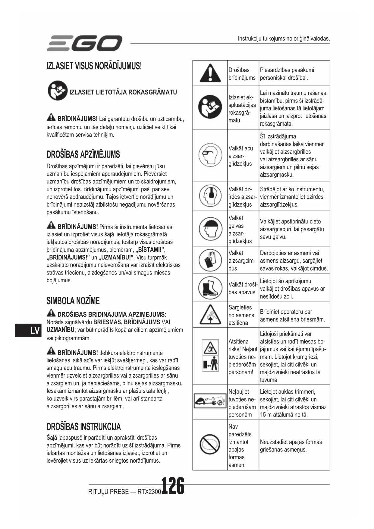 BRĪDINĀJUMS! Izlasiet visus ar šo elektroinstrumentu saistītos drošības brīdinājumus, norādījumus, specikācijas un aplūkojiet attēlus. Visu turpmāk uzskaitīto norādījumu neievērošana var izraisīt elektriskās strāvas triecienu, aizdegšanos un/vai nopietnas traumasSaglabājiet visus brīdinājumus un instrukcijas turpmākai atsaucei. ◾ Izvairieties no bīstamas vides — nelietojiet instrumentus mitrās vai slapjās vietās slīpumā. ◾ Sekojiet, lai aizsargi atrastos paredzētajās vietās un būtu labā darba stāvoklī. ◾ Neturiet rokas un kājas griešanas zonā. ◾ Lai mazinātu traumu rašanās iespējamību, nekādā gadījumā nestrādājiet, stāvot uz trepēm vai uz cita nedroša balsta. Nekad neturiet griešanas ierīci augstāk par ķermeņa vidukli. ◾ Darbarīka lietošanas laikā regulāri pārbaudiet griešanas ierīci vai arī dariet to uzreiz, līdzko konstatējat būtiskas izmaiņas griešanas darbībā. ◾ Lai iegūtu optimālāko rezultātu, akumulatora uzlāde jāveic vietā, kurā temperatūra ir virs 5° un ne augstāka par 40°. Neuzglabājiet akumulatoru ārpus telpām vai automašīnās. ◾ Ja strādājot ar ierīci kāds jums tuvojas, apturiet motoru un griešanas ierīci. ◾ Brīdiniet operatoru par asmens atsitiena briesmām. ◾ Asmens atsitiens var rasties, ja rotējošs asmens saskaras ar priekšmetu, ko tas uzreiz nesagriež. ◾ Asmens atsitiens var būt pietiekami spēcīgs, lai pagrūstu ierīci un/vai operatoru jebkurā virzienā, un, iespējams, zaudētu vadību pār ierīci. ◾ Asmens atsitiens var atgadīties pēkšņi, ja asmens ieķeras, saķeras vai apstājas motors. ◾ Asmens atsitiens biežāk rodas zonās, kur ir grūti saskatīt zāģējamo materiālu. ◾ Nepiestipriniet asmeni pie ierīces, ja nav atbilstoši uzstādītas visas nepieciešamās detaļas. Ja netiek izmantotas atbilstošas detaļas, asmens var nokrist no ierīces un nopietni savainot operatoru un/vai apkārtējos cilvēkus. Atbrīvojieties no asmeņiem, kas jebkādā veidā ir saliekti, līkumaini, ieplaisājuši, salūzuši vai sabojāti. Izmantojiet asu asmeni. Neass asmens var ieķerties un izraisīt atsitienu. ◾ Kustīgs asmens/aukla, kas pēc motora apturēšanas vai sprūda atlaišanas turpina griezties, var radīt traumas. Nenovērsiet uzmanību no asmens/auklas, līdz tie nav pilnībā pārstājuši griezties. ◾ Ar akumulatoru darbināmiem instrumentiem nav jābūt pievienotiem strāvas avotam, tāpēc tie vienmēr ir gatavi darbam. Pat, ja darbarīks nedarbojas, vienmēr sargieties no iespējama apdraudējuma. Ievērojiet piesardzību, veicot apkopes vai uzturēšanas darbus. ◾ Nemazgājiet ar šļūteni; nepieļaujiet ūdens iekļūšanu motorā un elektriskajos savienojumos. ◾ Gadījumos, kas nav aprakstīti šajā rokasgrāmatā, esiet uzmanīgi un rīkojieties prātīgi. Lai saņemtu palīdzību, sazinieties ar EGO klientu apkalpošanas centru.SAGLABĀJIET ŠOS NORĀDĪJUMUS! SPECIFIKĀCIJAS Apgriezienu skaits, strādājot bez slodzesLīdz 450/min.Griezējasmens ABR2300RITUĻU PRESE — RTX2300128