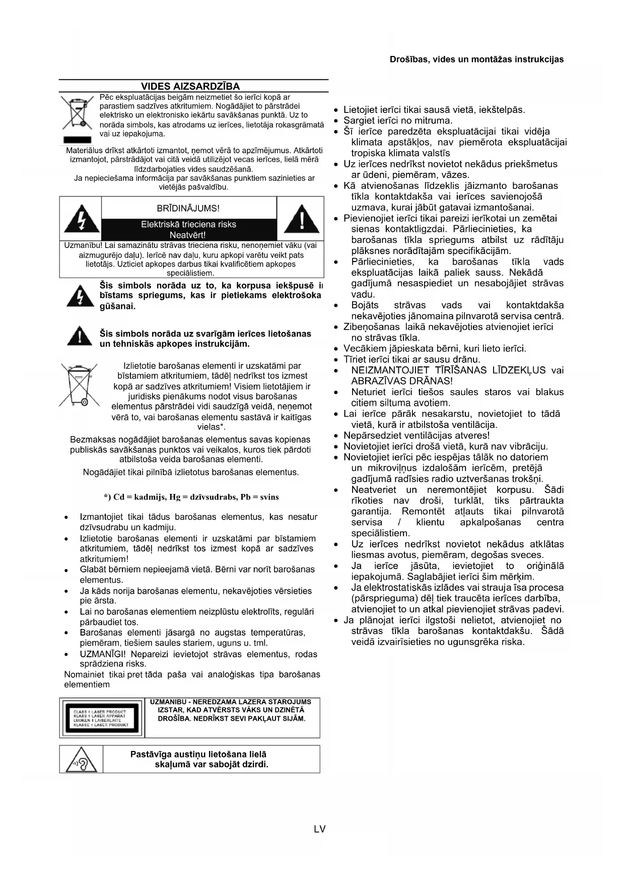 Izlietotie barošanas elementi ir uzskatāmi par bīstamiem atkritumiem, tādēļ nedrīkst tos izmest kopā ar sadzīves atkritumiem!