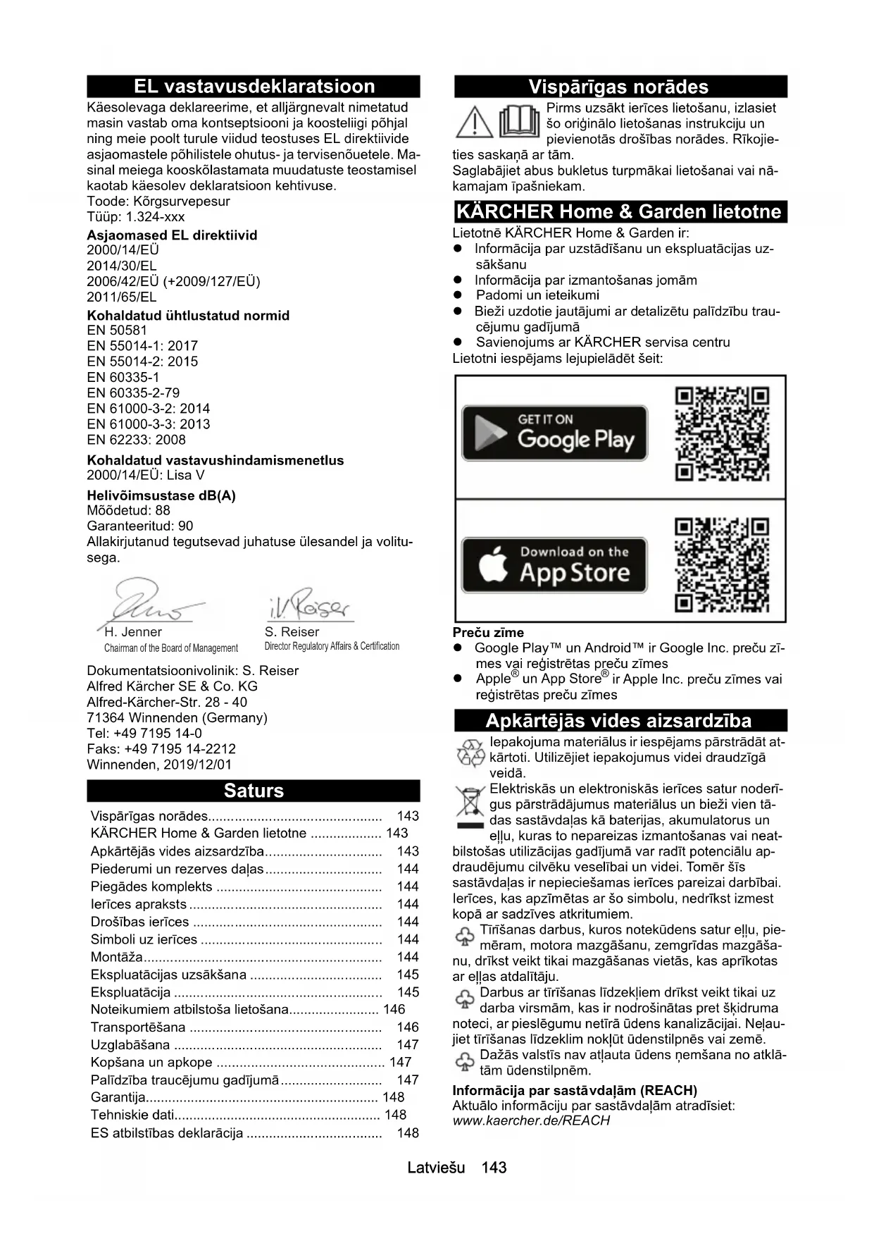 - ir Apple Inc. preču zīmes vai reģistrētas preču zīmes Apkārtējās vides aizsardzība Iepakojuma materiālus ir iespējams pārstrādāt at- kārtoti. Utilizējiet iepakojumus videi draudzīgā veidā. Elektriskās un elektroniskās ierīces satur noderī- gus pārstrādājumus materiālus un bieži vien tā- das sastāvdaļas kā baterijas, akumulatorus un eļļu, kuras to nepareizas izmantošanas vai neat- bilstošas utilizācijas gadījumā var radīt potenciālu ap- draudējumu cilvēku veselībai un videi. Tomēr šīs sastāvdaļas ir nepieciešamas ierīces pareizai darbībai. Ierīces, kas apzīmētas ar šo simbolu, nedrīkst izmest kopā ar sadzīves atkritumiem. Tīr īšanas darbus, kuros notekūdens satur eļļu, pie- mēram, motora mazgāšanu, zemgrīdas mazgāša- nu, drīkst veikt tikai mazgāšanas vietās, kas aprīkotas ar eļļas atdalītāju. Darbus ar tīrīšanas līdzekļiem drīkst veikt tikai uz darba virsmām, kas ir nodrošinātas pret šķidruma noteci, ar pieslēgumu netīrā ūdens kanalizācijai. Neļau- jiet tīrīšanas līdzeklim nokļūt ūdenstilpnēs vai zemē. Dažās valstīs nav atļauta ūdens ņemšana no atklā- tām ūdenstilpnēm. Informācija par sastā vdaļām (REACH) Aktuālo informāciju par sastāvdaļām atradīsiet: www.kaercher.de/REACH Vispārīgas norādes p. 143