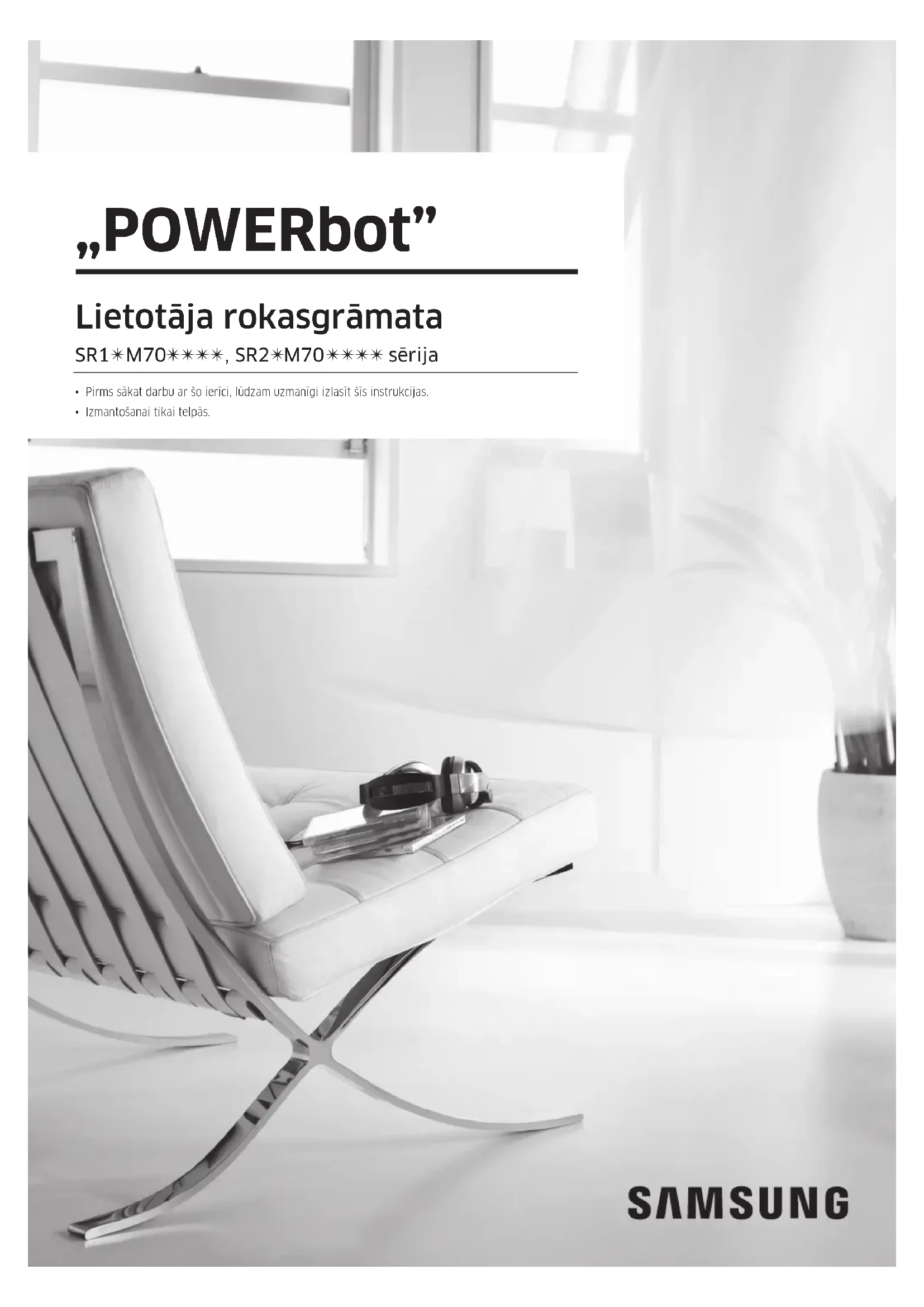 - Lai iegūtu informāciju par Samsung vides saistībām un uz izstrādājumu attiecināmajiem regulējumiem, piem., REACH regulu, apmeklējiet vietni: „ samsung. com/uk/aboutsamsung/samsungelectronics/corporatecitizenship/data_corner.htm”LATVIEŠU-04 Drošības informācija SVARĪGI DROŠĪBAS NORĀDĪJUMI Izmantojot elektroierīci, jāievēro pamata piesardzības pasākumi, tostarp: PIRMS „POWERbot” LIETOŠANAS IZLASIET VISUS NORĀDĪJUMUS. Kad ierīce netiek izmantota vai pirms apkopes darbu veikšanas, atvienojiet to no sienas kontaktligzdas. BRĪDINĀJUMS: lai samazinātu ugunsgrēka, elektrošoka vai traumu risku:
