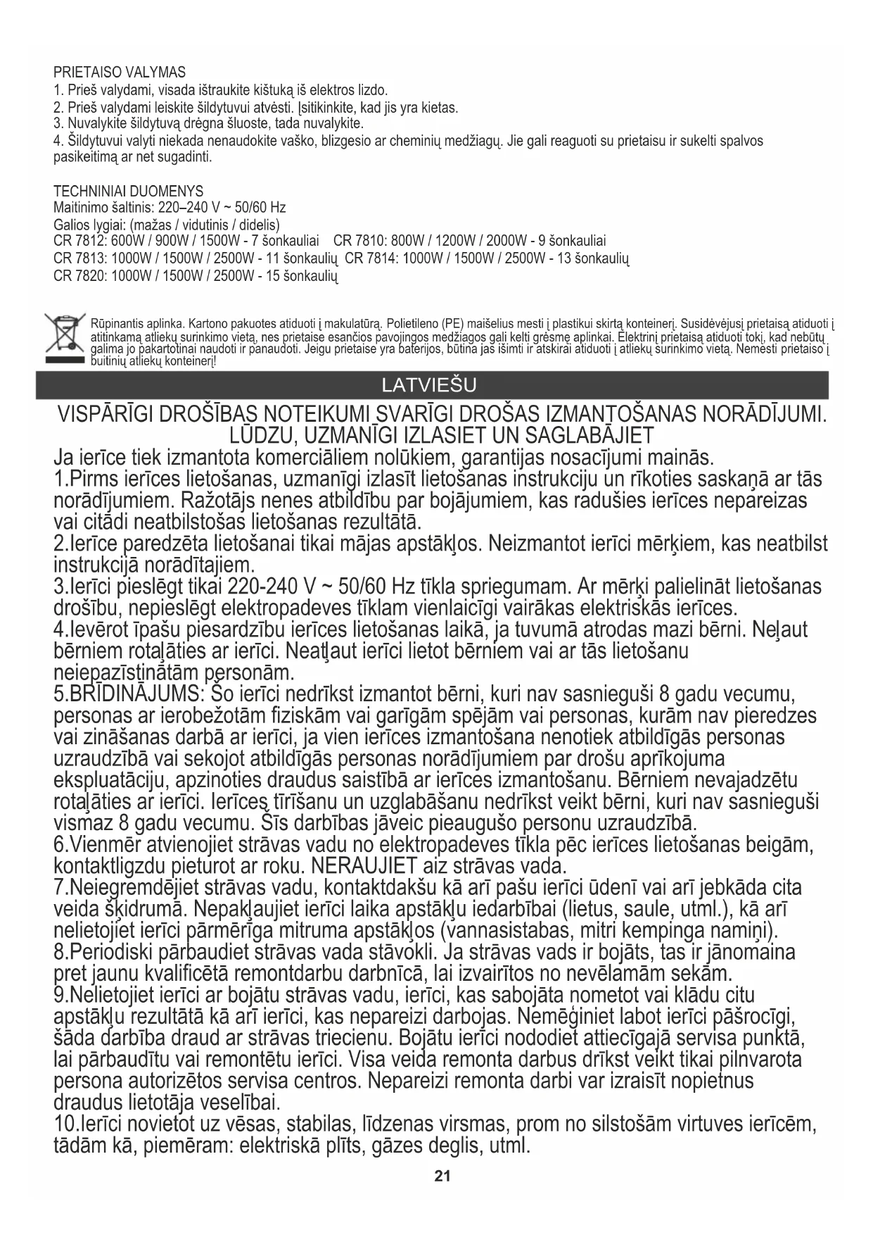 4. Nekad nelietojiet sildītāju tīrīšanai vasku, spīdīgus vai ķīmiskus līdzekļus. Viņi var reaģēt ar ierīci un izraisīt krāsas maiņu vai pat sabojāt. TEHNISKIE DATI Barošanas avots: 220–240 V ~ 50/60 Hz Jaudas līmeņi: (zems / vidējs / augsts) CR 7812: 600W / 900W / 1500W - 7 ribas CR 7810: 800W / 1200W / 2000W - 9 ribas CR 7813: 1000W / 1500W / 2500W - 11 ribas CR 7814: 1000W / 1500W / 2500W - 13 ribas CR 7820: 1000W / 1500W / 2500W - 15 ribas Apkārtējās vides aizsardzība. Kartona iepakojumu, lūdzu, nododiet otreizējai pārstrādei. Polietilēna maisiņus (PE) izmest plastmasas izstrādājumiem paredzētajos konteineros. Lietotās elektropreces nododiet attiecīgajos pieņemšanas punktos. Ierīcē satur bīstamas sastāvdaļas, kas var izraisīt draudus apkārtējai videi. Elektroierīce jānodod tā, lai ierobežotu tās atkārtotu izmantošanu. Ja ierīcē atrodas baterijas, izņemiet tās un nododiet pieņemšanas punktā atsevišķi. Produktu neizmest sadzīves atkritumu konteinerā! EESTI