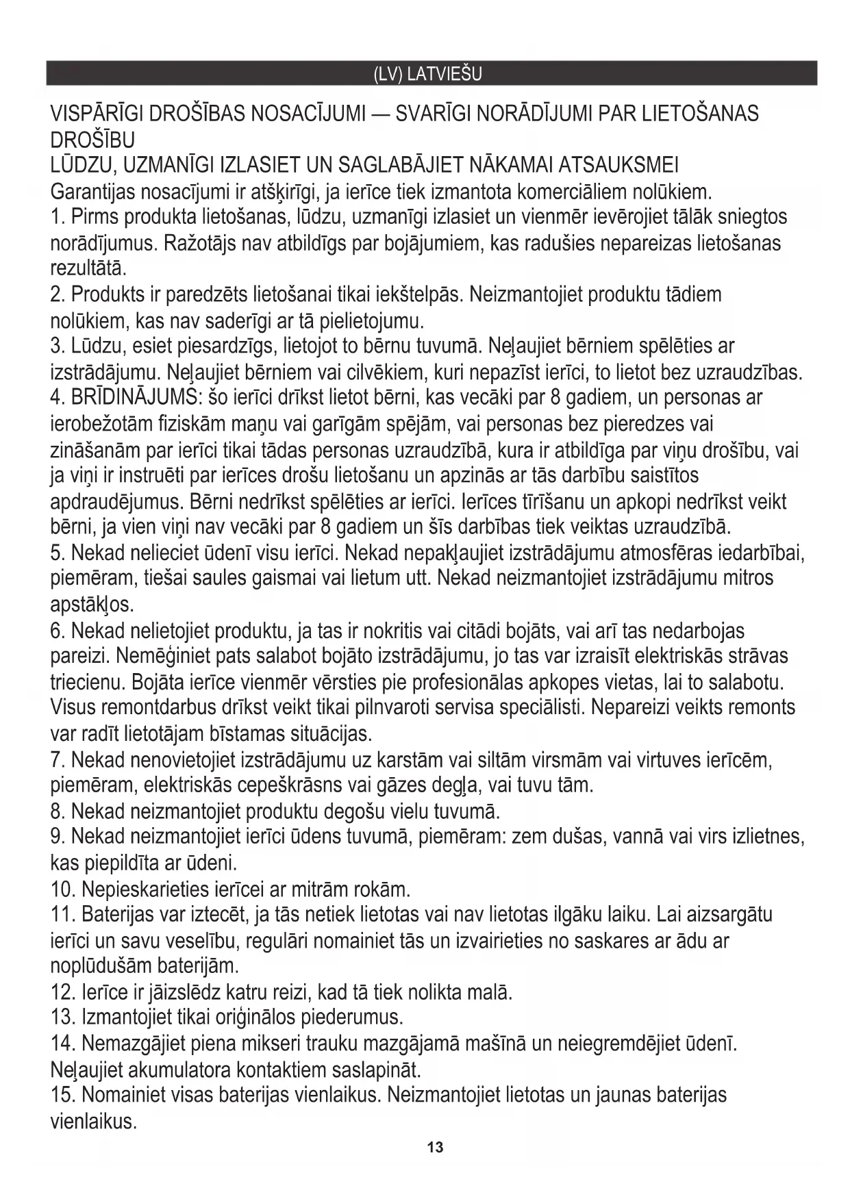 11. Baterijas var iztecet, ja tās netiek lietotas vai nav lietotas ilgaku laiku. Lai aizsargatu ierici un savu veselibu, regulari nomainiet tās un izvairieties no saskares ar ādu ar noplüdušam baterijām.