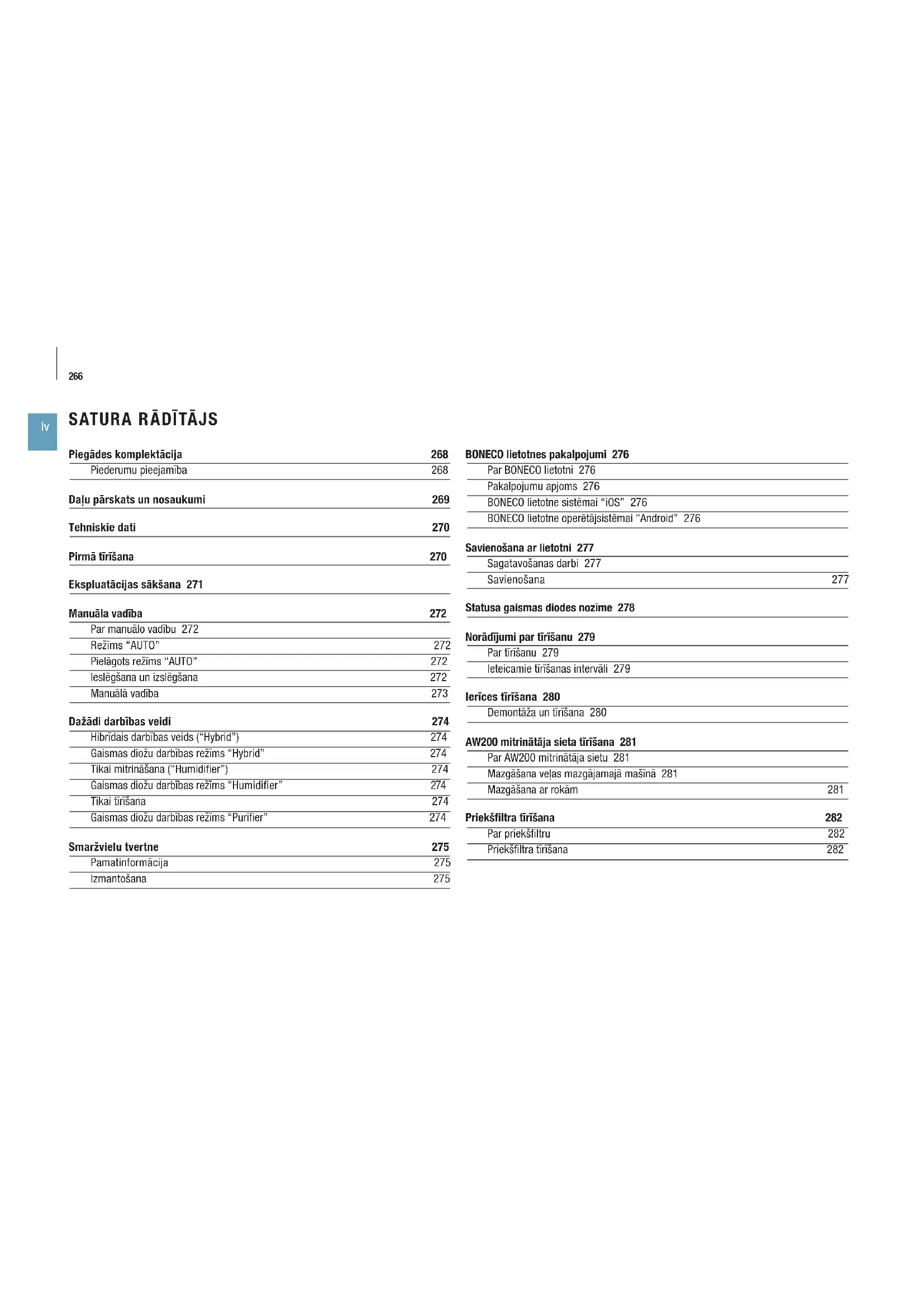 BONECO lietotnes pakalpojumi 276 Par BONECO lietotni 276 Pakalpojumu apjoms 276 BONECO lietotne sistēmai “iOS” 276 BONECO lietotne operētājsistēmai “Android” 276 Savienošana ar lietotni 277 Sagatavošanas darbi 277 Savienošana 277 Statusa gaismas diodes nozīme 278 Norādījumi par tīrīšanu 279 Par tīrīšanu 279 Ieteicamie tīrīšanas intervāli 279 Ierīces tīrīšana 280 Demontāža un tīrīšana 280 AW200 mitrinātāja sieta tīrīšana 281 Par AW200 mitrinātāja sietu 281 Mazgāšana veļas mazgājamajā mašīnā 281 Mazgāšana ar rokām 281 Priekšfiltra tīrīšana 282 Par priekšfiltru 282 Priekšfiltra tīrīšana 282 Piegādes komplektācija 268 Piederumu pieejamība 268 Daļu pārskats un nosaukumi 269 Tehniskie dati 270 Pirmā tīrīšana 270 Ekspluatācijas sākšana 271 Manuāla vadība 272 Par manuālo vadību 272 Režīms “AUTO” 272 Pielāgots režīms “AUTO” 272 Ieslēgšana un izslēgšana 272 Manuālā vadība 273 Dažādi darbības veidi 274 Hibrīdais darbības veids (“Hybrid”) 274 Gaismas diožu darbības režīms “Hybrid” 274 Tikai mitrināšana (“Humidifier”) 274 Gaismas diožu darbības režīms “Humidifier” 274 Tikai tīrīšana 274 Gaismas diožu darbības režīms “Purifier” 274 Smaržvielu tvertne 275 Pamatinformācija 275 Izmantošana 275 SATURA RĀDĪTĀJSPiederumu nomaiņa 283 A7017 Ionic Silver Stick