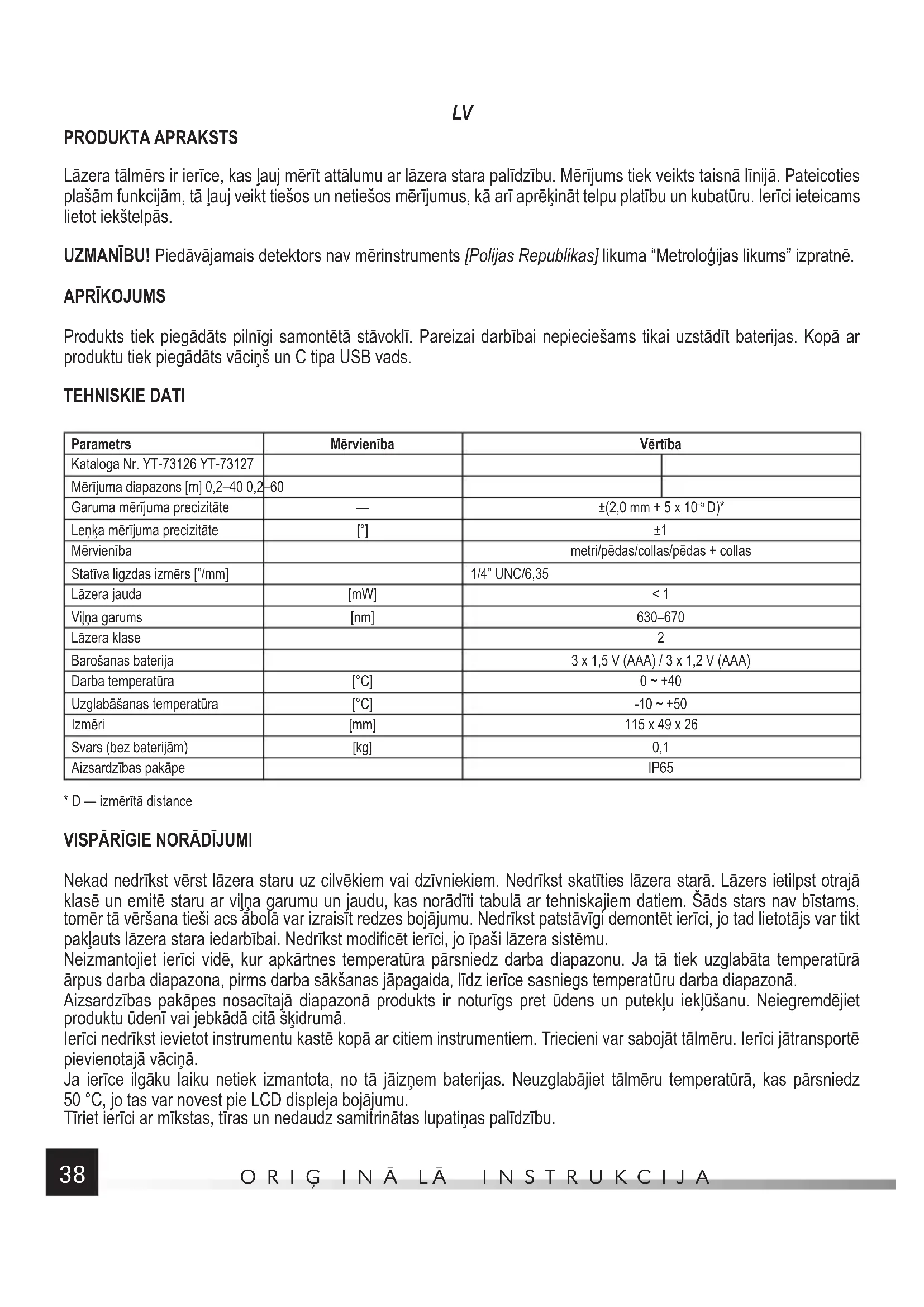 Nekad nedrīkst vērst lāzera staru uz cilvēkiem vai dzīvniekiem. Nedrīkst skatīties lāzera starā. Lāzers ietilpst otrajā klasē un emitē staru ar viļņa garumu un jaudu, kas norādīti tabulā ar tehniskajiem datiem. Šāds stars nav bīstams, tomēr tā vēršana tieši acs ābolā var izraisīt redzes bojājumu. Nedrīkst patstāvīgi demontēt ierīci, jo tad lietotājs var tikt pakļauts lāzera stara iedarbībai. Nedrīkst modificēt ierīci, jo īpaši lāzera sistēmu. Neizmantojiet ierīci vidē, kur apkārtnes temperatūra pārsniedz darba diapazonu. Ja tā tiek uzglabāta temperatūrā ārpus darba diapazona, pirms darba sākšanas jāpagaida, līdz ierīce sasniegs temperatūru darba diapazonā. Aizsardzības pakāpes nosacītajā diapazonā produkts ir noturīgs pret ūdens un putekļu iekļūšanu. Neiegremdējiet produktu ūdenī vai jebkādā citā šķidrumā. Ierīci nedrīkst ievietot instrumentu kastē kopā ar citiem instrumentiem. Triecieni var sabojāt tālmēru. Ierīci jātransportē pievienotajā vāciņā. Ja ierīce ilgāku laiku netiek izmantota, no tā jāizņem baterijas. Neuzglabājiet tālmēru temperatūrā, kas pārsniedz 50 °C, jo tas var novest pie LCD displeja bojājumu. Tīriet ierīci ar mīkstas, tīras un nedaudz samitrinātas lupatiņas palīdzību.ORIĢ INĀ L Ā INSTRUKCIJA