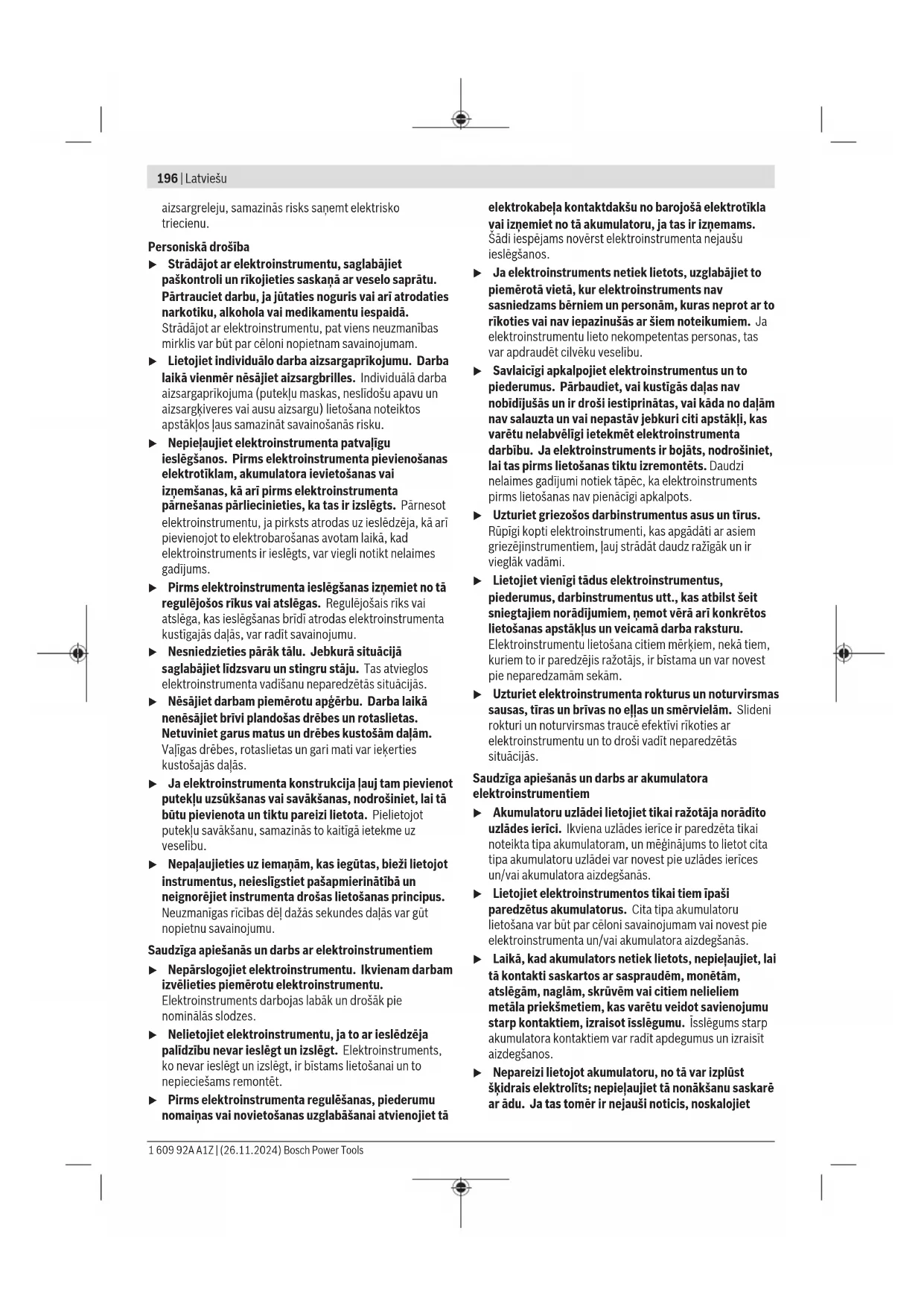 Šajā pamācībā norādītais vibrācijas līmenis un instrumenta radītā trokšņa vērtība ir izmērīta atbilstoši standartā noteiktajai procedūrai un var tikt izmantota elektroinstrumentu savstarpējai salīdzināšanai. To var izmantot arī vibrācijas un trokšņa radītās papildu slodzes iepriekšējai novērtēšanai. Šeit norādītais svārstību līmenis un instrumenta radītā trokšņa vērtība ir attiecināma uz elektroinstrumenta galvenajiem pielietojuma veidiem. Ja elektroinstruments tiek lietots netipiskiem mērķiem, kopā ar netipiskiem darbinstrumentiem vai nav vajadzīgajā veidā apkalpots, tā svārstību līmenis un radītā trokšņa vērtība var atšķirties no šeit norādītajām vērtībām. Tas var ievērojami palielināt svārstību un trokšņa radīto papildu slodzi kopējam darba laika posmam. Lai precīzi izvērtētu svārstību un trokšņa radīto papildu slodzi zināmam darba laika posmam, jāņem vērā arī laiks, kad elektroinstruments ir izslēgts vai arī darbojas, taču faktiski netiek izmantots paredzētā darba veikšanai. Tas var ievērojami samazināt svārstību un trokšņa radīto papildu slodzi kopējam darba laika posmam. Veiciet papildu pasākumus, lai pasargātu strādājošo personu no vibrācijas kaitīgās iedarbības, piemēram, savlaicīgi 1 609 92A A1Z | (26.11.2024) Bosch Power ToolsLatviešu | 199 veiciet elektroinstrumenta un darbinstrumentu apkalpošanu, uzturiet rokas siltas un pareizi plānojiet darbu. Akumulators Bosch pārdod akumulatora elektriskos darbinstrumentus arī bez akumulatora. Tas, vai Jūsu elektriskā darbinstrumenta piegādes komplektācijā ir iekļauts akumulators, ir norādīts uz iesaiņojuma. Akumulatora uzlāde u Izmantojiet vienīgi tehniskajos datos norādītās uzlādes ierīces. Vienīgi šī uzlādes ierīce ir piemērota jūsu elektroinstrumentā izmantojamā litija-jonu akumulatora uzlādei. Norāde: atbilstoši starptautiskajiem kravu pārvadāšanas noteikumiem litija jonu akumulatori tiek piegādāti daļēji uzlādētā stāvoklī. Lai nodrošinātu pilnu akumulatora jaudu, pirms pirmās lietošanas reizes pilnībā uzlādējiet akumulatoru. Akumulatora ielikšana Ievietojiet uzlādēto akumulatoru akumulatora stiprinājumā, līdz tas tiek nofiksēts. Akumulatora izņemšana Lai izņemtu akumulatoru, nospiediet akumulatora atbrīvošanas taustiņu un izvelciet akumulatoru. Nedarbojieties ar spēku. Akumulatoram 2 ir divpakāpju fiksators, kas neļauj tam izkrist, kad nejauši nospiež akumulatora atbrīvošanas pogu. Kamēr akumulators ir ielikts elektroinstrumentā, to notur atspere. Akumulatora uzlādes pakāpes indikators Piezīme: ne visiem akumulatoru tipiem ir uzlādes līmeņa indikators. Akumulatora uzlādes pakāpes indikatora zaļās LEDs diodes parāda akumulatora uzlādes pakāpi. Vadoties no drošības apsvērumiem, uzlādes pakāpe ir nolasāma tikai tad, ja elektroinstruments atrodas miera stāvoklī. Lai nolasītu akumulatora uzlādes pakāpi, nospiediet akumulatora uzlādes pakāpes nolasīšanas taustiņu vai . Tas iespējams arī tad, ja akumulators ir izņemts no elektroinstrumenta. Ja pēc akumulatora uzlādes pakāpes nolasīšanas taustiņa nospiešanas neiedegas neviena no uzlādes pakāpes indikatora LED diodēm, tas nozīmē, ka akumulators ir bojāts un to nepieciešams nomainīt. Akumulatora tips GBA 18V... LED Uzlādes līmenis Pastāvīgi deg 3zaļas LED diodes 60–100% Pastāvīgi deg 2zaļas LED diodes 30–60% LED Uzlādes līmenis Pastāvīgi deg 1zaļa LED diode 5–30% Mirgo 1zaļa LED diode 0–5% Akumulatora tips ProCORE18V... LED Uzlādes līmenis Pastāvīgi deg 5zaļas LED diodes 80–100% Pastāvīgi deg 4zaļas LED diodes 60–80% Pastāvīgi deg 3zaļas LED diodes 40–60% Pastāvīgi deg 2zaļas LED diodes 20–40% Pastāvīgi deg 1zaļa LED diode 5–20% Mirgo 1zaļa LED diode 0–5% Pareiza apiešanās ar akumulatoru Sargājiet akumulatoru no mitruma un ūdens. Uzglabājiet akumulatoru pie temperatūras no −20°C līdz 50°C. Neatstājiet akumulatoru karstumā, piemēram, vasaras laikā neatstājiet to automašīnā. Laiku pa laikam iztīriet akumulatora ventilācijas atvērumus ar mīkstu, tīru un sausu otu. Ja manāmi samazinās instrumenta darbības laiks starp akumulatora uzlādēm, tas norāda, ka akumulators ir nolietojies un to nepieciešams nomainīt. Ievērojiet norādījumus par atbrīvošanos no nolietotajiem izstrādājumiem. Montāža u Pirms jebkādu darbu veikšanas pie elektroinstrumenta (piem. apkope, instrumentu maiņa utt.) izņemiet akumulatoru no elektroinstrumenta. Ja nejauši nospiež ieslēdzēju/ izslēdzēju, pastāv savainojumu risks. Zāģa asmens iestiprināšana vai nomaiņa u Veicot instrumenta montāžu vai iestiprināmo darbinstrumentu nomaiņu, uzvelciet aizsargcimdus. Iestiprināmie darbinstrumenti ir asi un ilgstošas lietošanas laikā var sakarst. u Nomainot zāģa asmeņus, sekojiet, lai asmens stiprinājumam nebūtu pielipušas zāģējamā materiāla paliekas (piemēram, koka vai metāla skaidas). Zāģa asmens izvēle Iestipriniet vienīgi zāģa asmeņus ar 1/2" universālo kātu. Zāģa asmenim nav jābūt garākam, nekā tas ir nepieciešams zāģējumu veidošanai paredzētajā dziļumā. Zāģa asmens iestiprināšana (attēlsA) Spēcīgi iespiediet zāģa asmeni(1) zāģa asmens stiprinājumā(4), līdz tas tur fiksējas ar skaidri sadzirdamu Bosch Power Tools 1 609 92A A1Z | (26.11.2024)200 | Latviešu troksni. Fiksējošā aptvere(3) par aptuveni 90° un fiksē zāaģa asmeni. Ja zāģa asmens(1) nav fiksējies, pagrieziet fiksējošo aptveri(3) par aptuveni 90° bultas virzienā, līdz tā fiksējas atvērtā stāvoklī un noskan fiksatora klikšķis. Tad vēlreiz iespiediet zāģa asmenizāģa asmens stiprinājumā(4). u Pārbaudiet, vai zāģa asmens ir stingri iestiprināts, pavelkot to ārā no stiprinājuma. Slikti iestiprināts zāģa asmens var izkrist no stiprinājuma un