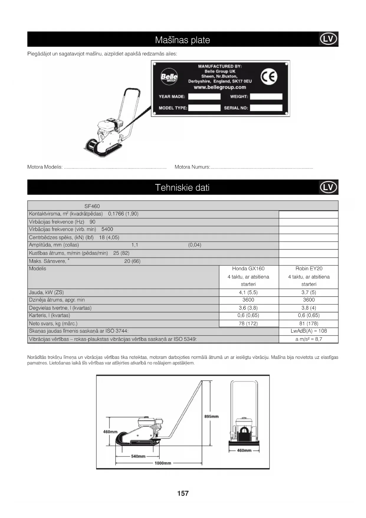 (kvadrātpēdas) 0,1766 (1,90) Virbācijas frekvence (Hz) 90 Virbācijas frekvence (virb. min) 5400 Centrbēdzes spēks, (kN) (lbf) 18 (4,05) Amplitūda, mm (collas) 1,1 (0,04) Kustības ātrums, m/min (pēdas/min) 25 (82) Maks. Sānsvere, ˚ 20 (66) Modelis Honda GX160 Robin EY20 4 taktu, ar atsitiena 4 taktu, ar atsitiena starteri starteri Jauda, kW (ZS) 4,1 (5,5) 3,7 (5) Dzinēja ātrums, apgr. min 3600 3600 Degvielas tvertne, l (kvartas) 3,6 (3,8) 3,8 (4) Karteris, l (kvartas) 0,6 (0,65) 0,6 (0,65) Neto svars, kg (mārc.) 78 (172) 81 (178) Skaņas jaudas līmenis saskaņā ar ISO 3744: LwAdB(A) = 108 Vibrācijas vērtības – rokas-plaukstas vibrācijas vērtība saskaņā ar ISO 5349: a m/s² = 8,7 Norādītās trokšņu līmeņa un vibrācijas vērtības tika noteiktas, motoram darbojoties normālā ātrumā un ar ieslēgtu vibrāciju. Mašīna bija novietota uz elastīgas pamatnes. Lietošanas laikā šīs vērtības var atšķirties atkarībā no reālajiem apstākļiem.158 Drošības instrukcijas (visiem Light sērijas izstrādājumiem)