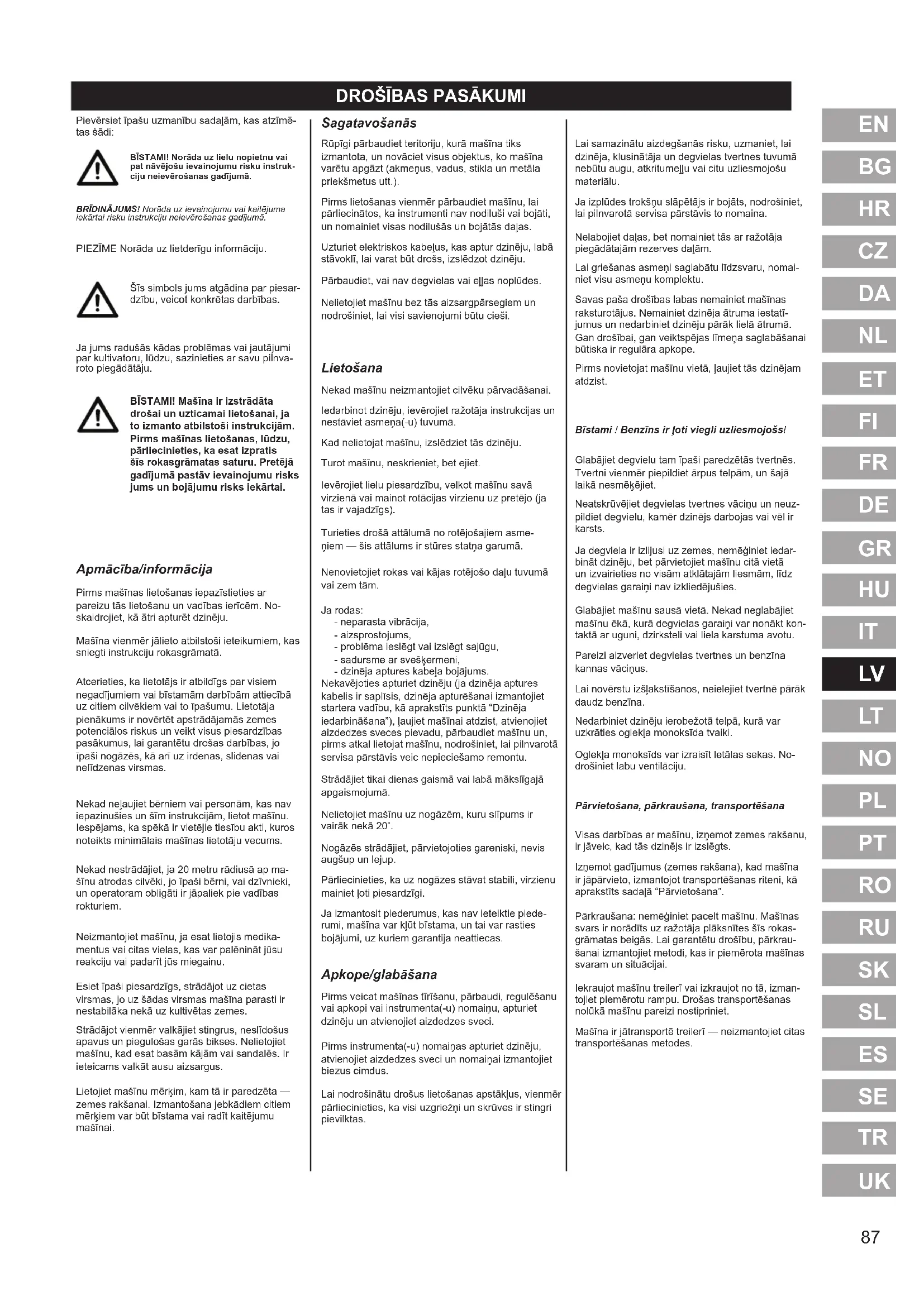 Sagatavošanās Rūpīgi pārbaudiet teritoriju, kurā mašīna tiks izmantota, un novāciet visus objektus, ko mašīna varētu apgāzt (akmeņus, vadus, stikla un metāla priekšmetus utt.). Pirms lietošanas vienmēr pārbaudiet mašīnu, lai pārliecinātos, ka instrumenti nav nodiluši vai bojāti, un nomainiet visas nodilušās un bojātās daļas. Uzturiet elektriskos kabeļus, kas aptur dzinēju, labā stāvoklī, lai varat būt drošs, izslēdzot dzinēju. Pārbaudiet, vai nav degvielas vai eļļas noplūdes. Nelietojiet mašīnu bez tās aizsargpārsegiem un nodrošiniet, lai visi savienojumi būtu cieši. Lietošana Nekad mašīnu neizmantojiet cilvēku pārvadāšanai. Iedarbinot dzinēju, ievērojiet ražotāja instrukcijas un nestāviet asmeņa(-u) tuvumā. Kad nelietojat mašīnu, izslēdziet tās dzinēju. Turot mašīnu, neskrieniet, bet ejiet. Ievērojiet lielu piesardzību, velkot mašīnu savā virzienā vai mainot rotācijas virzienu uz pretējo (ja tas ir vajadzīgs). Turieties drošā attālumā no rotējošajiem asme- ņiem — šis attālums ir stūres statņa garumā. Nenovietojiet rokas vai kājas rotējošo daļu tuvumā vai zem tām. Ja rodas: - neparasta vibrācija, - aizsprostojums, - problēma ieslēgt vai izslēgt sajūgu, - sadursme ar svešķermeni, - dzinēja aptures kabeļa bojājums. Nekavējoties apturiet dzinēju (ja dzinēja aptures kabelis ir saplīsis, dzinēja apturēšanai izmantojiet startera vadību, kā aprakstīts punktā “Dzinēja iedarbināšana”), ļaujiet mašīnai atdzist, atvienojiet aizdedzes sveces pievadu, pārbaudiet mašīnu un, pirms atkal lietojat mašīnu, nodrošiniet, lai pilnvarotā servisa pārstāvis veic nepieciešamo remontu. Strādājiet tikai dienas gaismā vai labā mākslīgajā apgaismojumā. Nelietojiet mašīnu uz nogāzēm, kuru slīpums ir vairāk nekā 20°. Nogāzēs strādājiet, pārvietojoties gareniski, nevis augšup un lejup. Pārliecinieties, ka uz nogāzes stāvat stabili, virzienu mainiet ļoti piesardzīgi. Ja izmantosit piederumus, kas nav ieteiktie piede- rumi, mašīna var kļūt bīstama, un tai var rasties bojājumi, uz kuriem garantija neattiecas. Apkope/glabāšana Pirms veicat mašīnas tīrīšanu, pārbaudi, regulēšanu vai apkopi vai instrumenta(-u) nomaiņu, apturiet dzinēju un atvienojiet aizdedzes sveci. Pirms instrumenta(-u) nomaiņas apturiet dzinēju, atvienojiet aizdedzes sveci un nomaiņai izmantojiet biezus cimdus. Lai nodrošinātu drošus lietošanas apstākļus, vienmēr pārliecinieties, ka visi uzgriežņi un skrūves ir stingri pievilktas. Lai samazinātu aizdegšanās risku, uzmaniet, lai dzinēja, klusinātāja un degvielas tvertnes tuvumā nebūtu augu, atkritumeļļu vai citu uzliesmojošu materiālu. Ja izplūdes trokšņu slāpētājs ir bojāts, nodrošiniet, lai pilnvarotā servisa pārstāvis to nomaina. Nelabojiet daļas, bet nomainiet tās ar ražotāja piegādātajām rezerves daļām. Lai griešanas asmeņi saglabātu līdzsvaru, nomai- niet visu asmeņu komplektu. Savas paša drošības labas nemainiet mašīnas raksturotājus. Nemainiet dzinēja ātruma iestatī- jumus un nedarbiniet dzinēju pārāk lielā ātrumā. Gan drošībai, gan veiktspējas līmeņa saglabāšanai būtiska ir regulāra apkope. Pirms novietojat mašīnu vietā, ļaujiet tās dzinējam atdzist. Bīstami ! Benzīns ir ļoti viegli uzliesmojošs! Glabājiet degvielu tam īpaši paredzētās tvertnēs. Tvertni vienmēr piepildiet ārpus telpām, un šajā laikā nesmēķējiet. Neatskrūvējiet degvielas tvertnes vāciņu un neuz- pildiet degvielu, kamēr dzinējs darbojas vai vēl ir karsts. Ja degviela ir izlijusi uz zemes, nemēģiniet iedar- bināt dzinēju, bet pārvietojiet mašīnu citā vietā un izvairieties no visām atklātajām liesmām, līdz degvielas garaiņi nav izkliedējušies. Glabājiet mašīnu sausā vietā. Nekad neglabājiet mašīnu ēkā, kurā degvielas garaiņi var nonākt kon- taktā ar uguni, dzirksteli vai liela karstuma avotu. Pareizi aizveriet degvielas tvertnes un benzīna kannas vāciņus. Lai novērstu izšļakstīšanos, neielejiet tvertnē pārāk daudz benzīna. Nedarbiniet dzinēju ierobežotā telpā, kurā var uzkrāties oglekļa monoksīda tvaiki. Oglekļa monoksīds var izraisīt letālas sekas. No- drošiniet labu ventilāciju. Pārvietošana, pārkraušana, transportēšana Visas darbības ar mašīnu, izņemot zemes rakšanu, ir jāveic, kad tās dzinējs ir izslēgts. Izņemot gadījumus (zemes rakšana), kad mašīna ir jāpārvieto, izmantojot transportēšanas riteni, kā aprakstīts sadaļā “Pārvietošana”. Pārkraušana: nemēģiniet pacelt mašīnu. Mašīnas svars ir norādīts uz ražotāja plāksnītes šīs rokas- grāmatas beigās. Lai garantētu drošību, pārkrau- šanai izmantojiet metodi, kas ir piemērota mašīnas svaram un situācijai. Iekraujot mašīnu treilerī vai izkraujot no tā, izman- tojiet piemērotu rampu. Drošas transportēšanas nolūkā mašīnu pareizi nostipriniet. Mašīna ir jātransportē treilerī — neizmantojiet citas transportēšanas metodes.88
