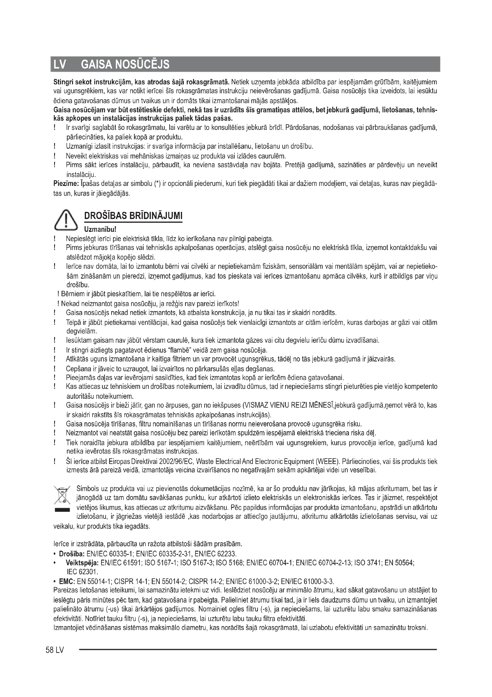 Uzmanību! ! Nepieslēgt ierīci pie elektriskā tīkla, līdz ko ierīkošana nav pilnīgi pabeigta. ! Pirms jebkuras tīrīšanas vai tehniskās apkalpošanas operācijas, atslēgt gaisa nosūcēju no elektriskā tīkla, izņemot kontaktdakšu vai atslēdzot mājokļa kopējo slēdzi. ! Ierīce nav domāta, lai to izmantotu bērni vai cilvēki ar nepietiekamām ziskām, sensoriālām vai mentālām spējām, vai ar nepietieko- šām zināšanām un pieredzi, izņemot gadījumus, kad tos pieskata vai ierīces izmantošanu apmāca cilvēks, kurš ir atbildīgs par viņu drošību. ! Bērniem ir jābūt pieskatītiem, lai tie nespēlētos ar ierīci. ! Nekad neizmantot gaisa nosūcēju, ja režģis nav pareizi ierīkots! ! Gaisa nosūcējs nekad netiek izmantots, kā atbalsta konstrukcija, ja nu tikai tas ir skaidri norādīts. ! Telpā ir jābūt pietiekamai ventilācijai, kad gaisa nosūcējs tiek vienlaicīgi izmantots ar citām ierīcēm, kuras darbojas ar gāzi vai citām degvielām. ! Iesūktam gaisam nav jābūt vērstam caurulē, kura tiek izmantota gāzes vai citu degvielu ierīču dūmu izvadīšanai. ! Ir stingri aizliegts pagatavot ēdienus “ambē” veidā zem gaisa nosūcēja. ! Atlkātās uguns izmantošana ir kaitīga ltriem un var provocēt ugunsgrēkus, tādēļ no tās jebkurā gadījumā ir jāizvairās. ! Cepšana ir jāveic to uzraugot, lai izvairītos no pārkarsušās eļļas degšanas. ! Pieejamās daļas var ievērojami sasildīties, kad tiek izmantotas kopā ar ierīcēm ēdiena gatavošanai. ! Kas attiecas uz tehniskiem un drošības noteikumiem, lai izvadītu dūmus, tad ir nepieciešams stingri pieturēties pie vietējo kompetento autoritāšu noteikumiem. ! Gaisa nosūcējs ir bieži jātīr, gan no ārpuses, gan no iekšpuses (VISMAZ VIENU REIZI MĒNESĪ,jebkurā gadījumā,ņemot vērā to, kas ir skaidri rakstīts šīs rokasgrāmatas tehniskās apkalpošanas instrukcijās). ! Gaisa nosūcēja tīrīšanas, ltru nomainīšanas un tīrīšanas normu neieverošana provocē ugunsgrēka risku. ! Neizmantot vai neatstāt gaisa nosūcēju bez pareizi ierīkotām spuldzēm iespējamā elektriskā trieciena riska dēļ. ! Tiek noraidīta jebkura atbildība par iespējamiem kaitējumiem, neērtībām vai ugunsgrekiem, kurus provocēja ierīce, gadījumā kad netika ievērotas šīs rokasgrāmatas instrukcijas. ! Šī ierīce atbilst Eiropas Direktīvai 2002/96/EC, Waste Electrical And Electronic Equipment (WEEE). Pārliecinoties, vai šis produkts tiek izmests ārā pareizā veidā, izmantotājs veicina izvairīšanos no negatīvajām sekām apkārtējai videi un veselībai. Simbols uz produkta vai uz pievienotās dokumetācijas nozīmē, ka ar šo produktu nav jārīkojas, kā mājas atkritumam, bet tas ir jānogādā uz tam domātu savākšanas punktu, kur atkārtoti izlieto elektriskās un elektroniskās ierīces. Tas ir jāizmet, respektējot vietējos likumus, kas attiecas uz atkritumu aizvākšanu. Pēc papildus informācijas par produkta izmantošanu, apstrādi un atkārtotu izlietošanu, ir jāgriežas vietējā iestādē ,kas nodarbojas ar attiecīgo jautājumu, atkritumu atkārtotās izlietošanas servisu, vai uz veikalu, kur produkts tika iegadāts. Ierīce ir izstrādāta, pārbaudīta un ražota atbilstoši šādām prasībām.