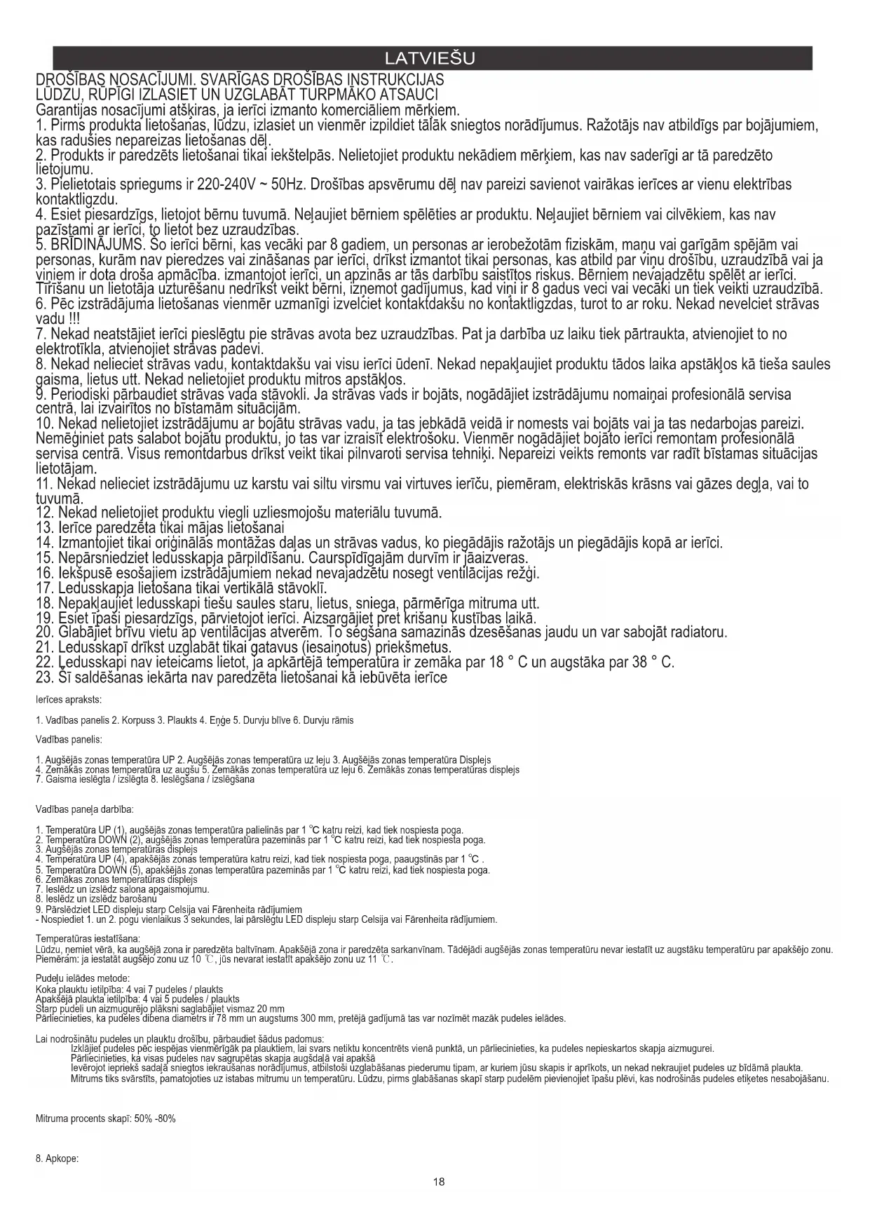 Vadības panelis:19 Dzesēšanas līdzeklis: R600a / 23g Klimata klase: ST Tilpums: 60L / 24 pudeles Ieejas spriegums: 220-240V ~ 50Hz Strāva: 0.4A Tehniskas detaļas: G) Indikatora gaisma: kad temperatūra korpusa iekšpusē ir ārpus iestatītās temperatūras diapazona, iedegsies gan augšup, gan lejup indikators. Kad temperatūra sasniegs iestatīto temperatūru, šī gaisma automātiski izslēgsies.