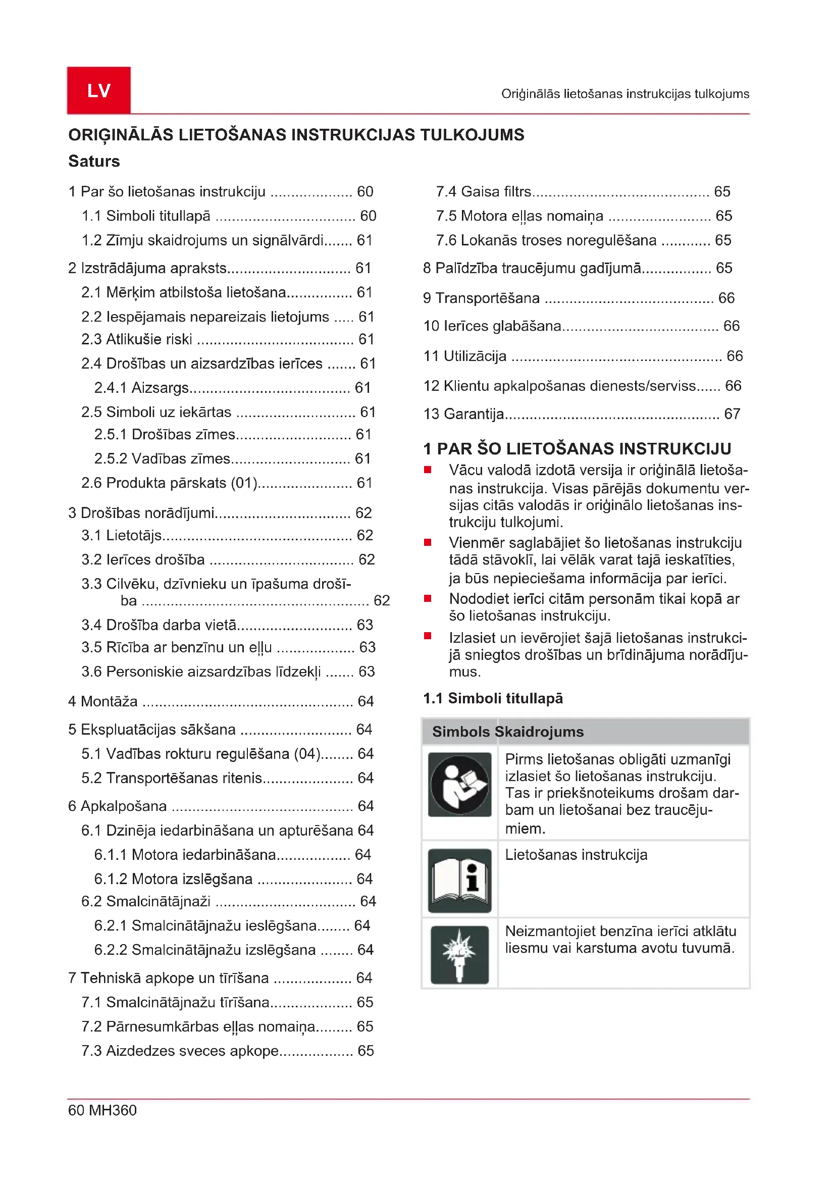 GADĪJUMĀ NORĀDĪJUMS Ja rodas bojājumi, kas nav uzskaitīti šajā tabulā, vai bojājumi, kurus nevarat novērst patstāvīgi, lūdzam sazināties ar mūsu servisa centru. Problēma Iemesls Novēršana Samazināta dzinēja jau- da. Aizsērējis gaisa filtrs Pārbaudiet un iztīriet gaisa filtru Sadegšanas problēmas Servisa centra apmeklēšana Samlcinātājnaži ir netīri Notīriet smalcinātājnažus Motoru nevar iedarbināt. Nav degvielas. Ielejiet degvielu Slikta, netīra degviela, tver- tnē ir veca degviela. Izlejiet degvielu no tvertnes un iepildiet tvertnē jaunu degvielu. Nepareiza iedarbināšanas kārtība Izpildiet iedarbināšanas kārtību pareizi Nepareizā pozīcijā akselera- tora svira Akseleratora svirai ir jābūt noregulētai pozīcijā „ZAĶIS” (MAKS.). Aizdedzes sveces defekts Skatiet motora instrukcijas.LV 66 MH360 Transportēšana Problēma Iemesls Novēršana Gaisa filtrs Skatiet motora instrukcijas. Smalcinātājnaži vairs ne- griežas Bojāta ķīļsiksna Servisa centra apmeklēšana Pārnesumkārbas bojājums Servisa centra apmeklēšana Vaļīgi smalcinātājnaži Piestipriniet kārtīgi smalcinātājnažus Lokanā trosīte ir izstaipīju- sies vai palikusi brīva. Lokanās troses regulēšana 9 TRANSPORTĒŠANA