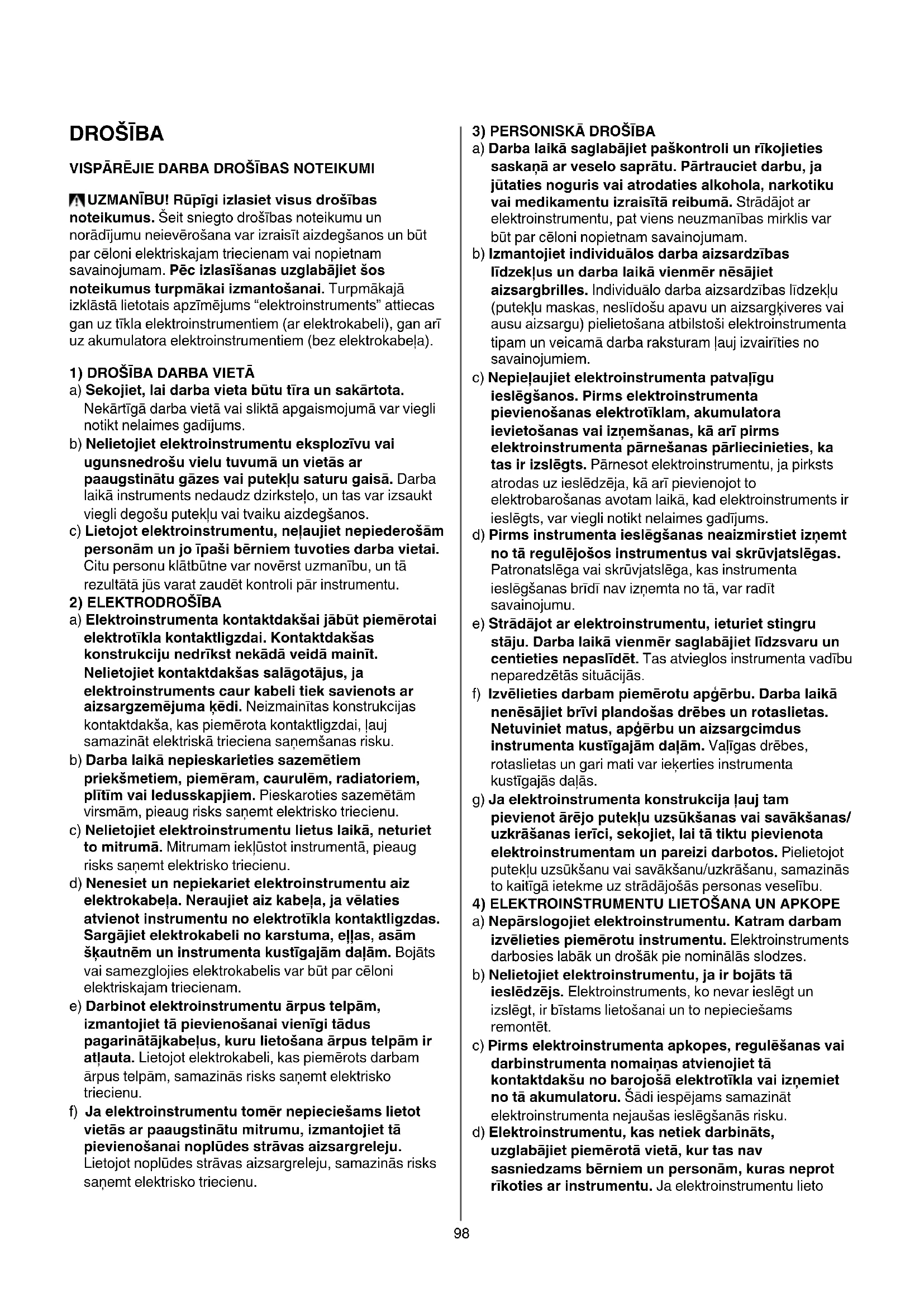 UZMANĪBU!Rūpīgiizlasietvisusdrošības noteikumus. Šeit sniegto drošības noteikumu un norādījumu neievērošana var izraisīt aizdegšanos un būt par cēloni elektriskajam triecienam vai nopietnam savainojumam. Pēcizlasīšanasuzglabājietšos noteikumusturpmākaiizmantošanai. Turpmākajā izklāstā lietotais apzīmējums “elektroinstruments” attiecas gan uz tīkla elektroinstrumentiem (ar elektrokabeli), gan arī uz akumulatora elektroinstrumentiem (bez elektrokabeļa). 1)DROŠĪBADARBAVIETĀ a) Sekojiet,laidarbavietabūtutīraunsakārtota. Nekārtīgā darba vietā vai sliktā apgaismojumā var viegli notikt nelaimes gadījums. b) Nelietojietelektroinstrumentueksplozīvuvai ugunsnedrošuvielutuvumāunvietāsar paaugstinātugāzesvaiputekļusaturugaisā. Darba laikā instruments nedaudz dzirksteļo, un tas var izsaukt viegli degošu putekļu vai tvaiku aizdegšanos. c) Lietojotelektroinstrumentu,neļaujietnepiederošām personāmunjoīpašibērniemtuvotiesdarbavietai. Citu personu klātbūtne var novērst uzmanību, un tā rezultātā jūs varat zaudēt kontroli pār instrumentu. 2)ELEKTRODROŠĪBA a) Elektroinstrumentakontaktdakšaijābūtpiemērotai elektrotīklakontaktligzdai.Kontaktdakšas konstrukcijunedrīkstnekādāveidāmainīt. Nelietojietkontaktdakšassalāgotājus,ja elektroinstruments caur kabeli tiek savienots ar aizsargzemējumaķēdi. Neizmainītas konstrukcijas kontaktdakša, kas piemērota kontaktligzdai, ļauj samazināt elektriskā trieciena saņemšanas risku. b) Darbalaikānepieskarietiessazemētiem priekšmetiem,piemēram,caurulēm,radiatoriem, plītīmvailedusskapjiem. Pieskaroties sazemētām virsmām, pieaug risks saņemt elektrisko triecienu. c) Nelietojietelektroinstrumentulietuslaikā,neturiet tomitrumā. Mitrumam iekļūstot instrumentā, pieaug risks saņemt elektrisko triecienu. d) Nenesiet un nepiekariet elektroinstrumentu aiz elektrokabeļa.Neraujietaizkabeļa,javēlaties atvienotinstrumentunoelektrotīklakontaktligzdas. Sargājietelektrokabelinokarstuma,eļļas,asām šķautnēmuninstrumentakustīgajāmdaļām. Bojāts vai samezglojies elektrokabelis var būt par cēloni elektriskajam triecienam. e) Darbinotelektroinstrumentuārpustelpām, izmantojiettāpievienošanaivienīgitādus pagarinātājkabeļus,kurulietošanaārpustelpāmir atļauta. Lietojot elektrokabeli, kas piemērots darbam ārpus telpām, samazinās risks saņemt elektrisko triecienu. f) Jaelektroinstrumentutomērnepieciešamslietot vietāsarpaaugstinātumitrumu,izmantojiettā pievienošanainoplūdesstrāvasaizsargreleju. Lietojot noplūdes strāvas aizsargreleju, samazinās risks saņemt elektrisko triecienu.