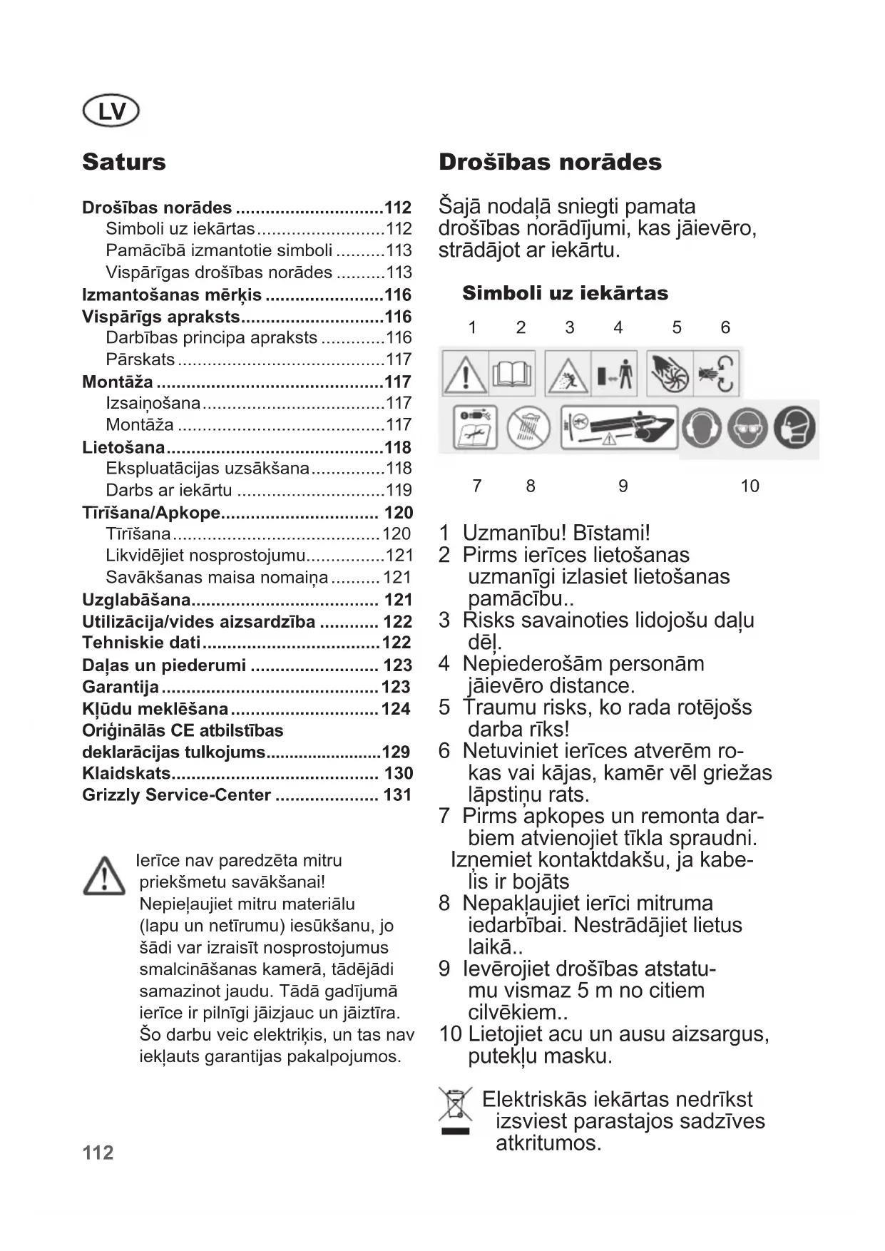 - Lietojiet acu un ausu aizsargus, putekļu masku. Elektriskās iekārtas nedrīkst izsviest parastajos sadzīves atkritumos. Saturs Drošības norādes p. 112