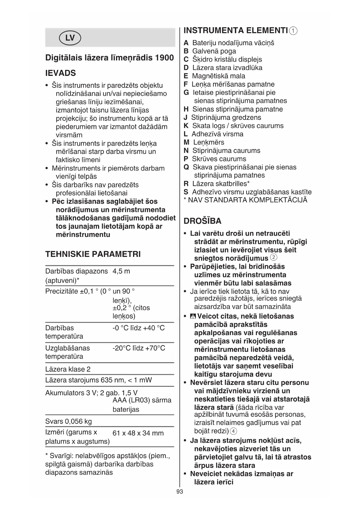 - Pēc izlasīšanas saglabājiet šos norādījumus un mērinstrumenta tālāknodošanas gadījumā nododiet tos jaunajam lietotājam kopā ar mērinstrumentu TEHNISKIE PARAMETRI Darbības diapazons (aptuveni)* 4,5 m Precizitāte ±0,1 ° (0 ° un 90 ° leņķī), ±0,2 ° (citos leņķos) Darbības temperatūra -0 °C līdz +40 °C Uzglabāšanas temperatūra -20°C līdz +70°C Lāzera klase 2 Lāzera starojums 635 nm, < 1 mW Akumulators 3 V; 2 gab. 1,5 V AAA (LR03) sārma baterijas Svars 0,056 kg Izmēri (garums x platums x augstums) 61 x 48 x 34 mm