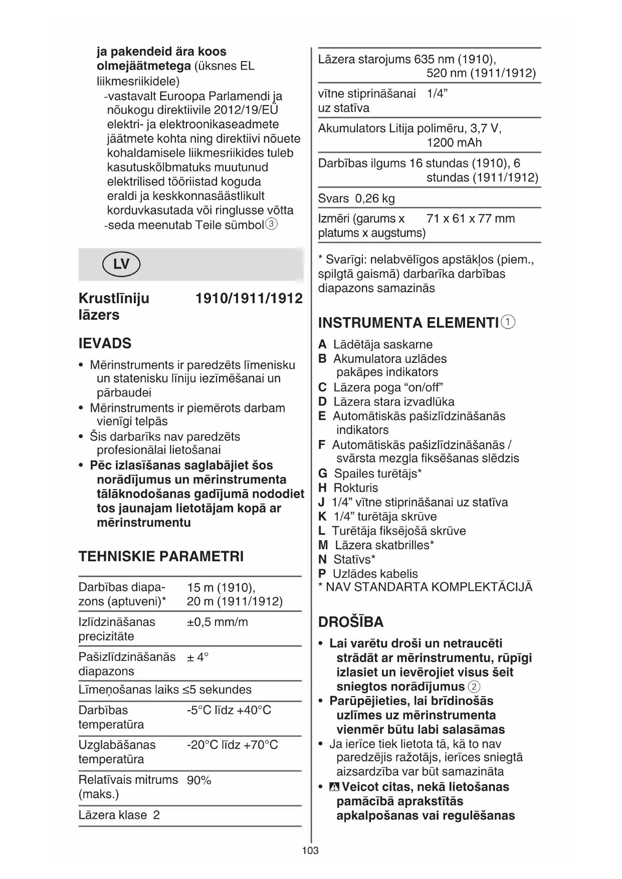 - Pēc izlasīšanas saglabājiet šos norādījumus un mērinstrumenta tālāknodošanas gadījumā nododiet tos jaunajam lietotājam kopā ar mērinstrumentu TEHNISKIE PARAMETRI Darbības diapa- zons (aptuveni)* 15 m (1910), 20 m (1911/1912) Izlīdzināšanas precizitāte ±0,5 mm/m Pašizlīdzināšanās diapazons ± 4° Līmeņošanas laiks ≤5 sekundes Darbības temperatūra -5°C līdz +40°C Uzglabāšanas temperatūra -20°C līdz +70°C Relatīvais mitrums (maks.) 90% Lāzera klase 2104 ! izlasiet un ievērojiet instrukciju, kas piegādāta kopā ar uzlādes ierīci vai elektroenerģijas padeves ierīci - izmantojiet tikai tādu uzlādes ierīci vai elektroenerģijas padeves ierīci, kuras izejas spriegums ir 5V un izejas strāva ≥0,5 A - pieslēdziet uzlādes kabeli P uzlādes vai elektroenerģijas padeves ierīcei (nav standarta komplektācijā) un lādētāja saskarnē A - indikators B mirgo SARKANĀ krāsā, norādot, ka notiek akumulatora uzlāde un pašreizējais akumulatora uzlādes līmenis ļauj lietot mērinstrumentu 30 minūtes vai mazāk - indikators B mirgo DZELTENĀ krāsā, norādot, ka notiek akumulatora uzlāde un pašreizējais akumulatora uzlādes līmenis ļauj lietot mērinstrumentu vairāk nekā 30 minūtes - indikators B mirgo ZAĻĀ krāsā, norādot, ka akumulatora uzlādes līmenis ir vairāk nekā 90% - indikators B ieslēdzas ZAĻŠ, kad akumulators ir pilnībā uzlādēts
