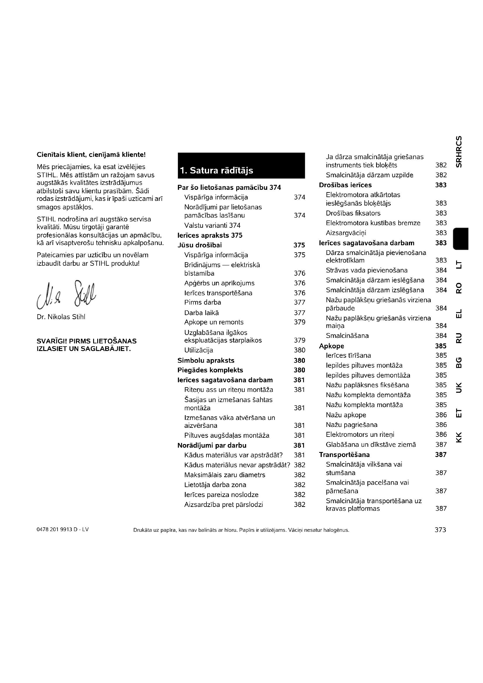 SRHRCSLV 0478 201 9913 D - LV LTROELRUBGUKETKK Cienītais klient, cienījamā kliente! Mēs priecājamies, ka esat izvēlējies STIHL. Mēs attīstām un ražojam savus augstākās kvalitātes izstrādājumus atbilstoši savu klientu prasībām. Šādi rodas izstrādājumi, kas ir īpaši uzticami arī smagos apstākļos. STIHL nodrošina arī augstāko servisa kvalitāti. Mūsu tirgotāji garantē profesionālas konsultācijas un apmācību, kā arī visaptverošu tehnisku apkalpošanu. Pateicamies par uzticību un novēlam izbaudīt darbu ar STIHL produktu! Dr. Nikolas Stihl