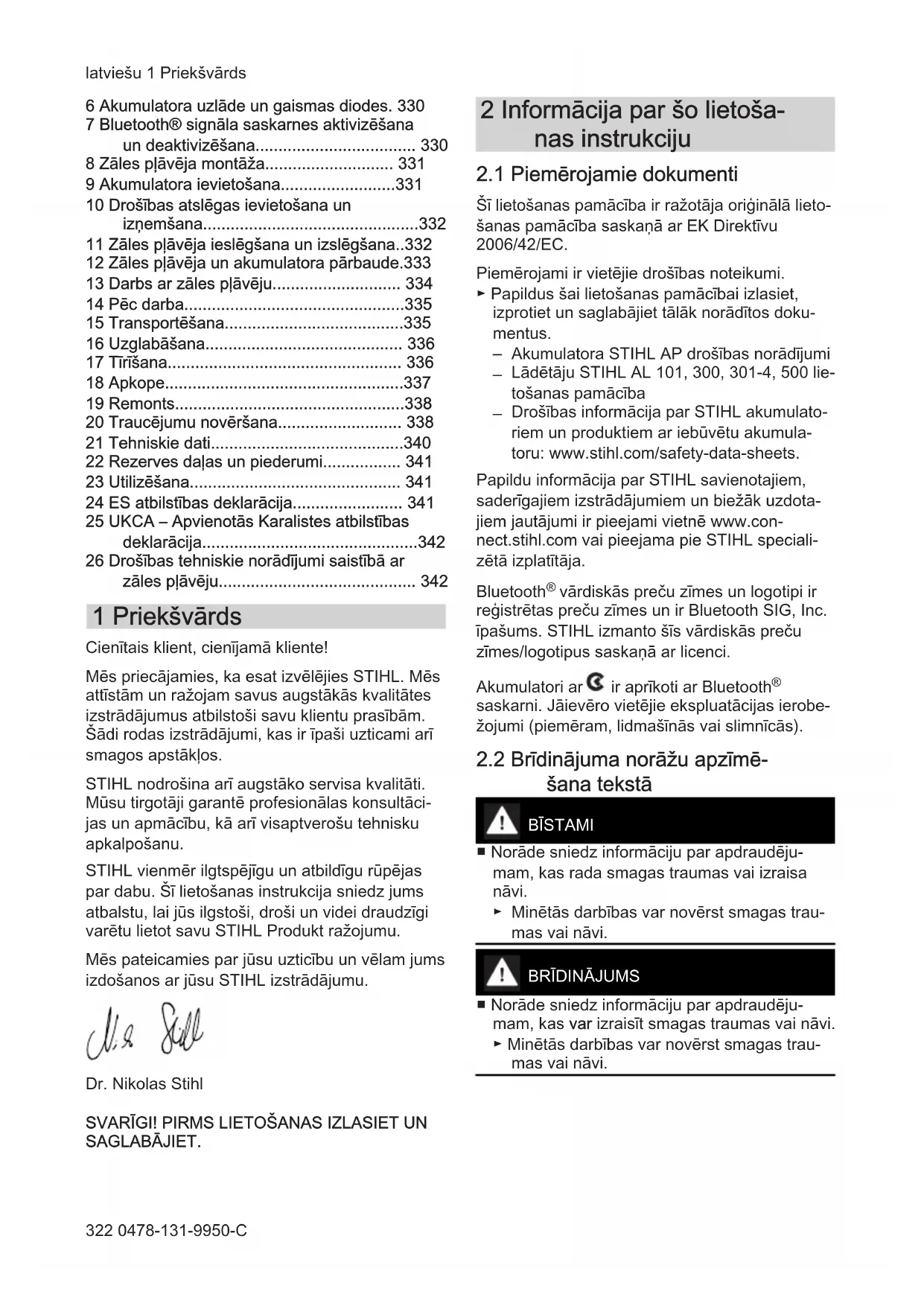 - 26 Drošības tehniskie norādījumi saistībā ar zāles pļāvēju 1 Priekšvārds Cienītais klient, cienījamā kliente! Mēs priecājamies, ka esat izvēlējies STIHL. Mēs attīstām un ražojam savus augstākās kvalitātes izstrādājumus atbilstoši savu klientu prasībām. Šādi rodas izstrādājumi, kas ir īpaši uzticami arī smagos apstākļos. STIHL nodrošina arī augstāko servisa kvalitāti. Mūsu tirgotāji garantē profesionālas konsultāci‐ jas un apmācību, kā arī visaptverošu tehnisku apkalpošanu. STIHL vienmēr ilgtspējīgu un atbildīgu rūpējas par dabu. Šī lietošanas instrukcija sniedz jums atbalstu, lai jūs ilgstoši, droši un videi draudzīgi varētu lietot savu STIHL Produkt ražojumu. Mēs pateicamies par jūsu uzticību un vēlam jums izdošanos ar jūsu STIHL izstrādājumu. Dr. Nikolas Stihl SVARĪGI! PIRMS LIETOŠANAS IZLASIET UN SAGLABĀJIET. 2 Informācija par šo lietoša‐ nas instrukciju p. 342