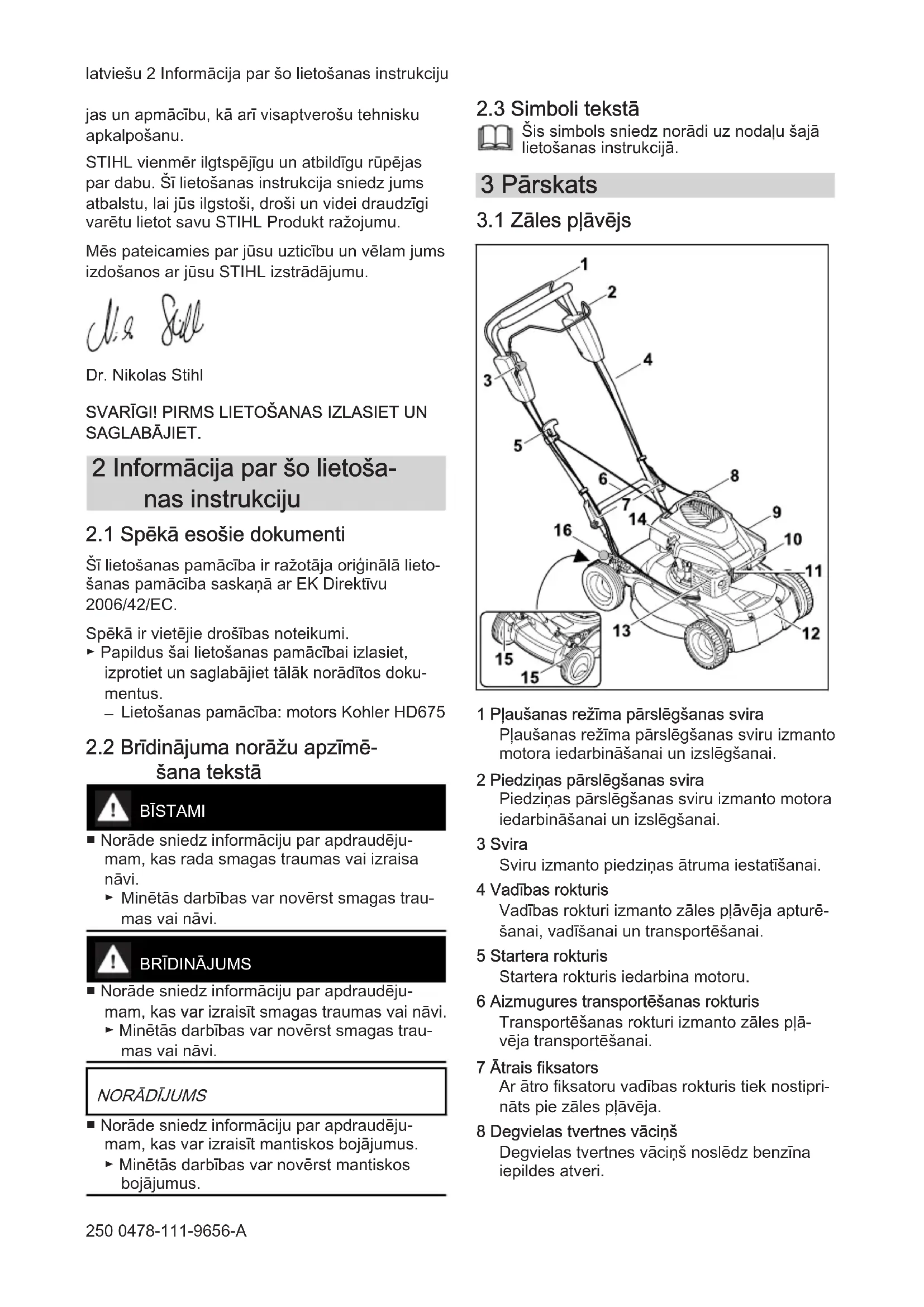 - 22 ES atbilstības deklarācija 1 Priekšvārds Cienītais klient, cienījamā kliente! Mēs priecājamies, ka esat izvēlējies STIHL. Mēs attīstām un ražojam savus augstākās kvalitātes izstrādājumus atbilstoši savu klientu prasībām. Šādi rodas izstrādājumi, kas ir īpaši uzticami arī smagos apstākļos. STIHL nodrošina arī augstāko servisa kvalitāti. Mūsu tirgotāji garantē profesionālas konsultāci‐ latviešu 0478-111-9656-A 249 © ANDREAS STIHL AG & Co. KG 2022 0478-111-9656-A. VA2.B22. Iespiesta uz hloru nesaturoša, balināta papīra. Iespiedkrāsas satur augu eļļas, bet papīrs ir atkārtoti pārstrādājams. Oriģinālās lietošanas instrukcijas tulkojums 0000009472_006_LVjas un apmācību, kā arī visaptverošu tehnisku apkalpošanu. STIHL vienmēr ilgtspējīgu un atbildīgu rūpējas par dabu. Šī lietošanas instrukcija sniedz jums atbalstu, lai jūs ilgstoši, droši un videi draudzīgi varētu lietot savu STIHL Produkt ražojumu. Mēs pateicamies par jūsu uzticību un vēlam jums izdošanos ar jūsu STIHL izstrādājumu. Dr. Nikolas Stihl SVARĪGI! PIRMS LIETOŠANAS IZLASIET UN SAGLABĀJIET. 2 Informācija par šo lietoša‐ nas instrukciju p. 264