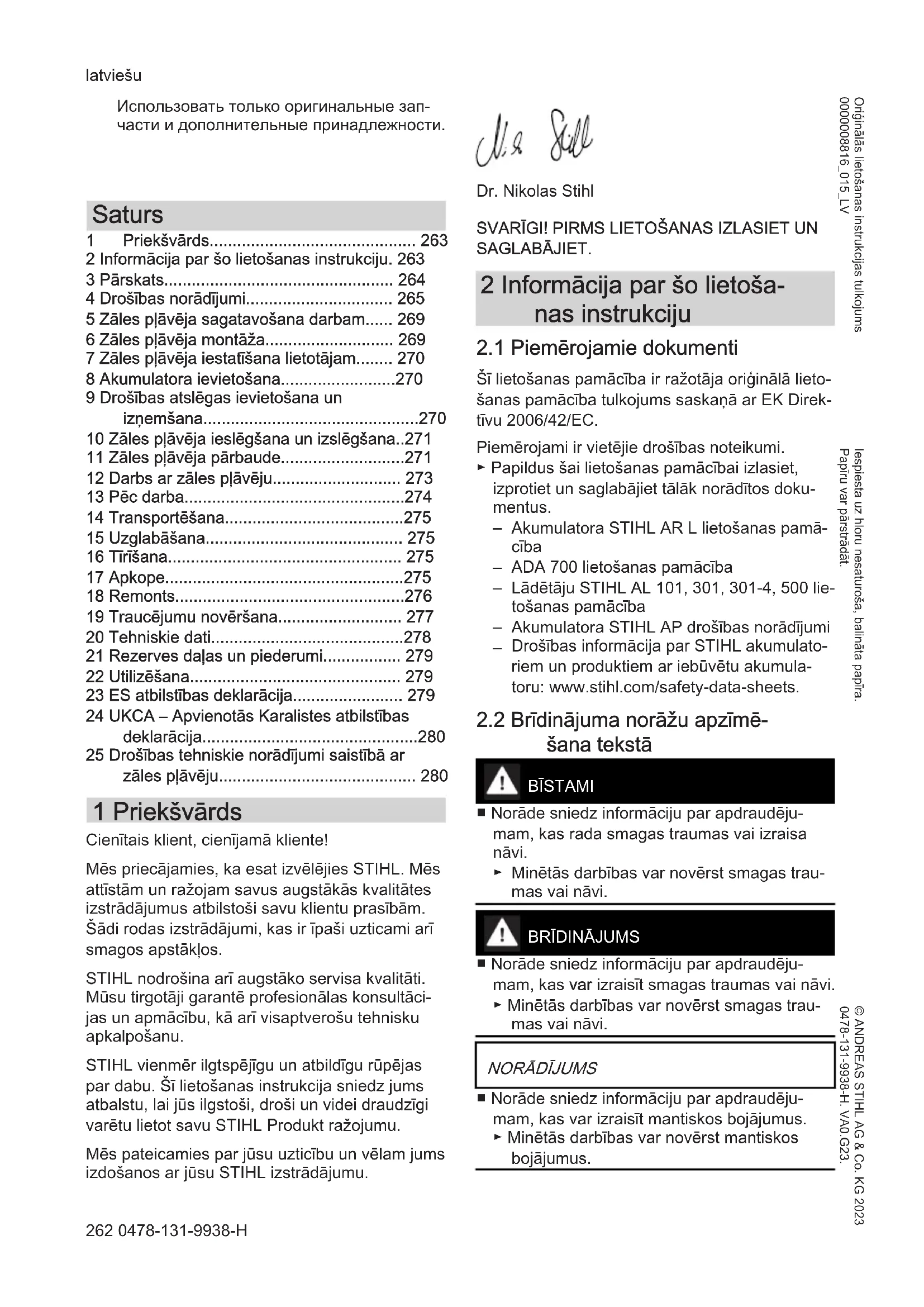 - 25 Drošības tehniskie norādījumi saistībā ar zāles pļāvēju 1 Priekšvārds Cienītais klient, cienījamā kliente! Mēs priecājamies, ka esat izvēlējies STIHL. Mēs attīstām un ražojam savus augstākās kvalitātes izstrādājumus atbilstoši savu klientu prasībām. Šādi rodas izstrādājumi, kas ir īpaši uzticami arī smagos apstākļos. STIHL nodrošina arī augstāko servisa kvalitāti. Mūsu tirgotāji garantē profesionālas konsultāci‐ jas un apmācību, kā arī visaptverošu tehnisku apkalpošanu. STIHL vienmēr ilgtspējīgu un atbildīgu rūpējas par dabu. Šī lietošanas instrukcija sniedz jums atbalstu, lai jūs ilgstoši, droši un videi draudzīgi varētu lietot savu STIHL Produkt ražojumu. Mēs pateicamies par jūsu uzticību un vēlam jums izdošanos ar jūsu STIHL izstrādājumu. Dr. Nikolas Stihl SVARĪGI! PIRMS LIETOŠANAS IZLASIET UN SAGLABĀJIET. 2 Informācija par šo lietoša‐ nas instrukciju p. 280