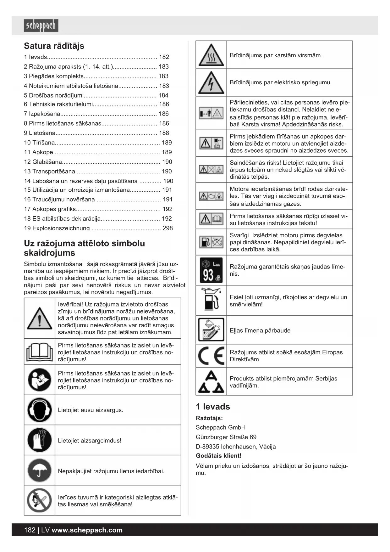- 19 Explosionszeichnung Uz ražojuma attēloto simbolu skaidrojums Simbolu izmantošanai šajā rokasgrāmatā jāvērš jūsu uz- manība uz iespējamiem riskiem. Ir precīzi jāizprot drošī- bas simboli un skaidrojumi, uz kuriem tie attiecas. Brīdi- nājumi paši par sevi nenovērš riskus un nevar aizvietot pareizos pasākumus, lai novērstu negadījumus. Ievērībai! Uz ražojuma izvietoto drošības zīmju un brīdinājuma norāžu neievērošana, kā arī drošības norādījumu un lietošanas norādījumu neievērošana var radīt smagus savainojumus līdz pat letālam iznākumam. Pirms lietošanas sākšanas izlasiet un ievē- rojiet lietošanas instrukciju un drošības no- rādījumus! Pirms lietošanas sākšanas izlasiet un ievē- rojiet lietošanas instrukciju un drošības no- rādījumus! Lietojiet ausu aizsargus. Lietojiet aizsargcimdus! Nepakļaujiet ražojumu lietus iedarbībai. Ierīces tuvumā ir kategoriski aizliegtas atklā- tas liesmas vai smēķēšana! Brīdinājums par karstām virsmām. Brīdinājums par elektrisko spriegumu. Pārliecinieties, vai citas personas ievēro pie- tiekamu drošības distanci. Nelaidiet neie- saistītās personas klāt pie ražojuma. Ievērī- bai! Karsta virsma! Apdedzināšanās risks. Pirms jebkādiem tīrīšanas un apkopes dar- biem izslēdziet motoru un atvienojiet aizde- dzes sveces spraudni no aizdedzes sveces. Saindēšanās risks! Lietojiet ražojumu tikai ārpus telpām un nekad slēgtās vai slikti vē- dinātās telpās. Motora iedarbināšanas brīdī rodas dzirkste- les. Tās var viegli aizdedzināt tuvumā eso- šās aizdedzināmās gāzes. Pirms lietošanas sākšanas rūpīgi izlasiet vi- su lietošanas instrukcijas tekstu! Svarīgi. Izslēdziet motoru pirms degvielas papildināšanas. Nepapildiniet degvielu ierī- ces darbības laikā. Ražojuma garantētais skaņas jaudas līme- nis. Esiet ļoti uzmanīgi, rīkojoties ar degvielu un smērvielām! Eļļas līmeņa pārbaude Ražojums atbilst spēkā esošajām Eiropas Direktīvām. Produkts atbilst piemērojamām Serbijas vadlīnijām. 1 Ievads Ražotājs: Scheppach GmbH Günzburger Straße 69 D-89335 Ichenhausen, Vācija Godātais klient! Vēlam prieku un izdošanos, strādājot ar šo jauno ražoju- mu. 182 | LV www.scheppach.comNorāde: Šī ražojuma ražotājs saskaņā ar spēkā esošo likumu par ražotāja atbildību par ražojumu kvalitāti nav atbildīgs par zaudējumiem, kas rodas šim ražojumam vai šī ražojuma dēļ saistībā ar: p. 298