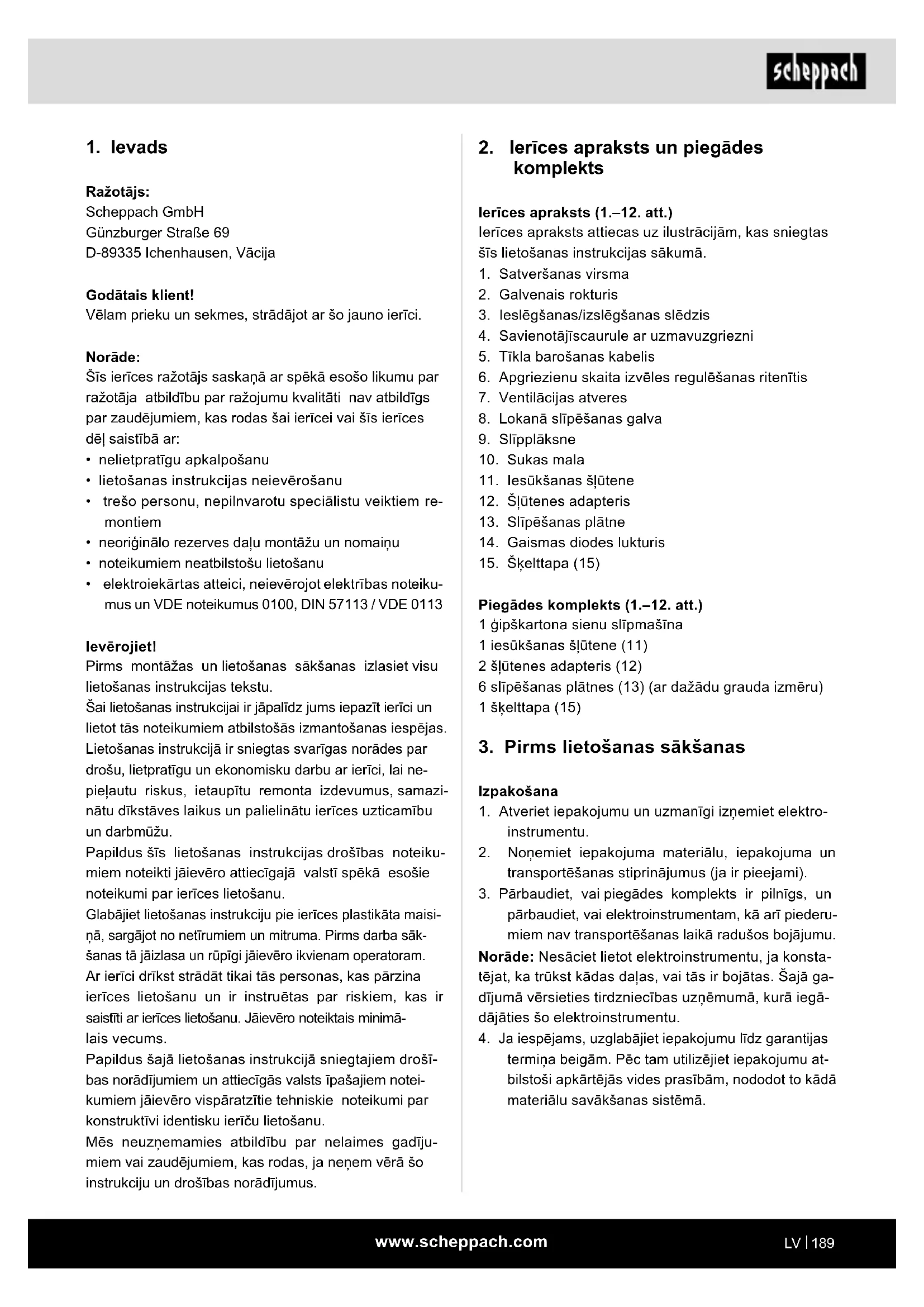 - elektroiekārtas atteici, neievērojot elektrības noteiku- mus un VDE noteikumus 0100, DIN 57113 / VDE 0113 Ievērojiet! Pirms montāžas un lietošanas sākšanas izlasiet visu lietošanas instrukcijas tekstu. Šai lietošanas instrukcijai ir jāpalīdz jums iepazīt ierīci un lietot tās noteikumiem atbilstošās izmantošanas iespējas. Lietošanas instrukcijā ir sniegtas svarīgas norādes par drošu, lietpratīgu un ekonomisku darbu ar ierīci, lai ne- pieļautu riskus, ietaupītu remonta izdevumus, samazi- nātu dīkstāves laikus un palielinātu ierīces uzticamību un darbmūžu. Papildus šīs lietošanas instrukcijas drošības noteiku- miem noteikti jāievēro attiecīgajā valstī spēkā esošie noteikumi par ierīces lietošanu. Glabājiet lietošanas instrukciju pie ierīces plastikāta maisi- ņā, sargājot no netīrumiem un mitruma. Pirms darba sāk- šanas tā jāizlasa un rūpīgi jāievēro ikvienam operatoram. Ar ierīci drīkst strādāt tikai tās personas, kas pārzina ierīces lietošanu un ir instruētas par riskiem, kas ir saistīti ar ierīces lietošanu. Jāievēro noteiktais minimā- lais vecums. Papildus šajā lietošanas instrukcijā sniegtajiem drošī- bas norādījumiem un attiecīgās valsts īpašajiem notei- kumiem jāievēro vispāratzītie tehniskie noteikumi par konstruktīvi identisku ierīču lietošanu. Mēs neuzņemamies atbildību par nelaimes gadīju- miem vai zaudējumiem, kas rodas, ja neņem vērā šo instrukciju un drošības norādījumus.www.scheppach.com